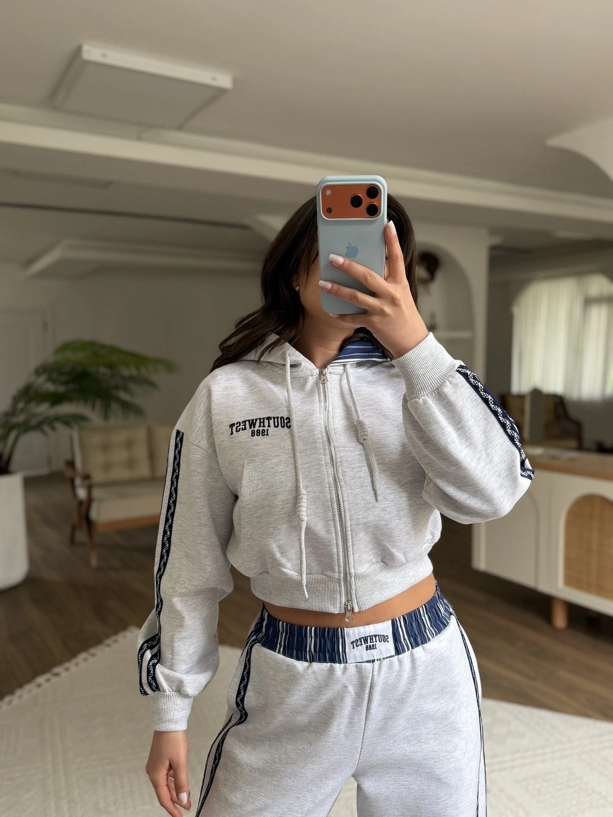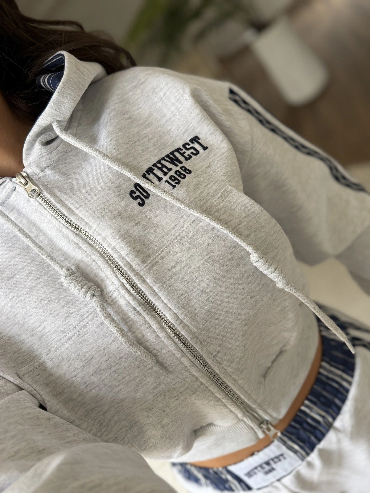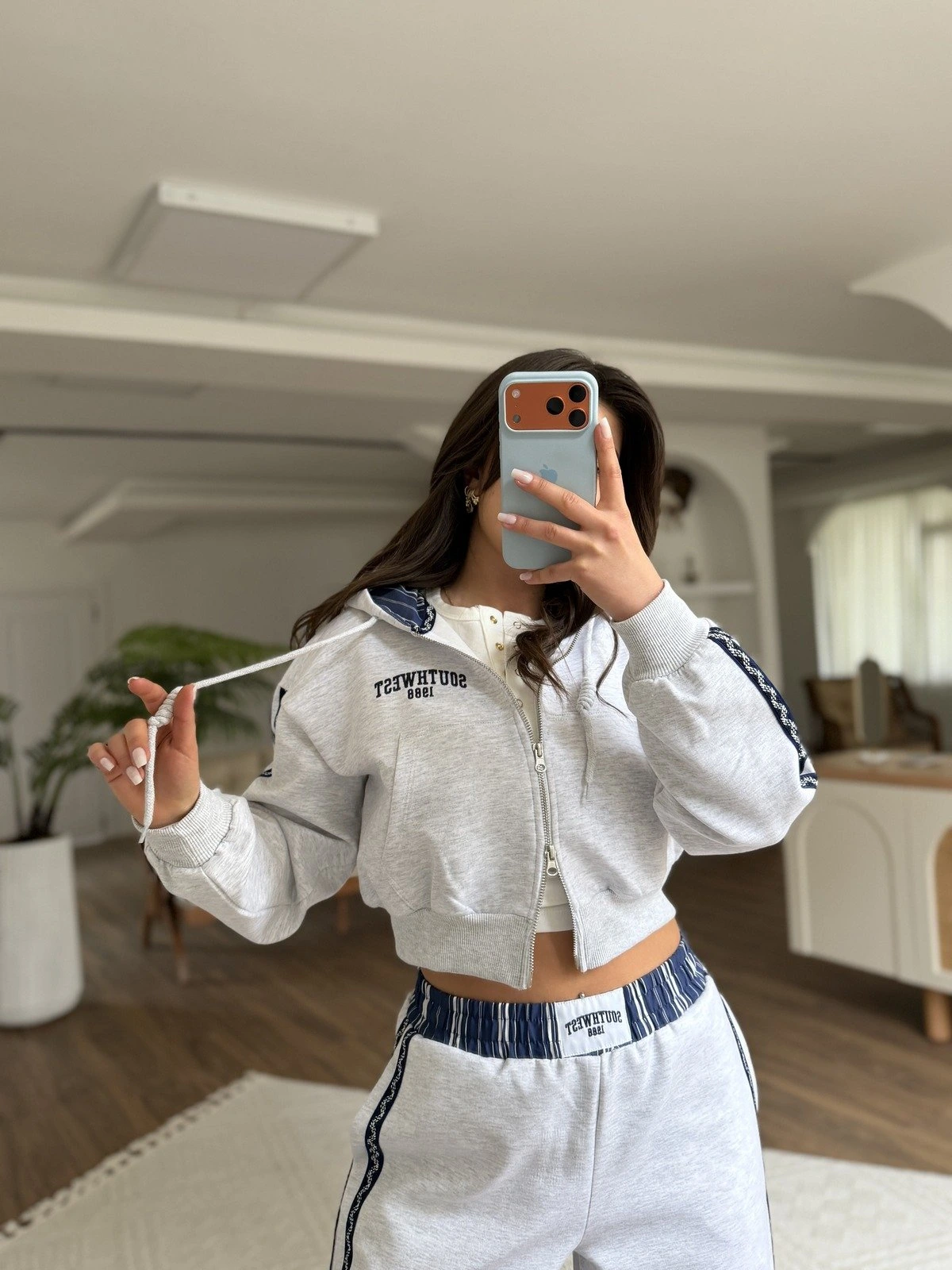 KAPÜŞONLU KOL BİYE KISA FERMUARLI SWEAT – GRİ