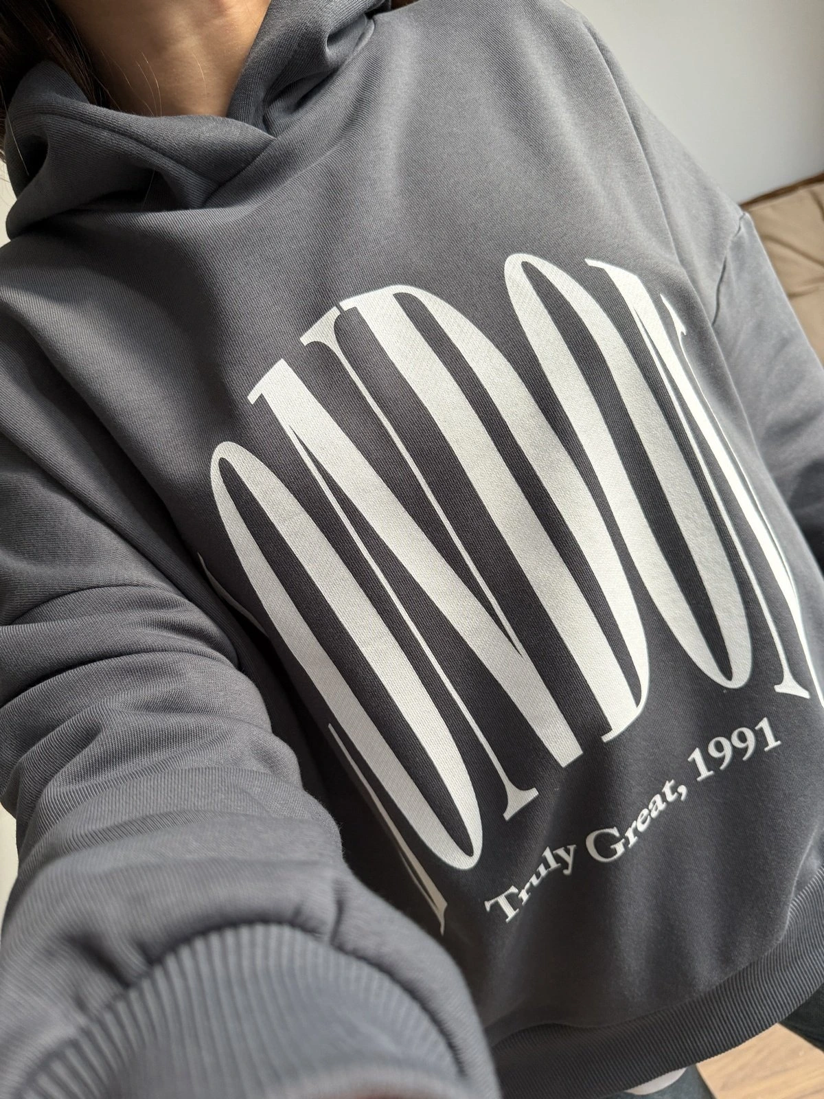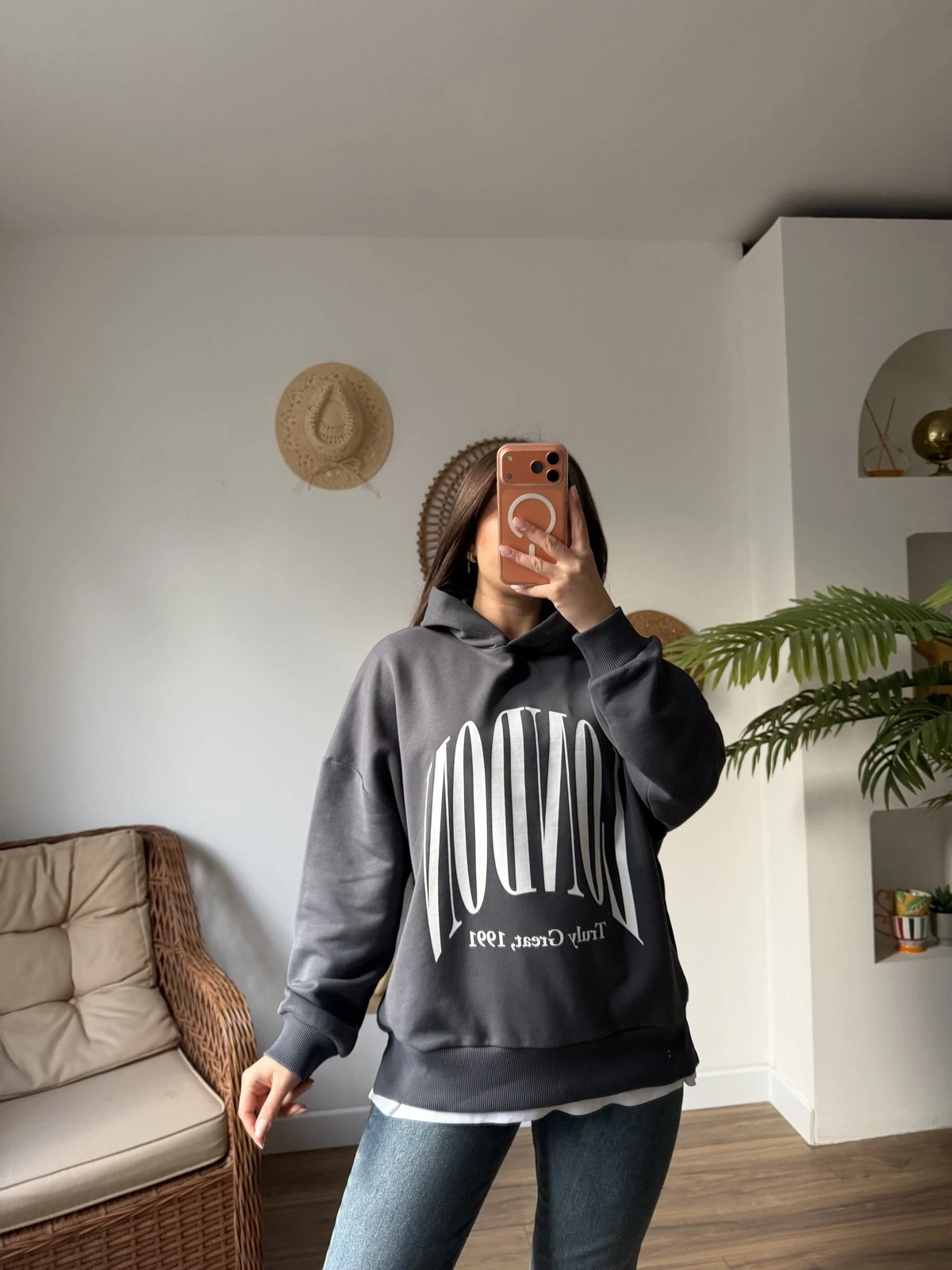 KAPÜŞONLU LONDON YAZI BASKI ETEĞİ TİŞÖRT DETAY SWEAT – ANTRASİT