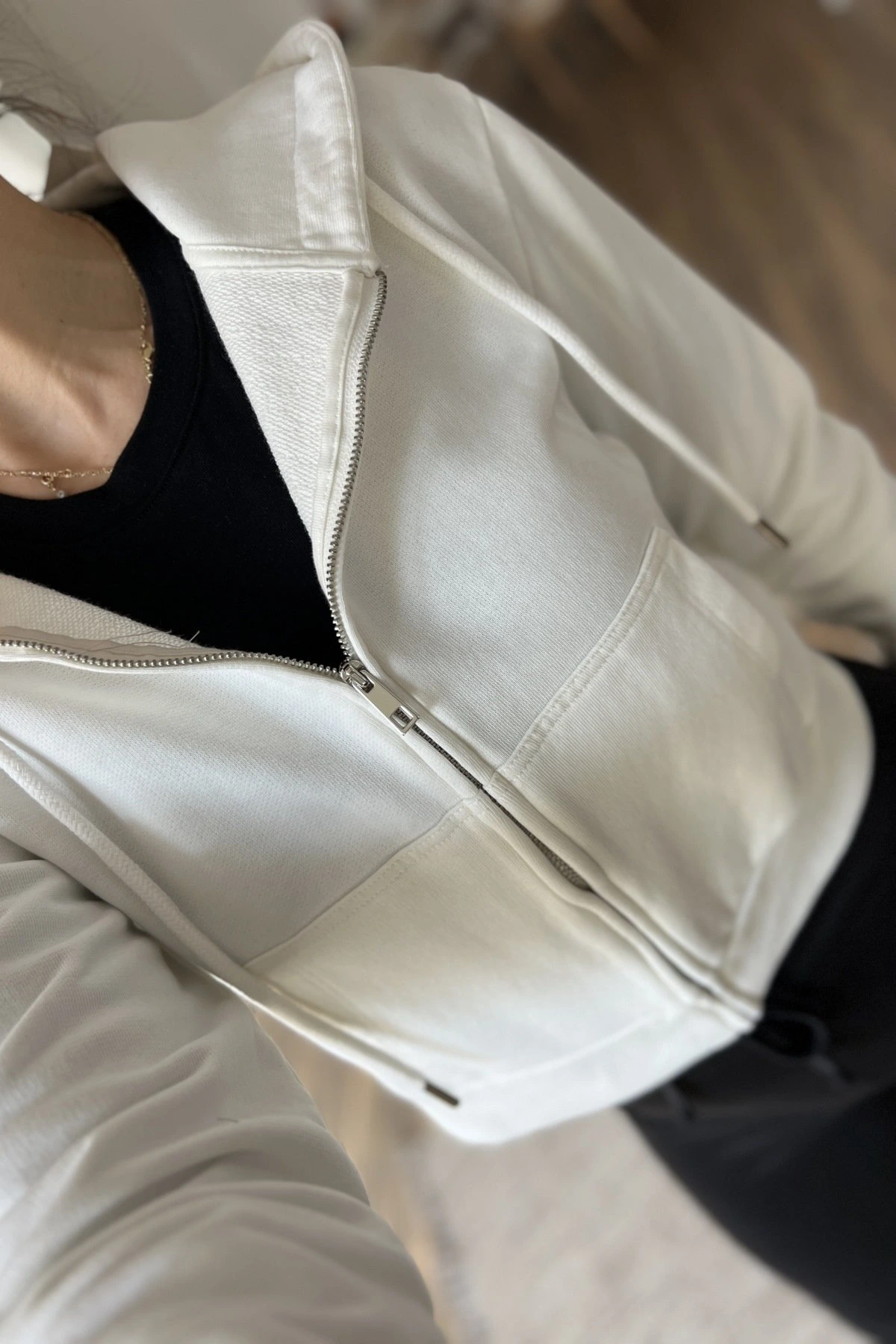 KAPÜŞONLU ÖN CEPLİ FERMUARLI KISA PAMUK SWEAT – EKRU