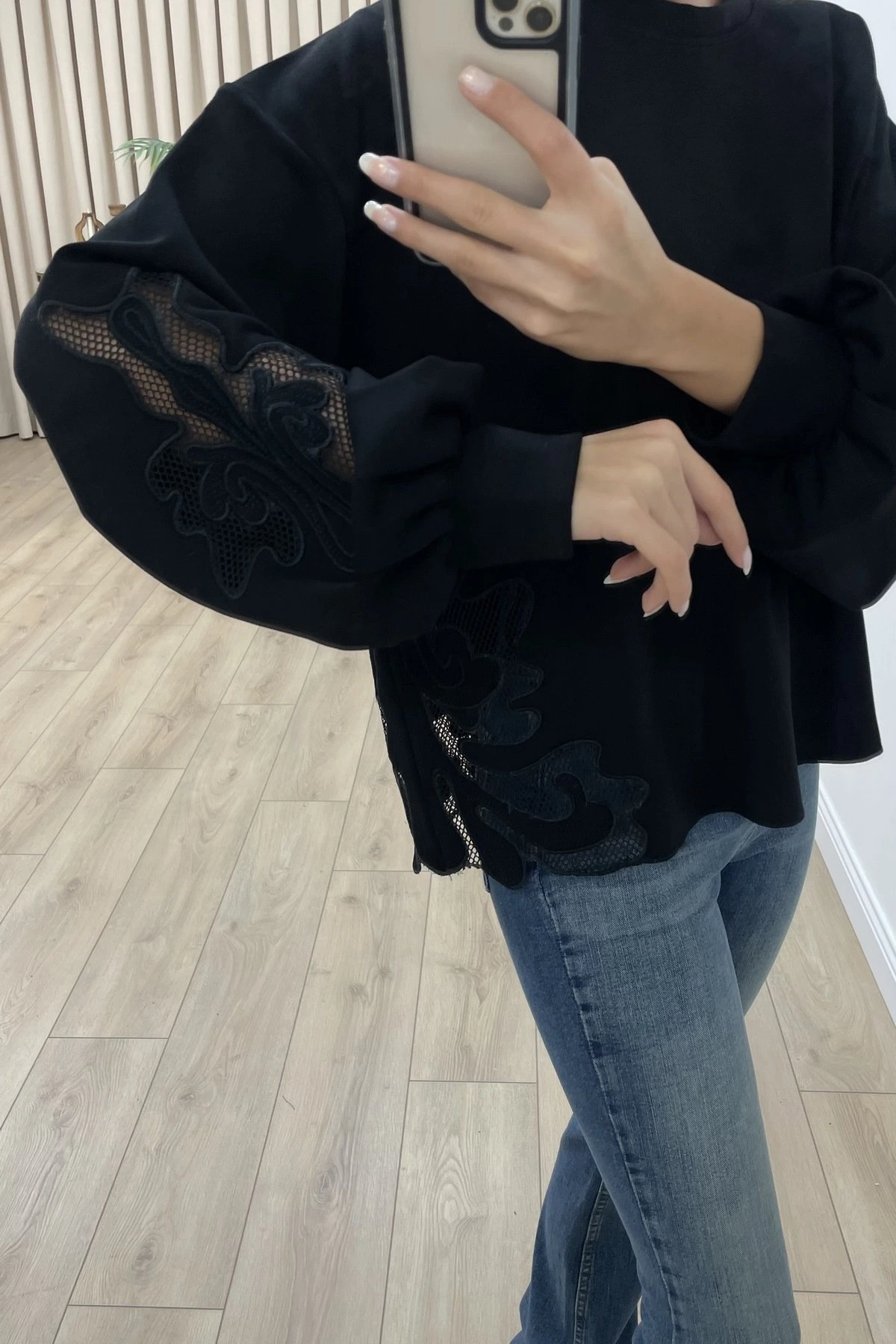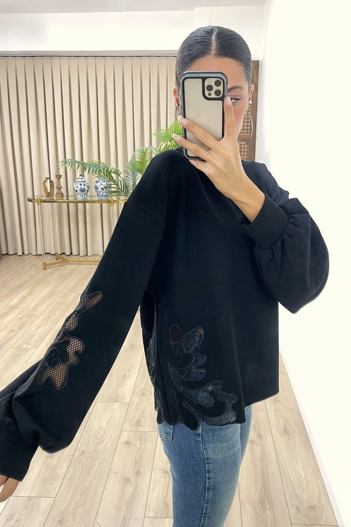 KOL VE ETEK UCU NAKIŞLI PAMUK SWEAT – SİYAH