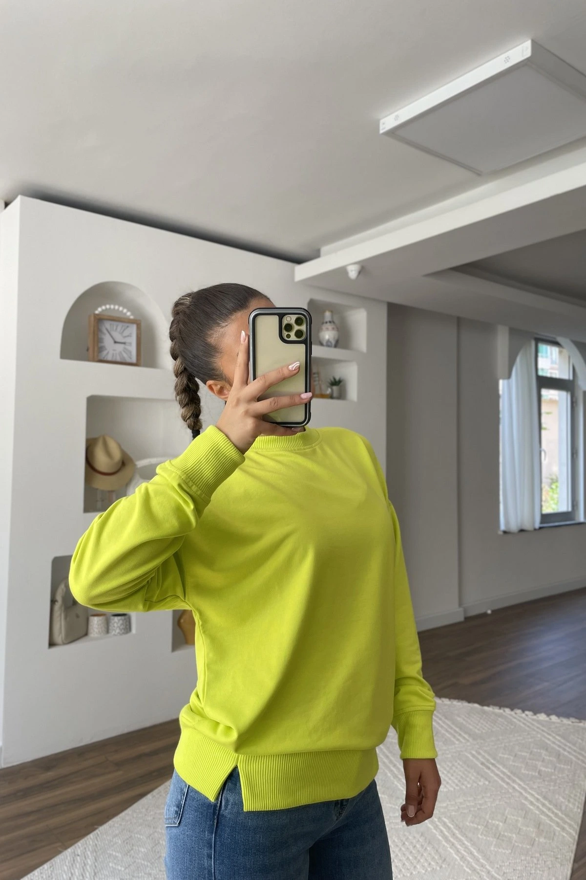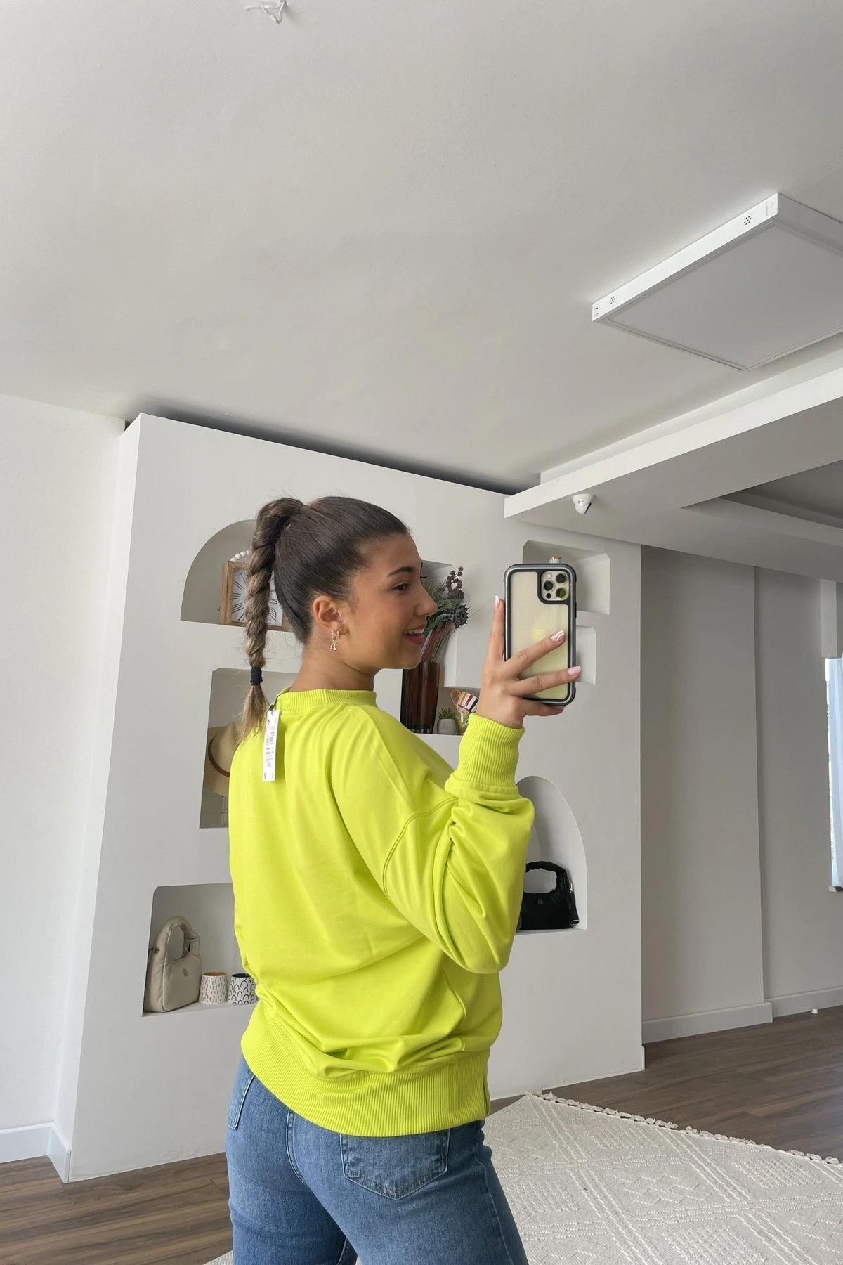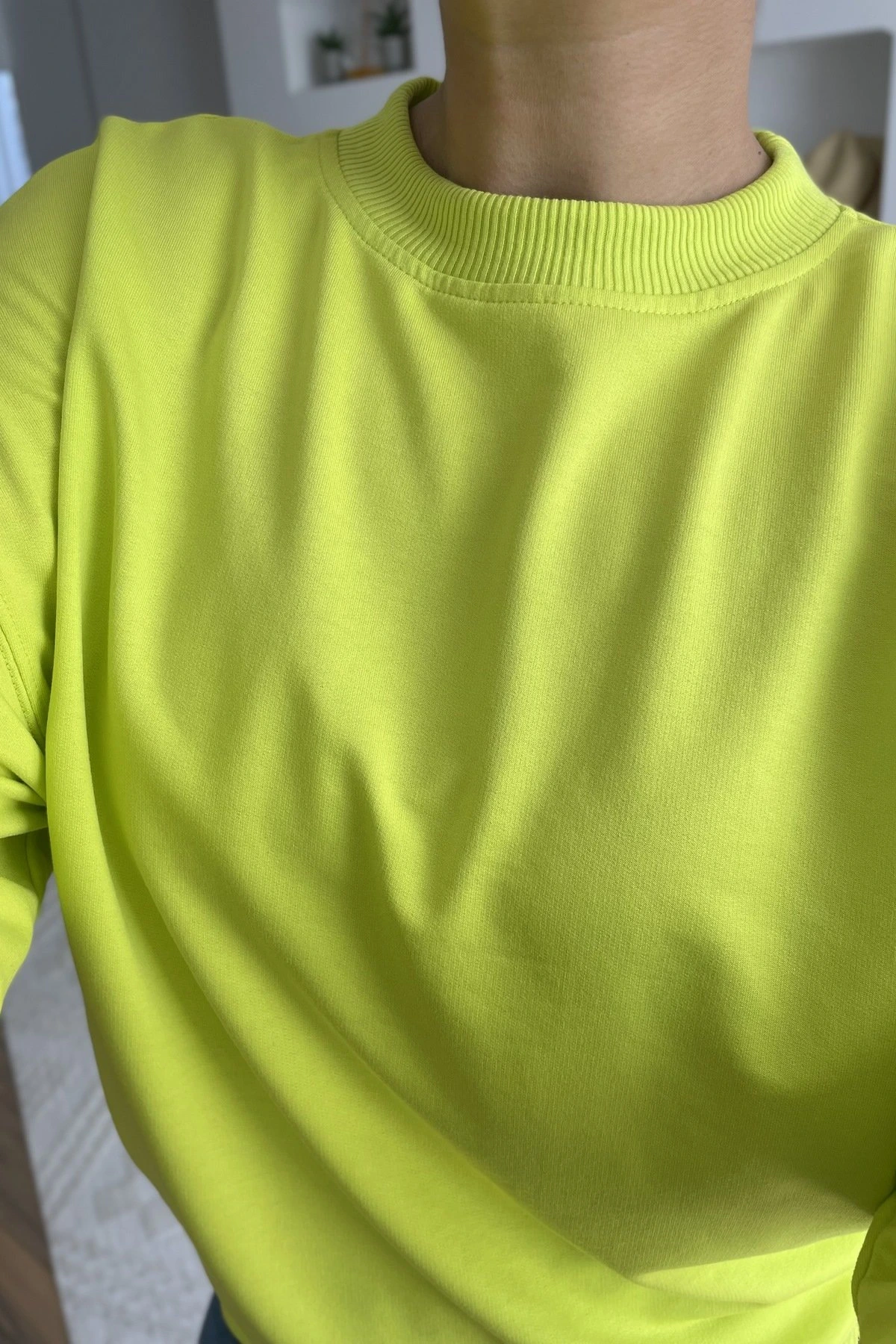 KOL VE YAKA DOKUMA BİSİKLET YAKA PAMUK SWEAT – NEON YEŞİL