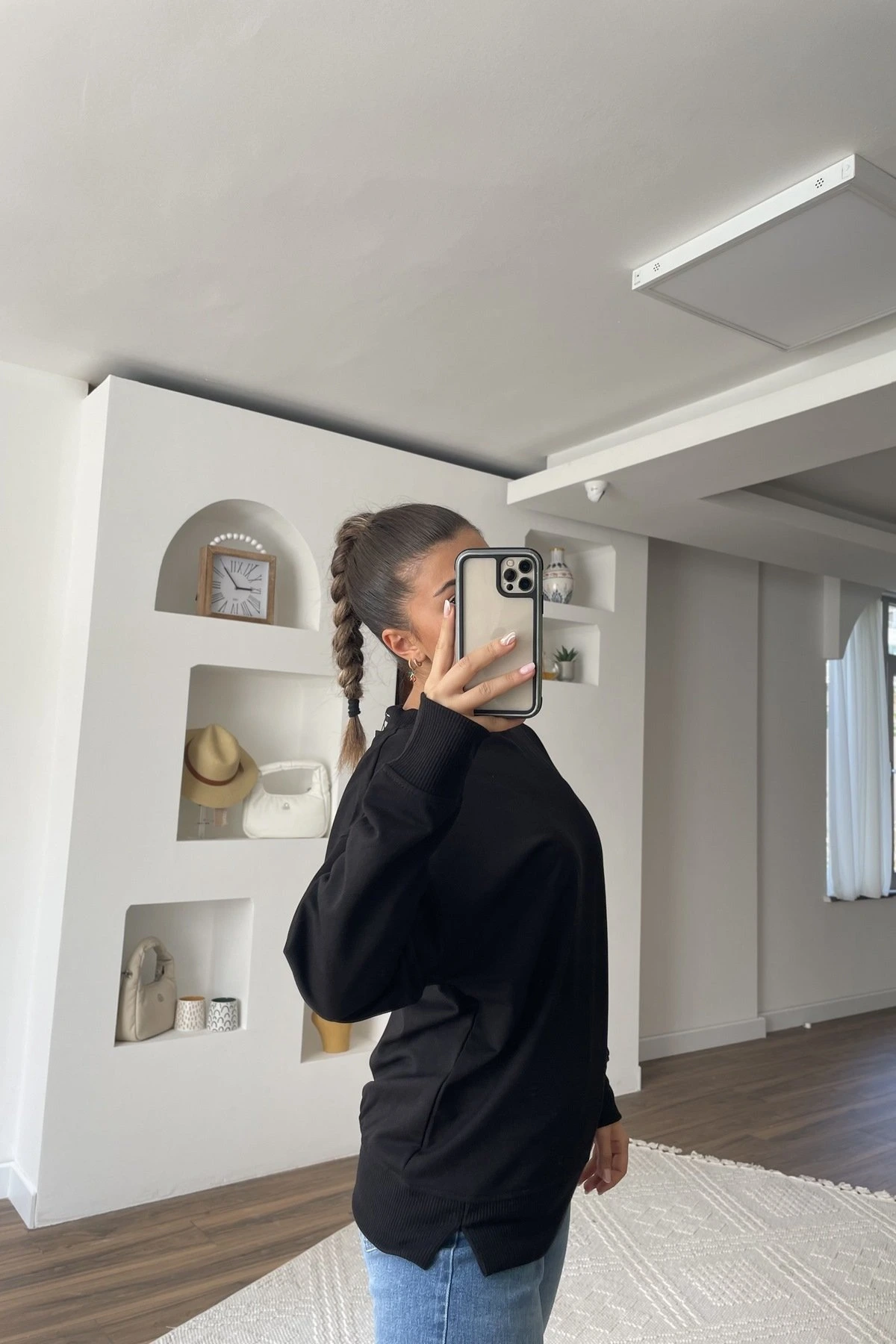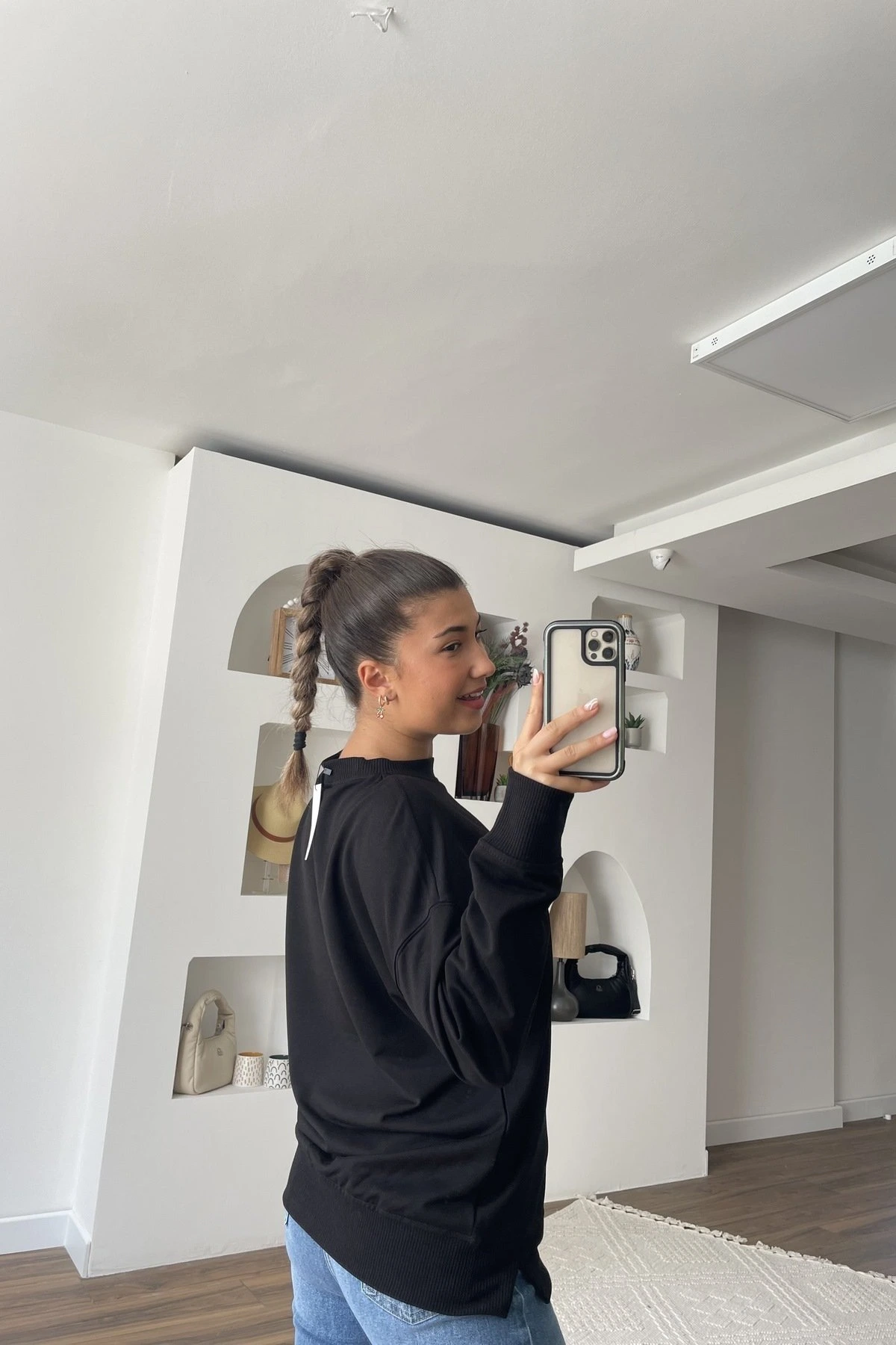 KOL VE YAKA DOKUMA BİSİKLET YAKA PAMUK SWEAT – SİYAH