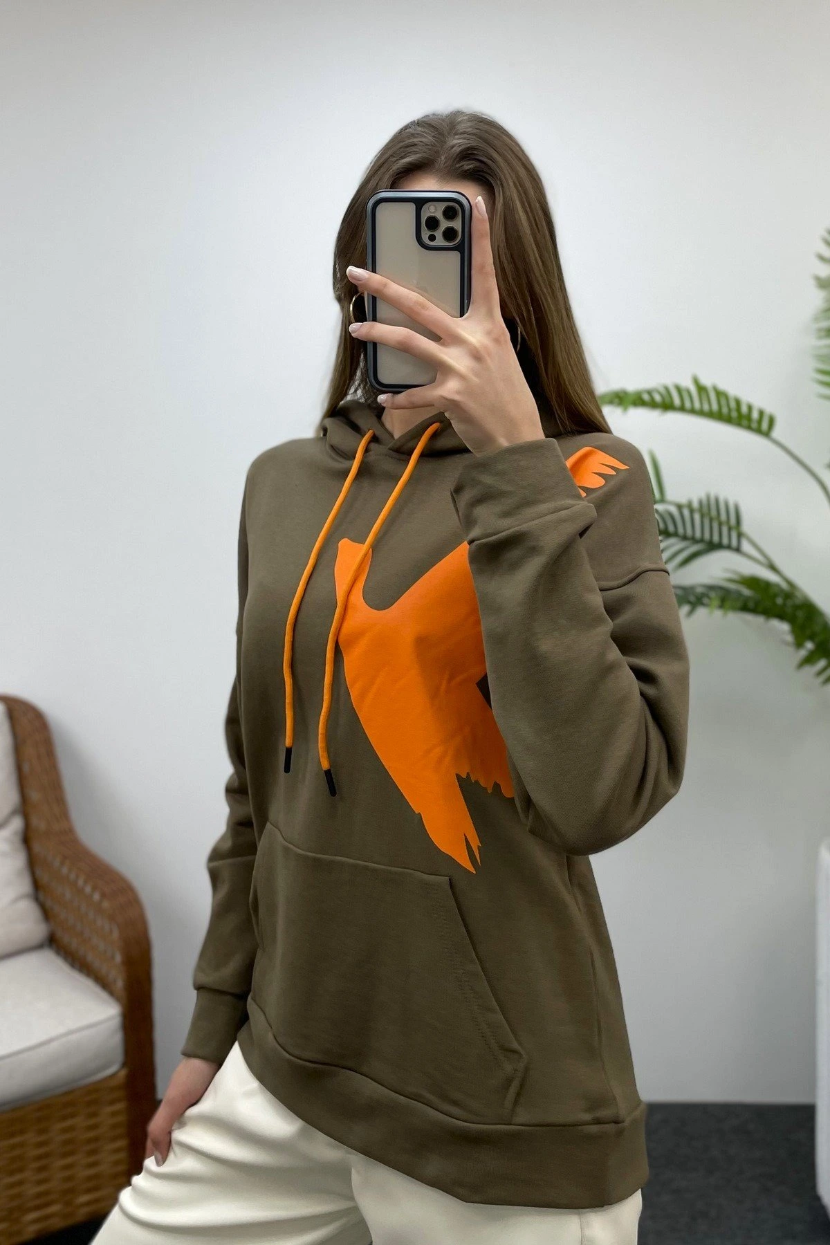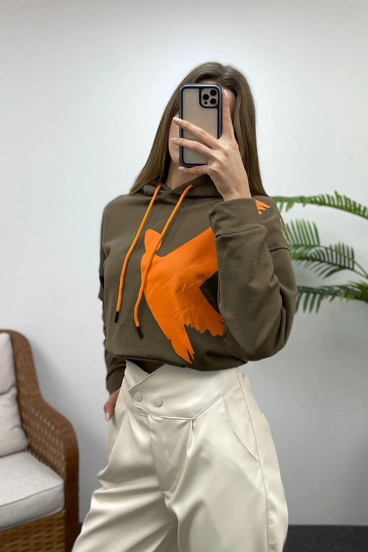 KUŞ BASKI KAPÜŞONLU KANGRU CEP SWEAT – HAKİ
