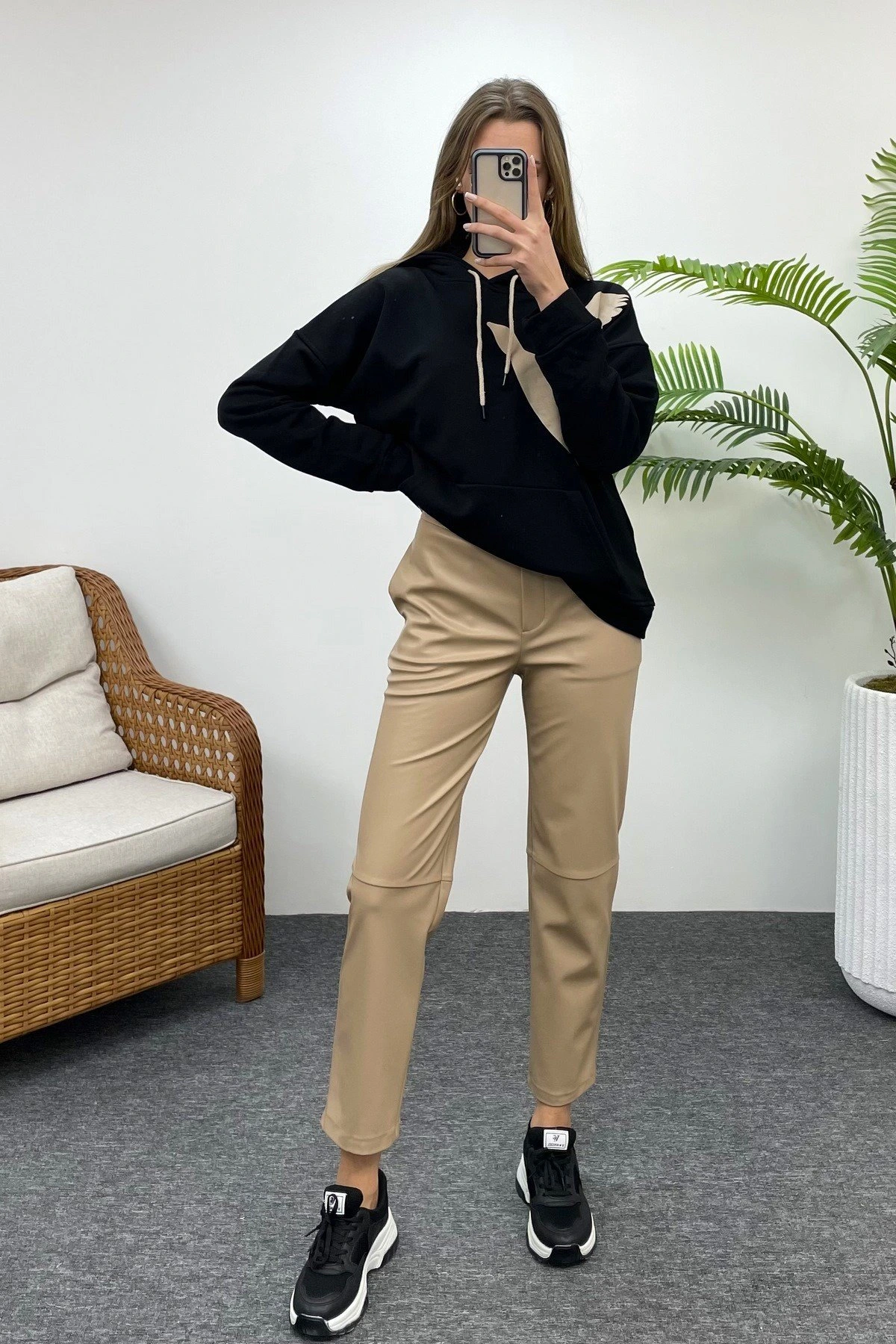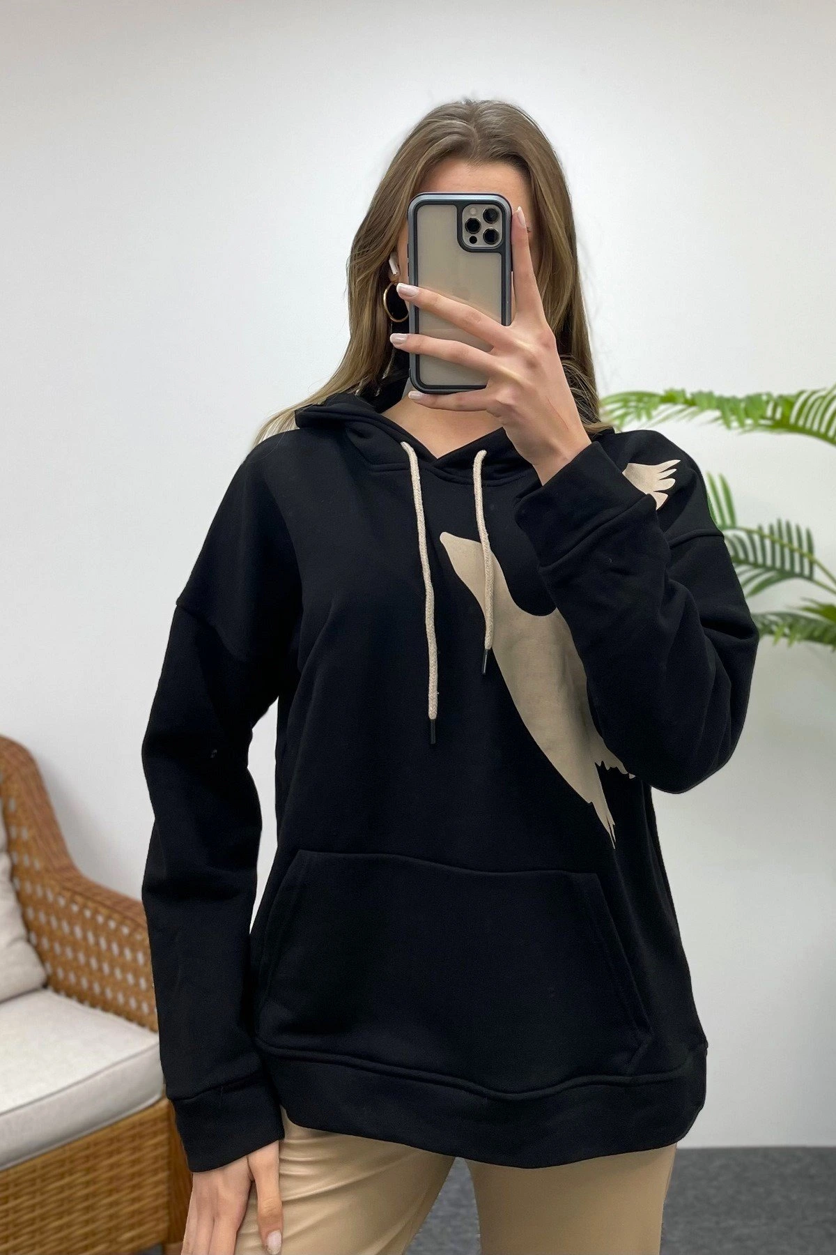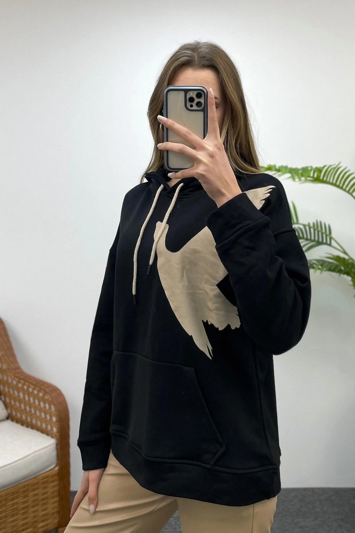 KUŞ BASKI KAPÜŞONLU KANGRU CEP SWEAT – SİYAH