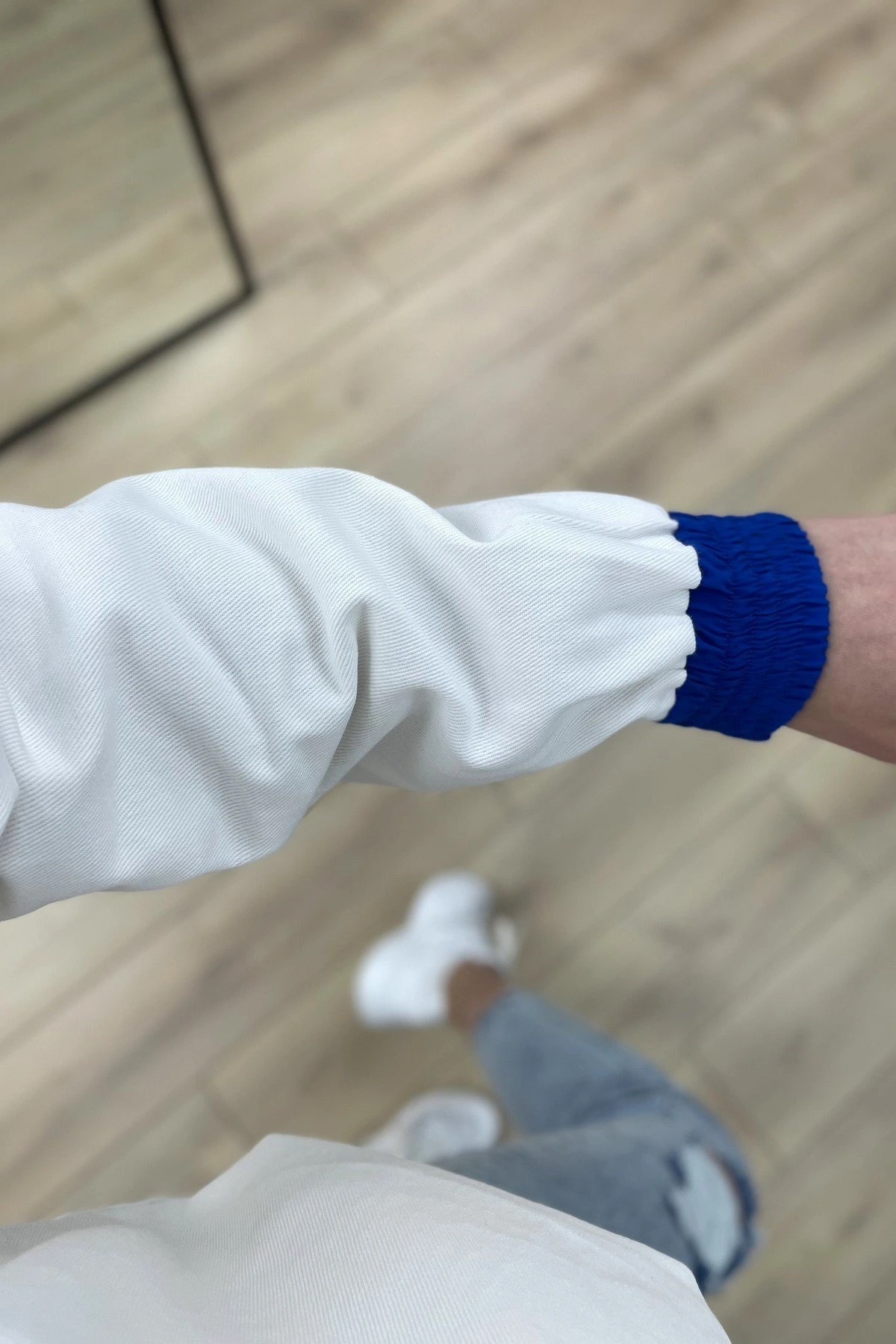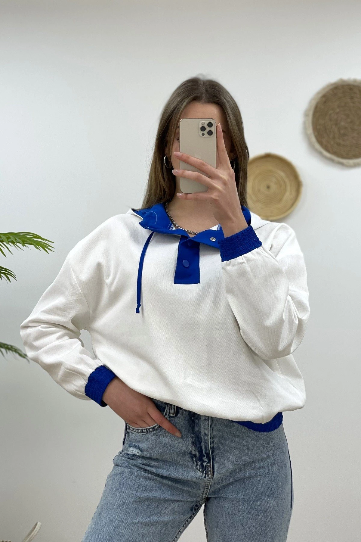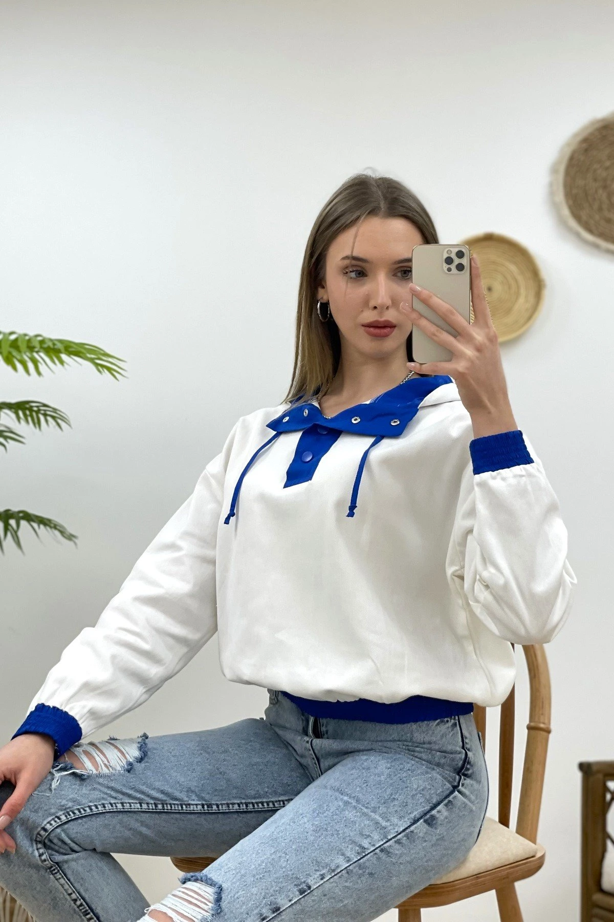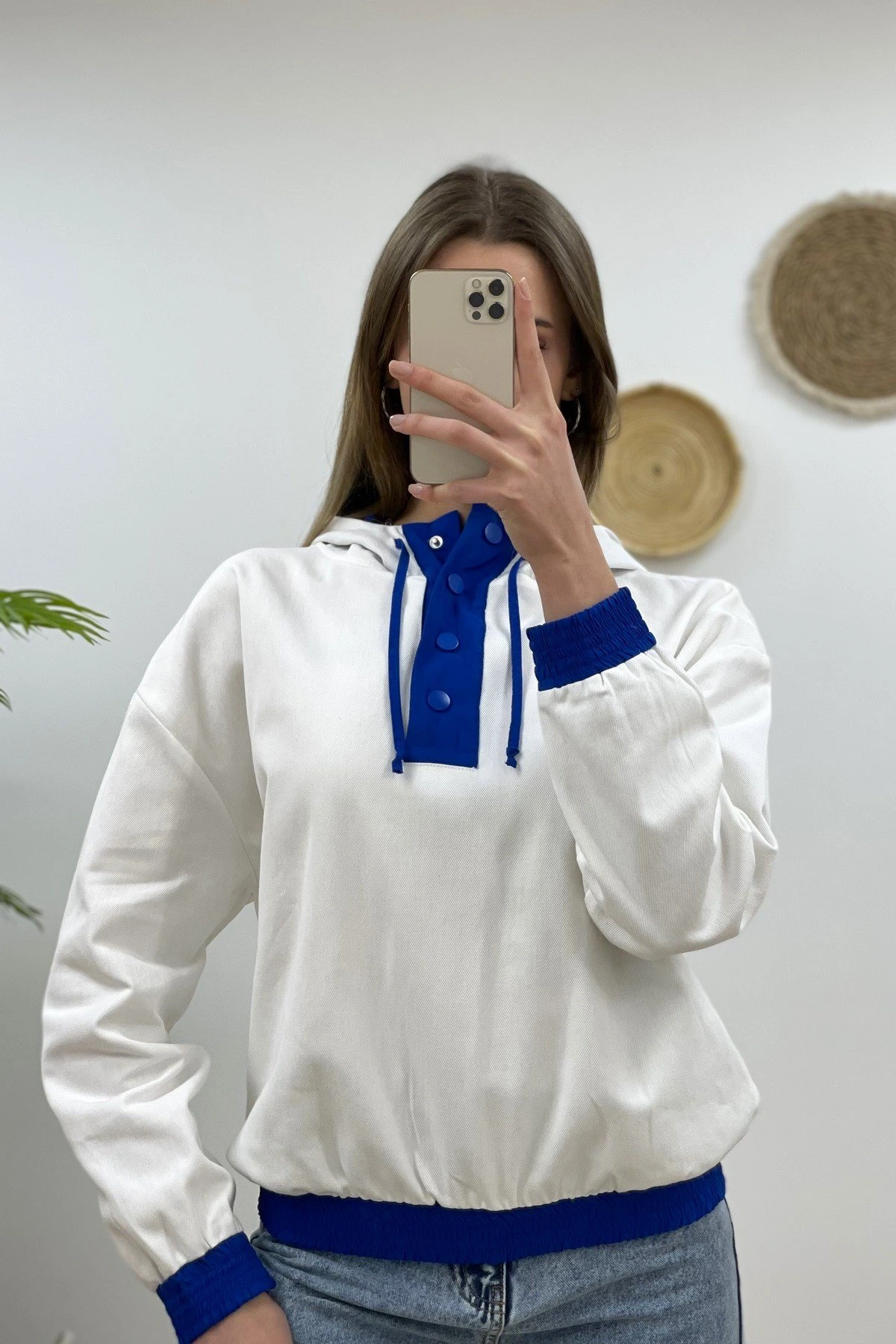 MAVİ KAPİŞONLU SWEAT – EKRU