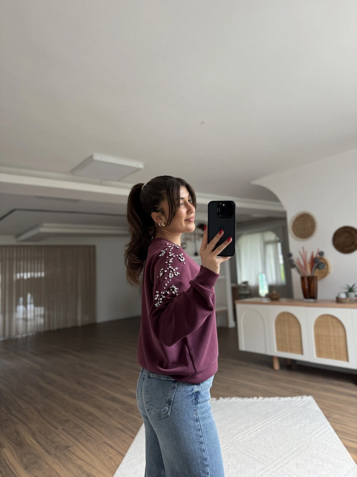 OMUZ VE ÖN DİKME TAŞ MODAL SWEAT – BORDO