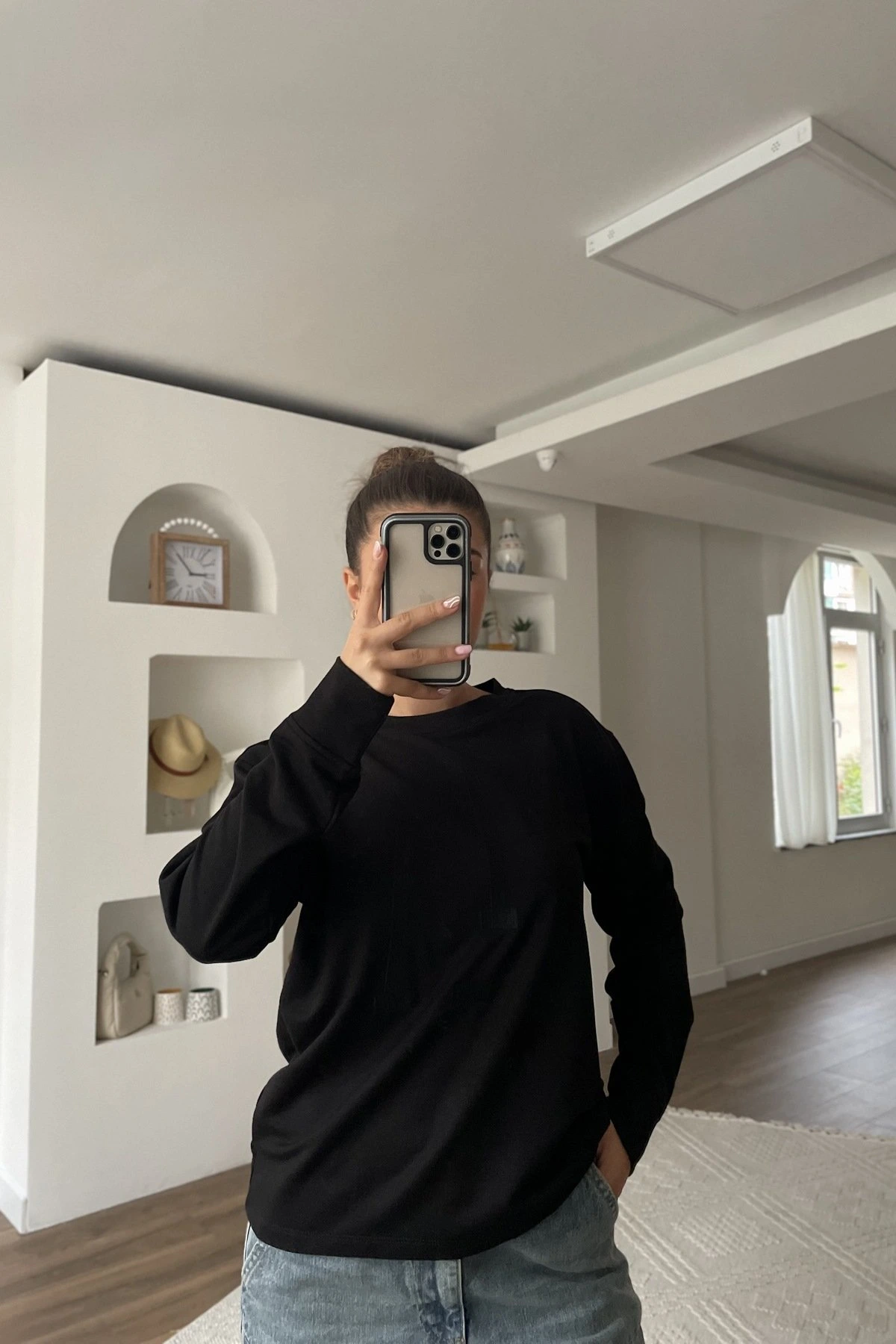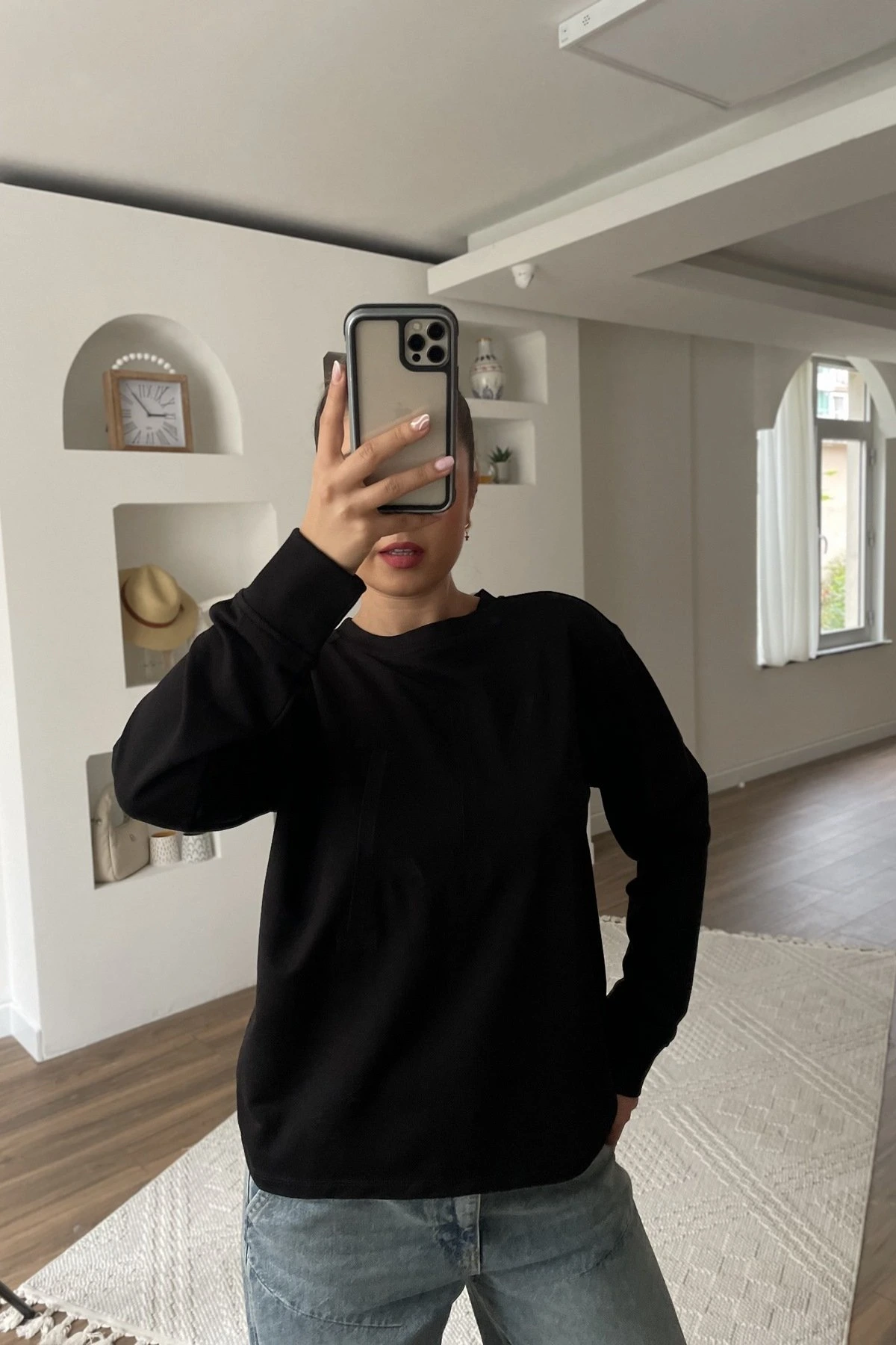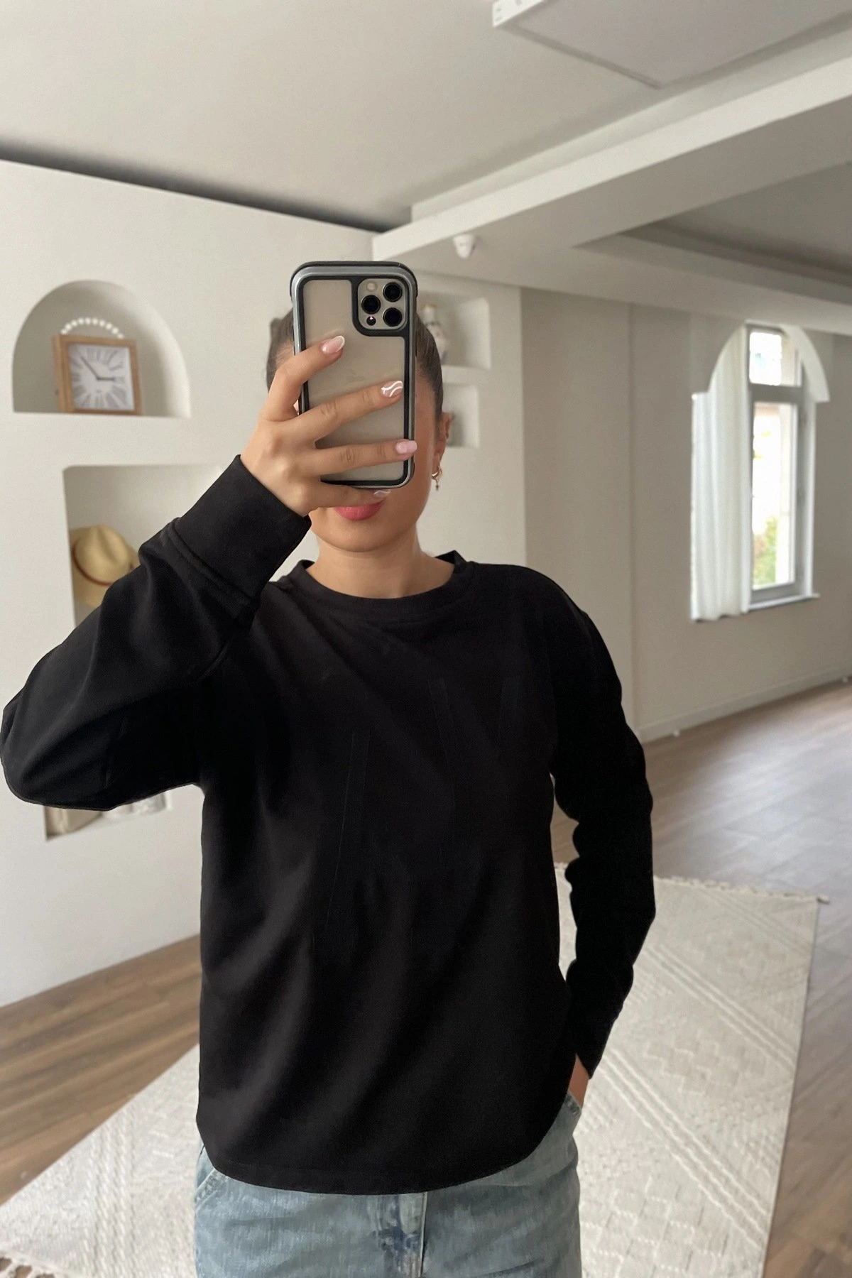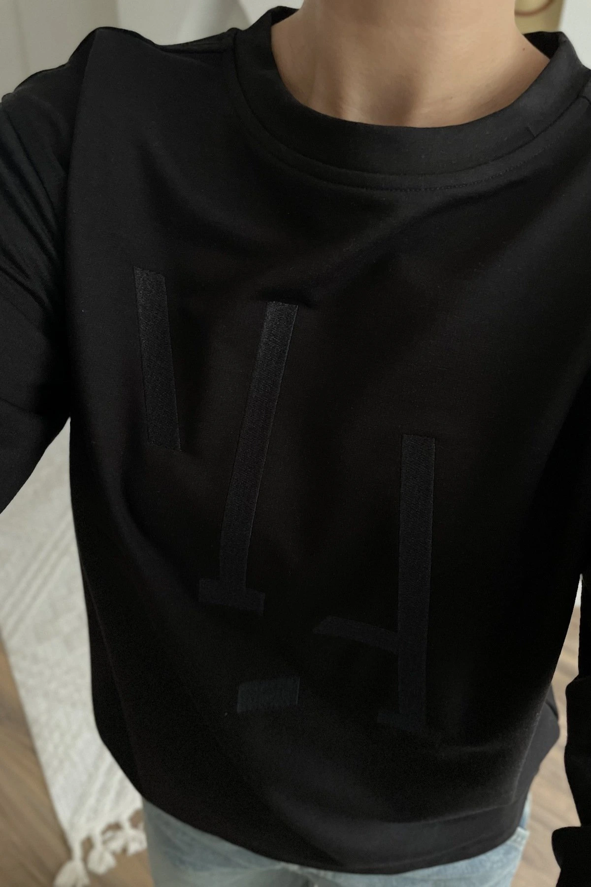 ÖN NAKIŞ BİSİKLET YAKA UZUN KOL PAMUK SWEAT – SİYAH