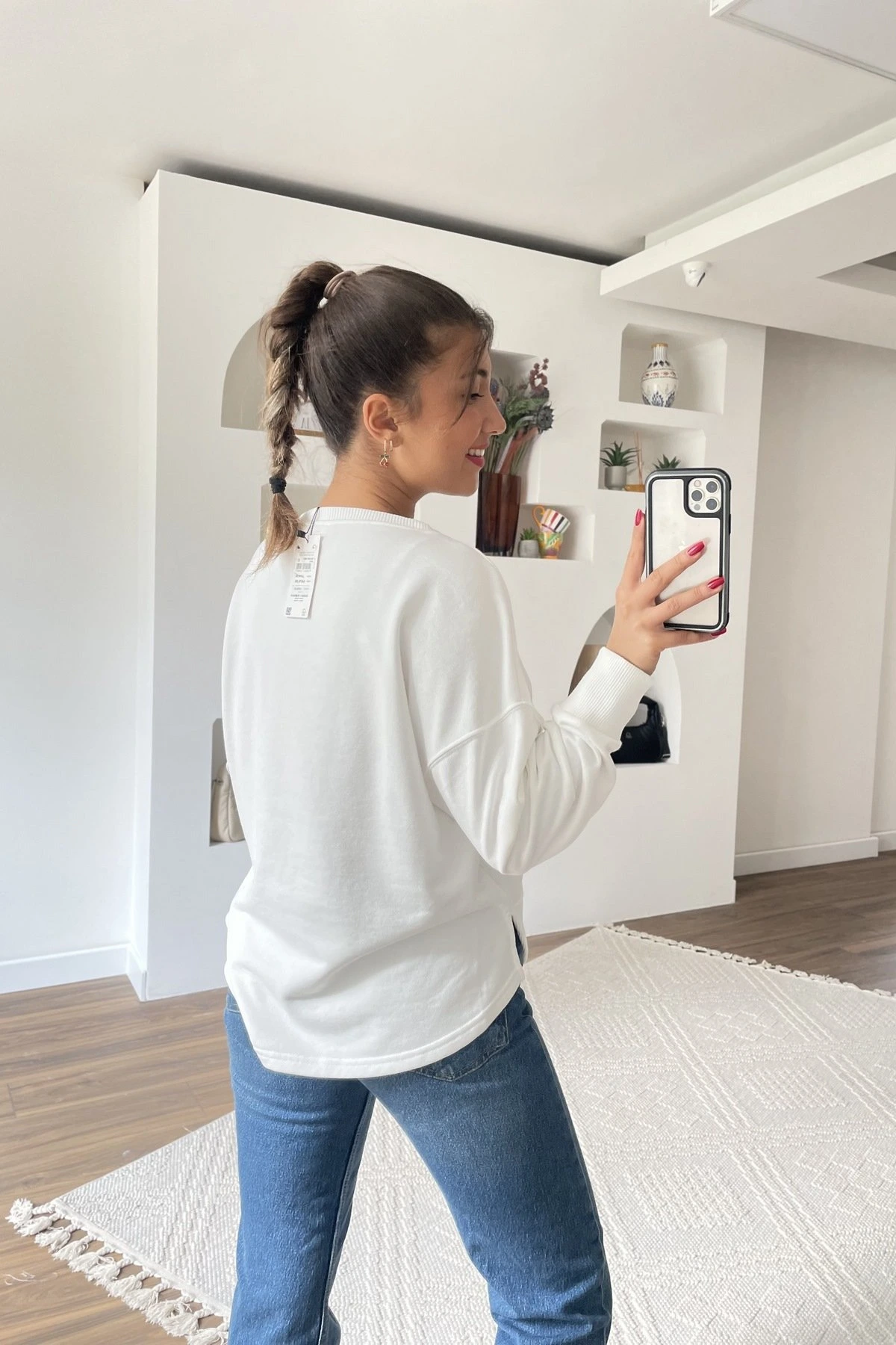 STYLİSH YAZI BASKI ARKA UZUN PAMUK SWEAT – EKRU