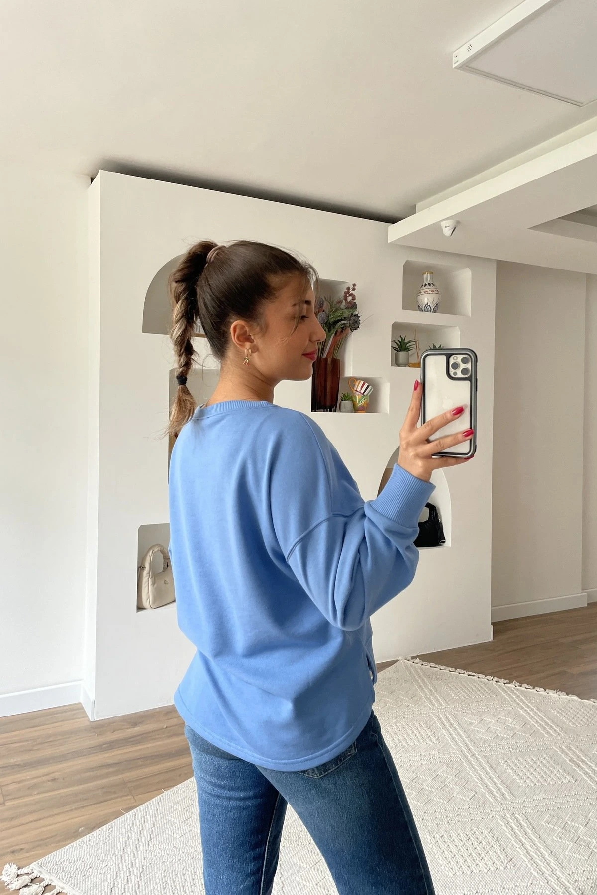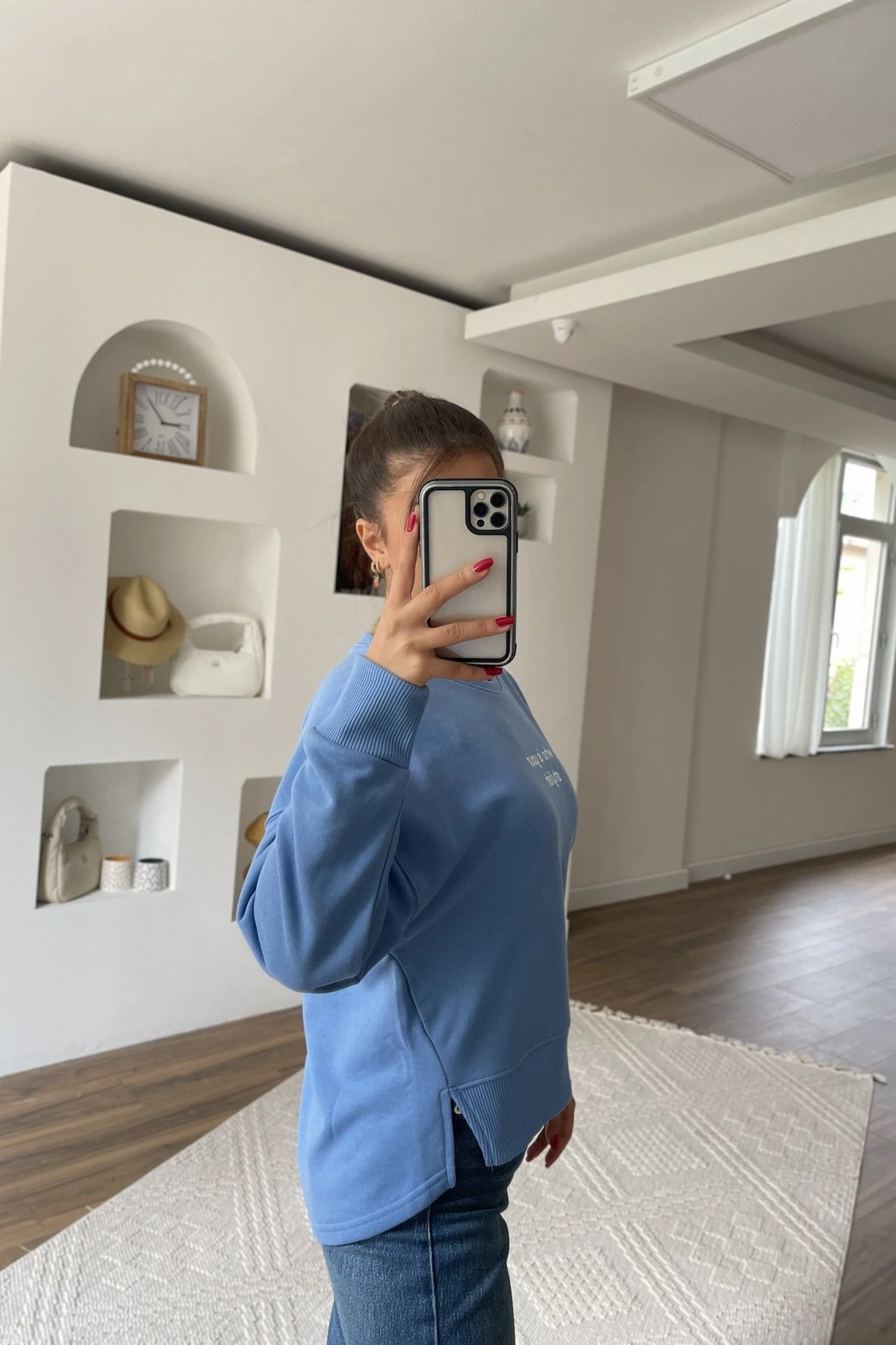 STYLİSH YAZI BASKI ARKA UZUN PAMUK SWEAT – MAVİ