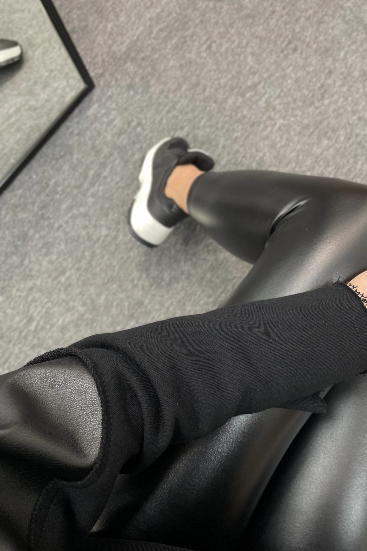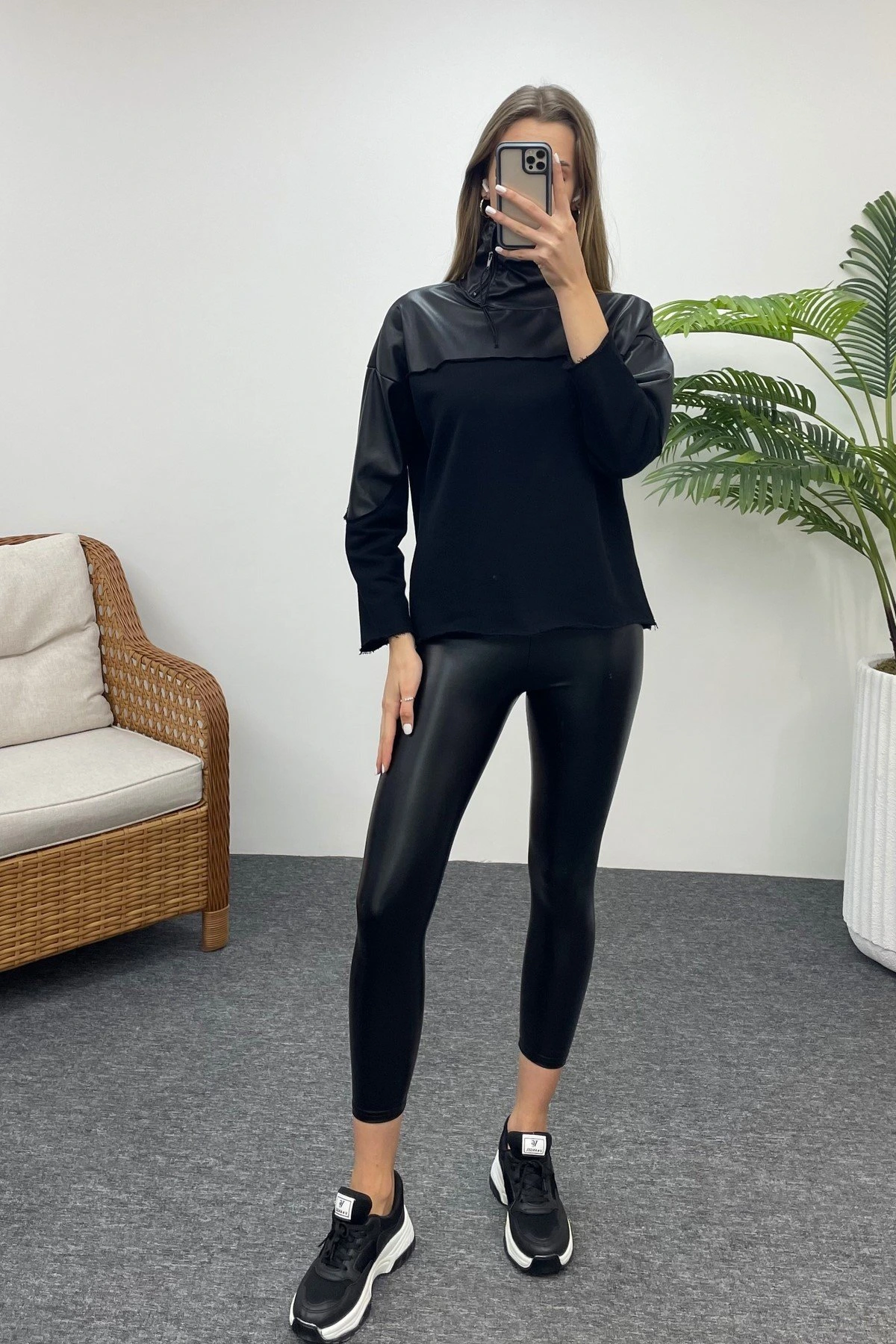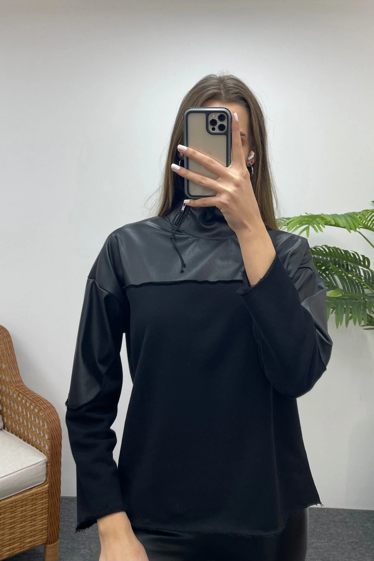 YAKA ÇİFT FERMUAR DERİ DETAY SWEAT – SİYAH