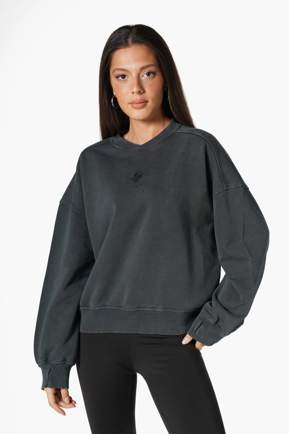 YIKAMA EFEKT KUŞ NAKIŞLI PAMUK SWEAT – ANTRASİT