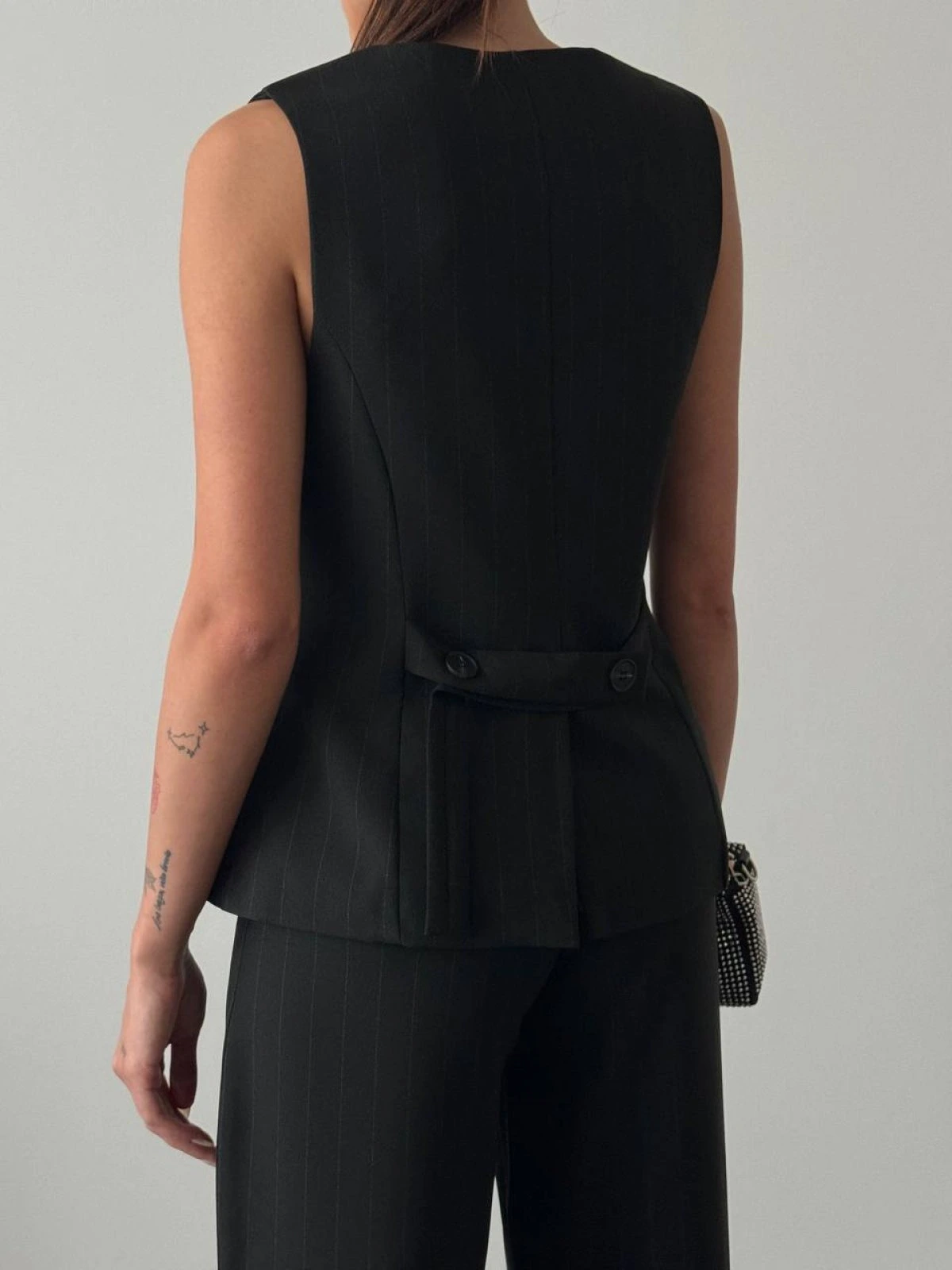 ARKA DÜĞME BRİT YELEK BOL PAÇA PANTOLON ÇİZGİLİ TAKIM – SİYAH