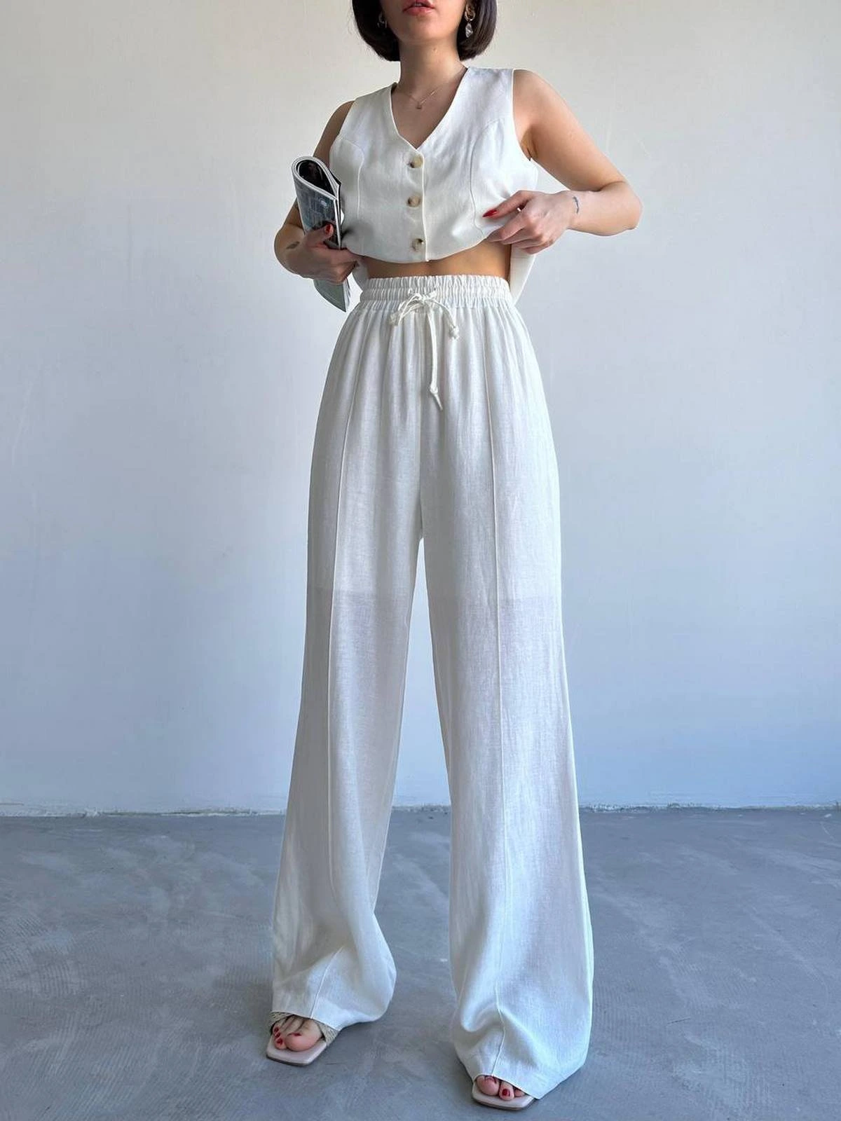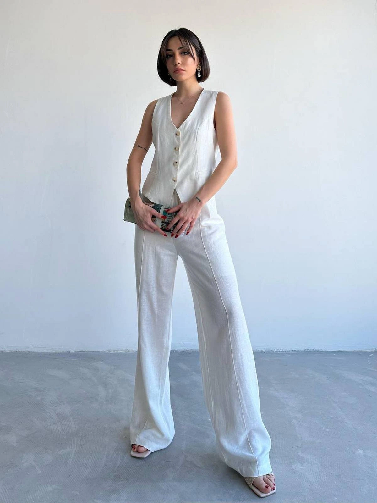 ASTARLI PAMUK YELEK PANTOLON TAKIM – EKRU