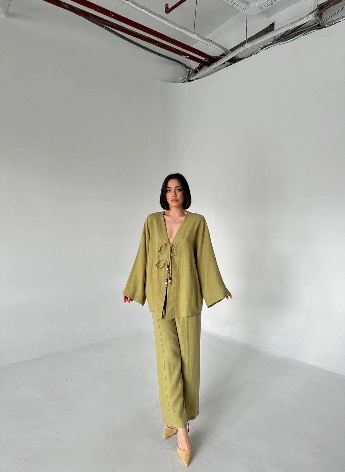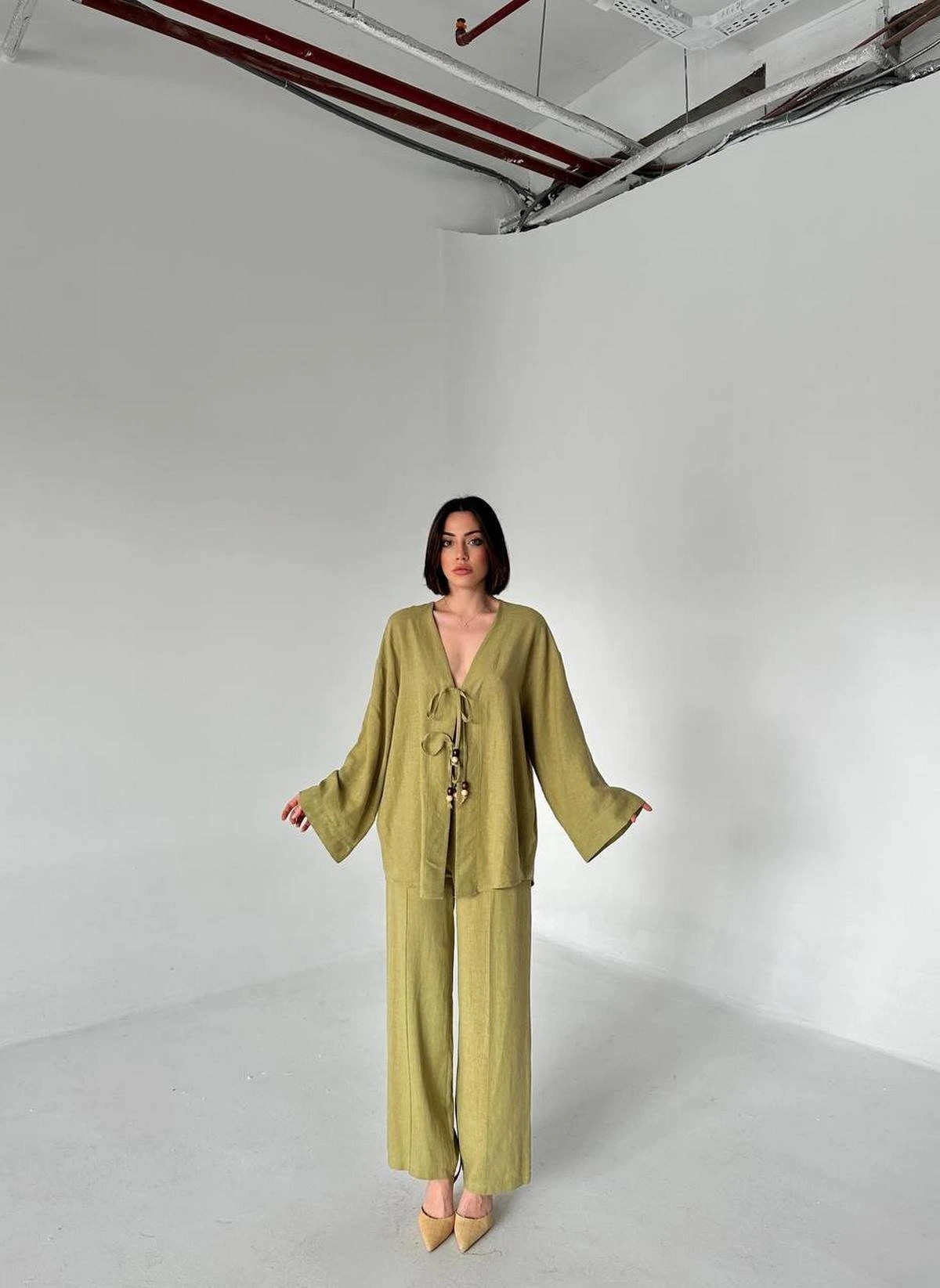 BAĞCIKLI KİMONO ASTARLI PANTOLON PAMUK TAKIM – HAKİ
