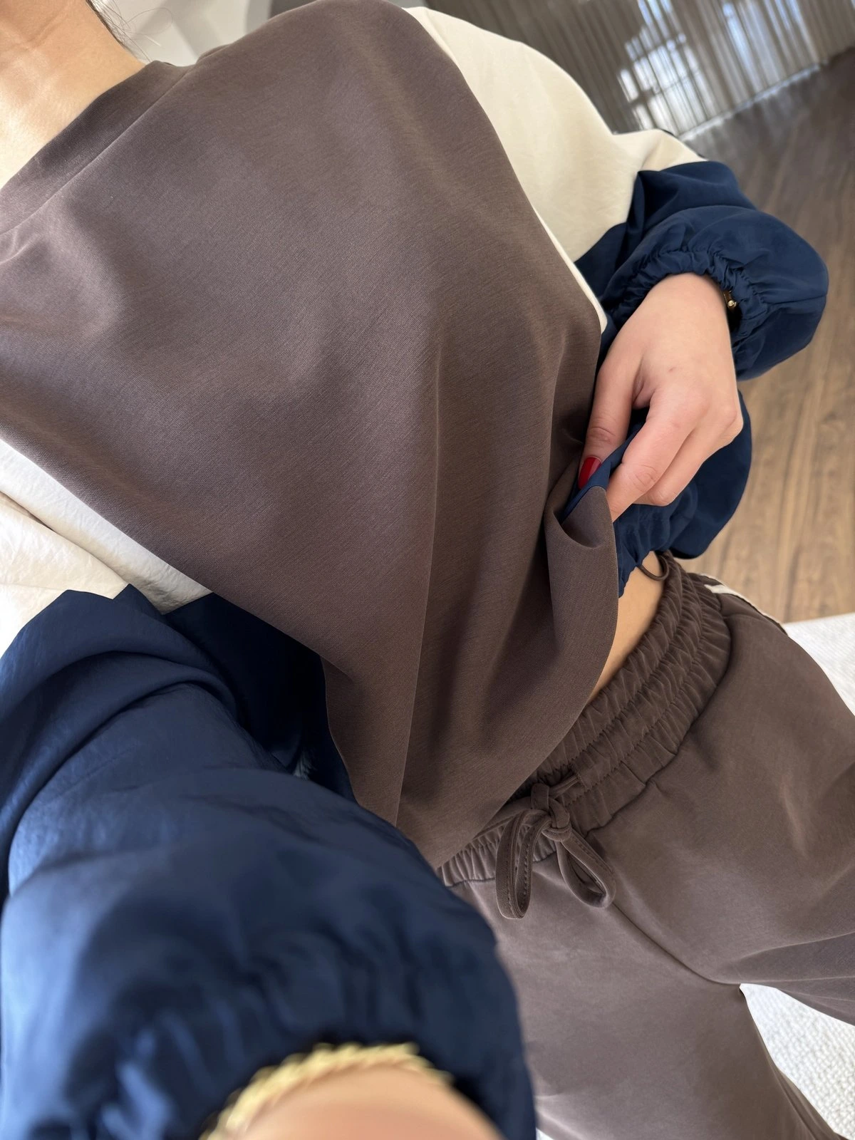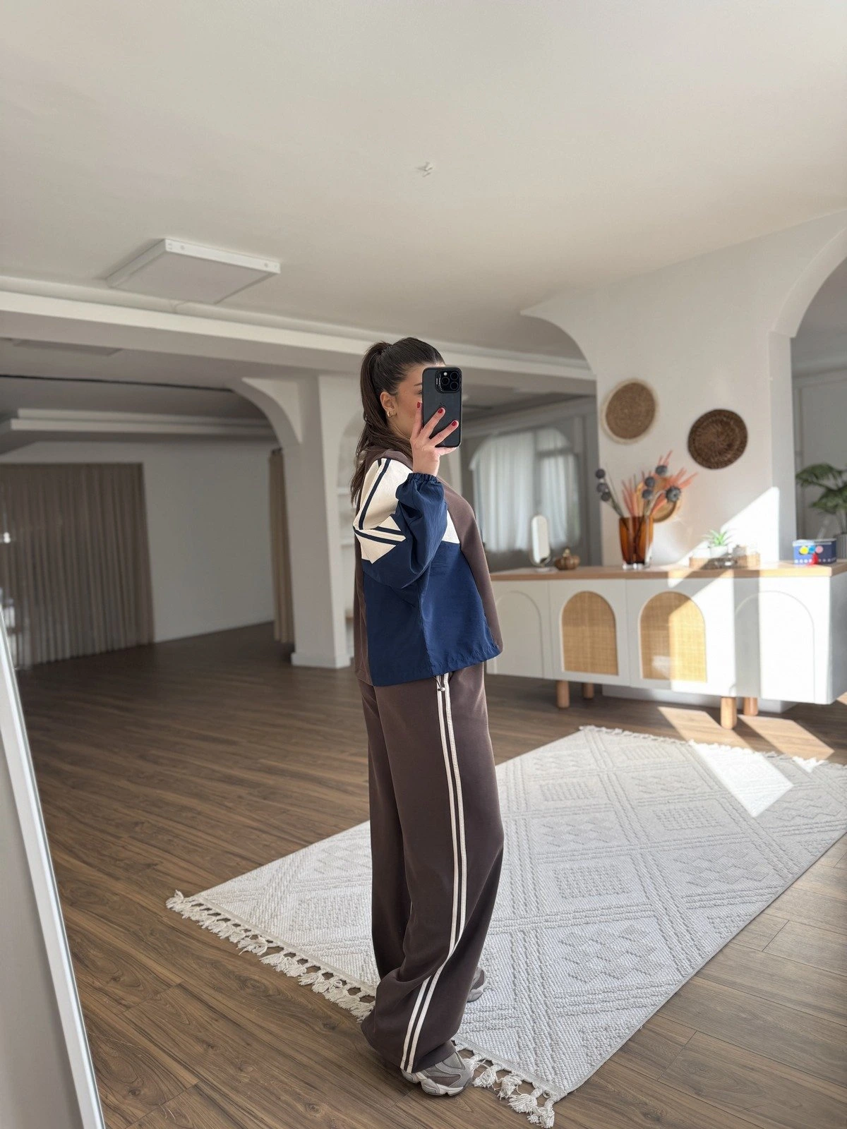 BEL BÜZGÜ PATAŞÜT DETAY SWEAT ŞERİTLİ EŞOFMAN MODAL PAMUK TAKIM – KAHVE
