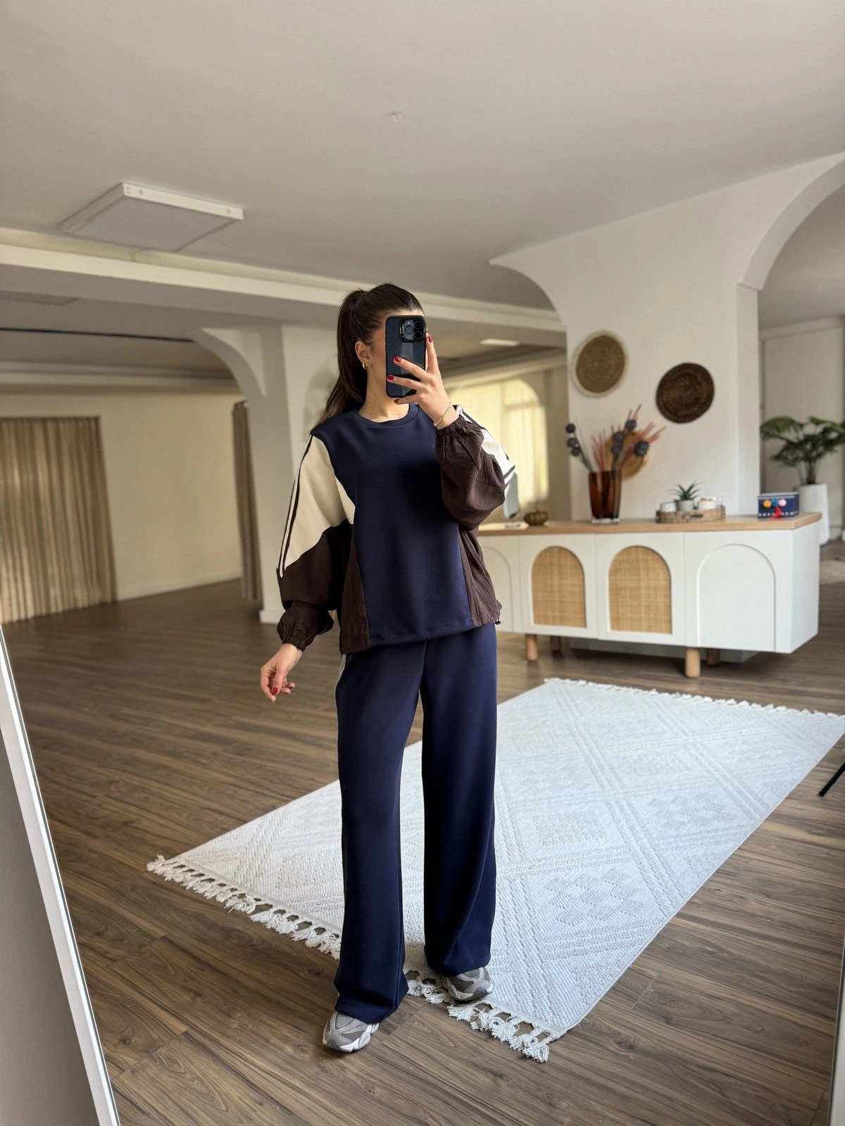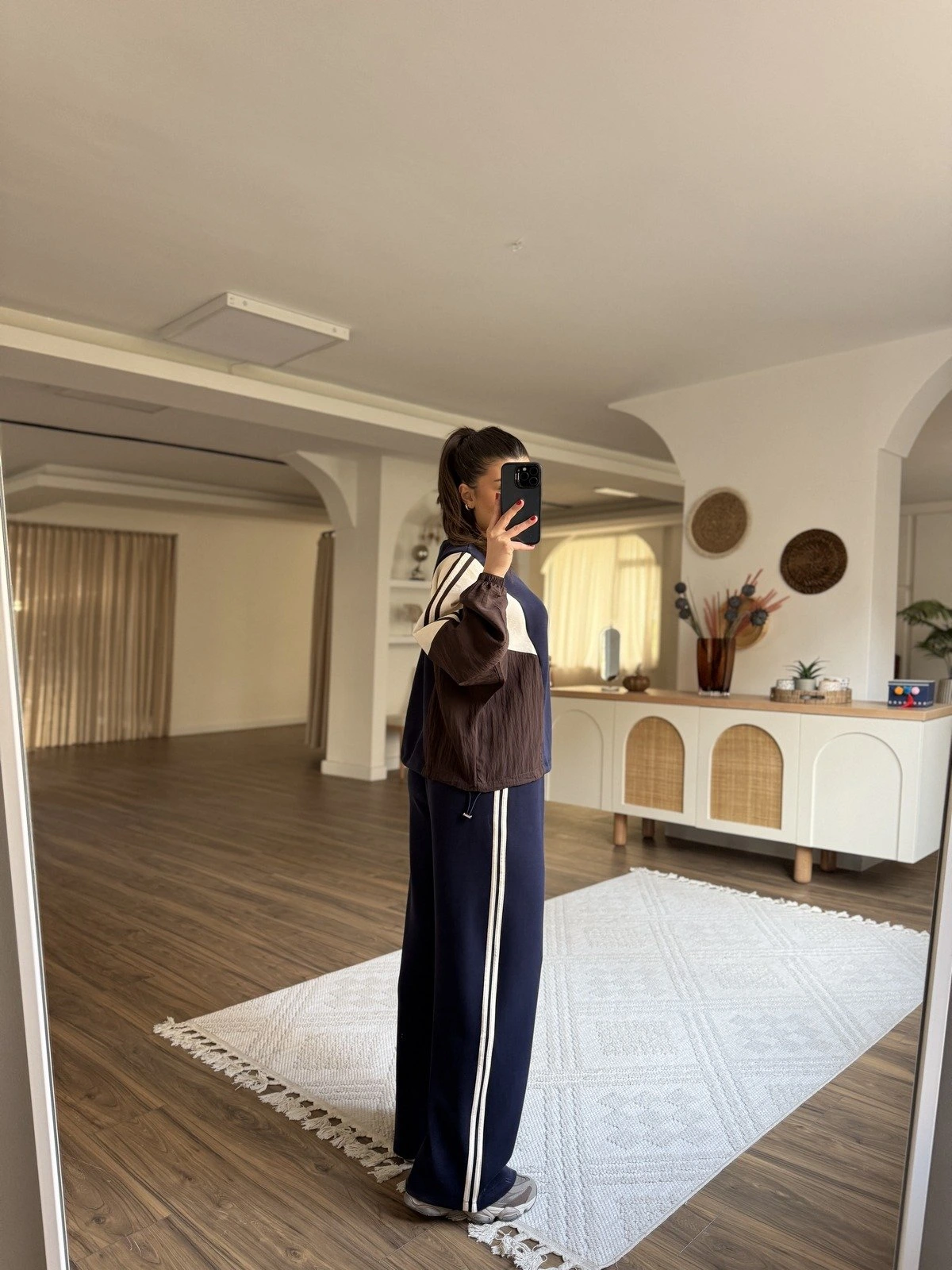BEL BÜZGÜ PATAŞÜT DETAY SWEAT ŞERİTLİ EŞOFMAN MODAL PAMUK TAKIM – LACİVERT