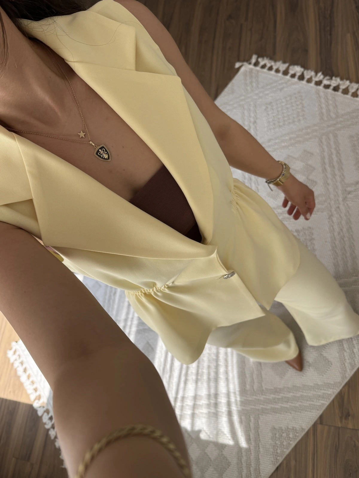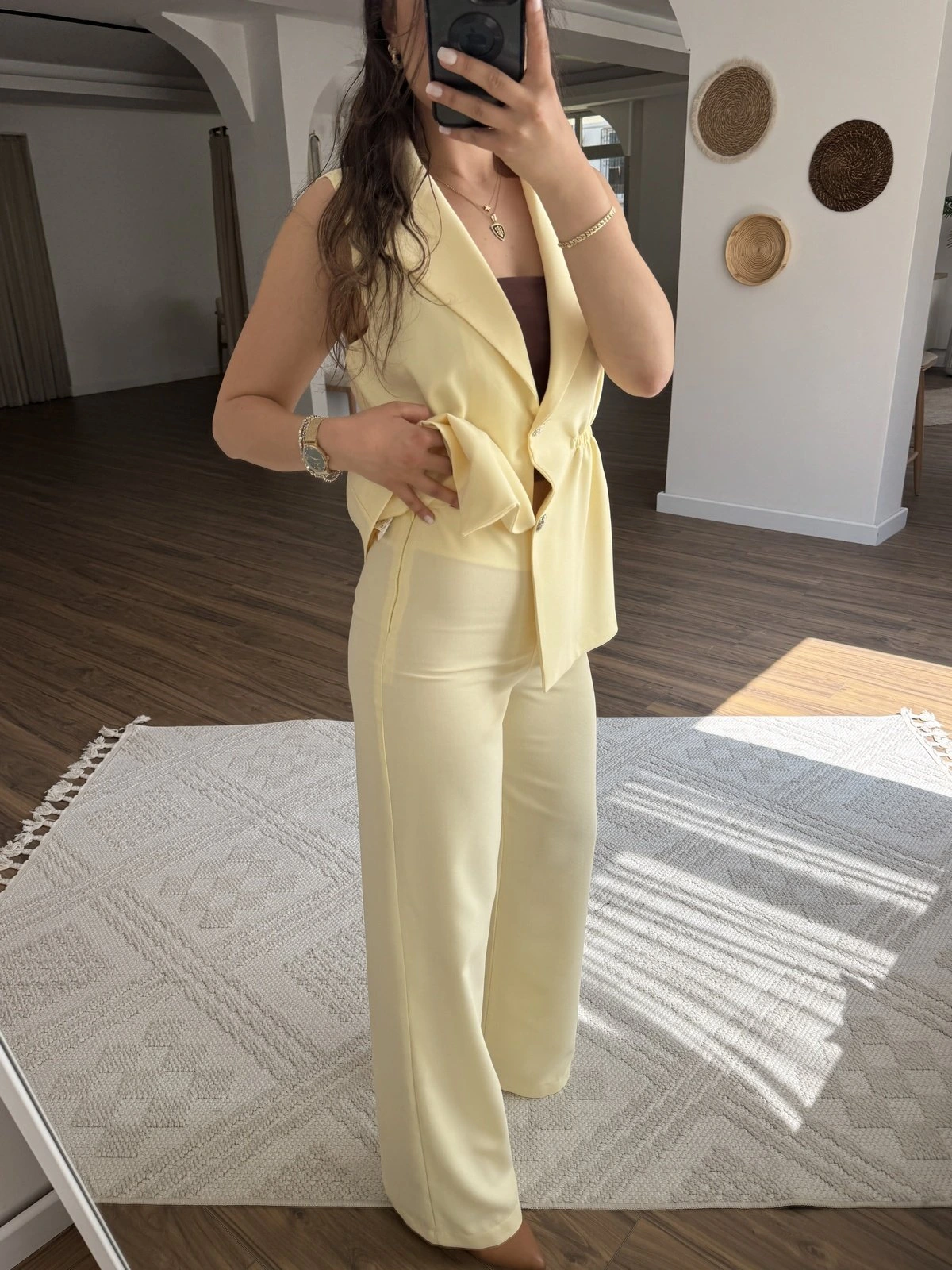 BEL LASTİK BÜZGÜ YELEK PANTOLON VİSKON TAKIM – SARI