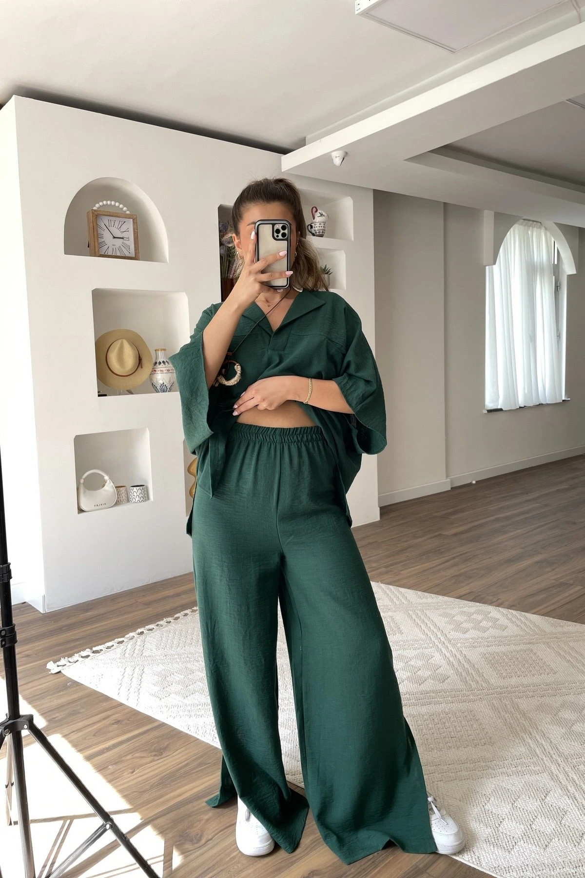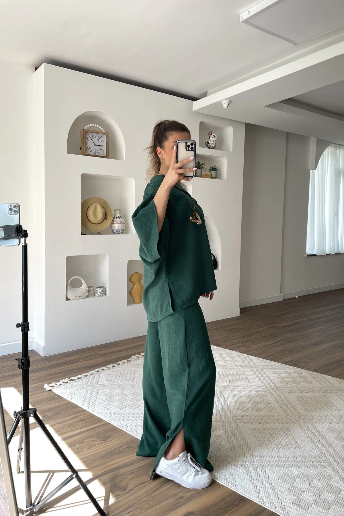 BLUZ PANTOLON YAN YIRTMAÇ DÜŞÜK OMUZ VİSKON TAKIM – ZÜMRÜT YEŞİL