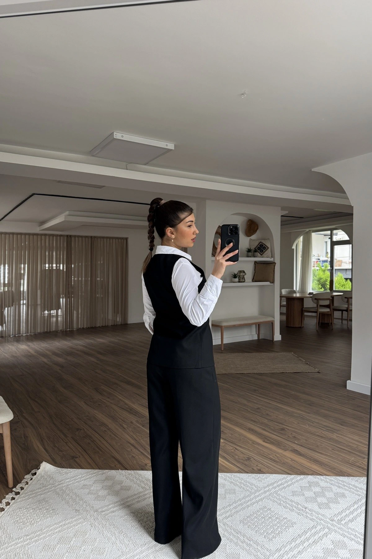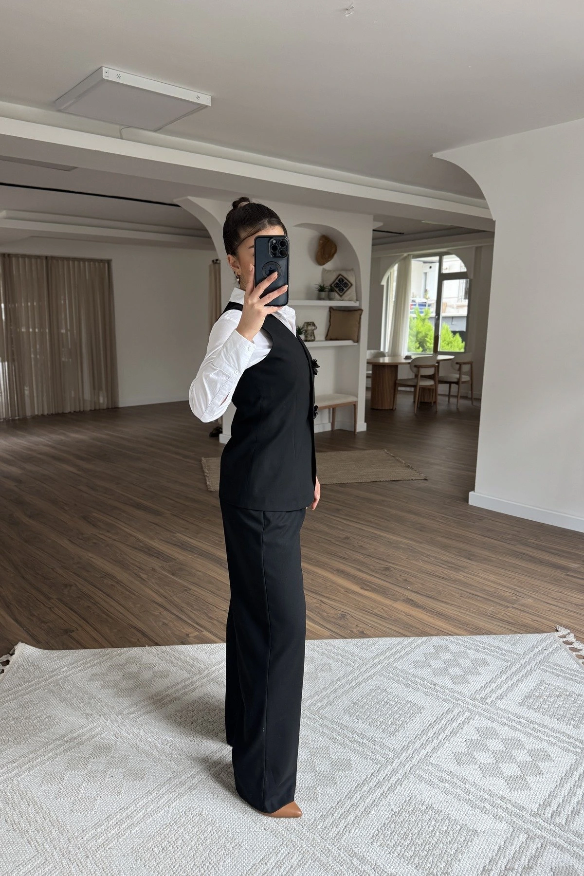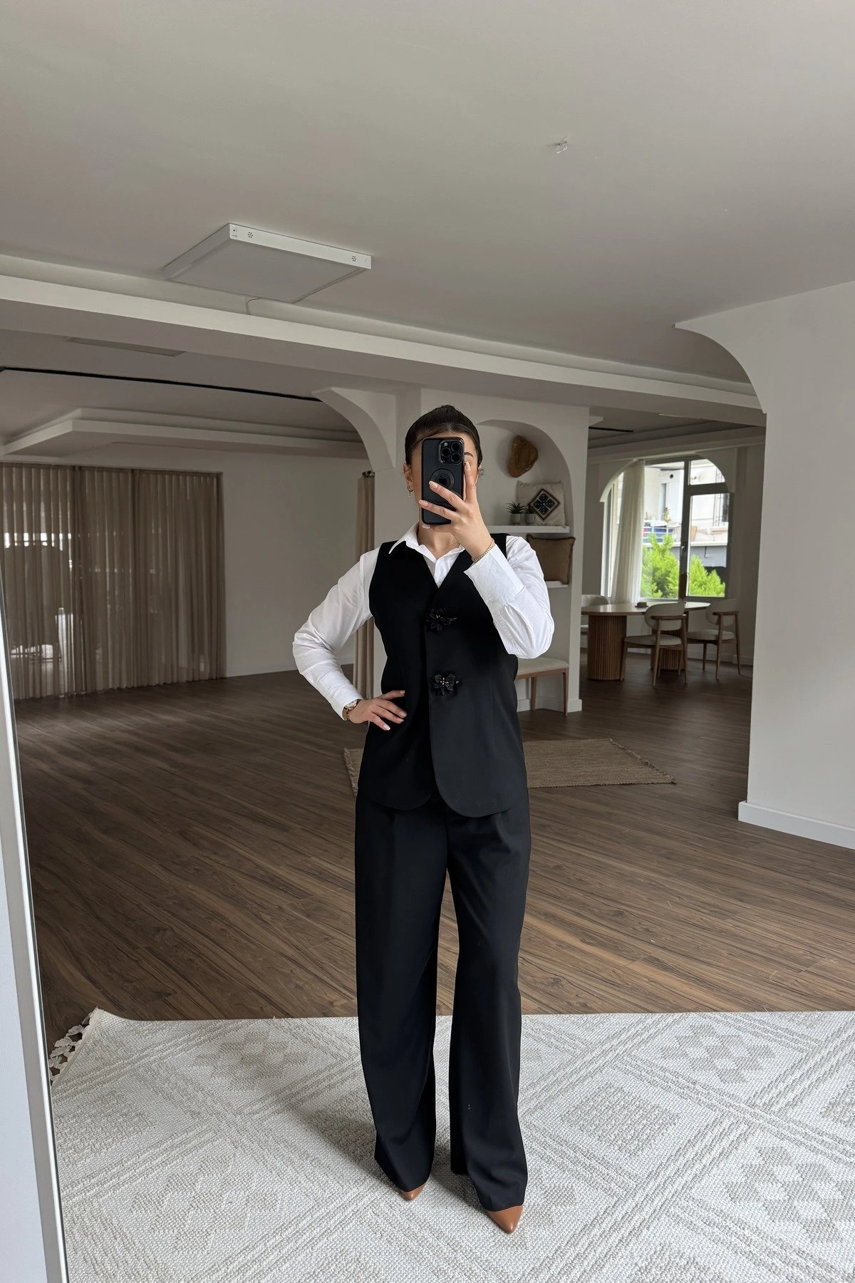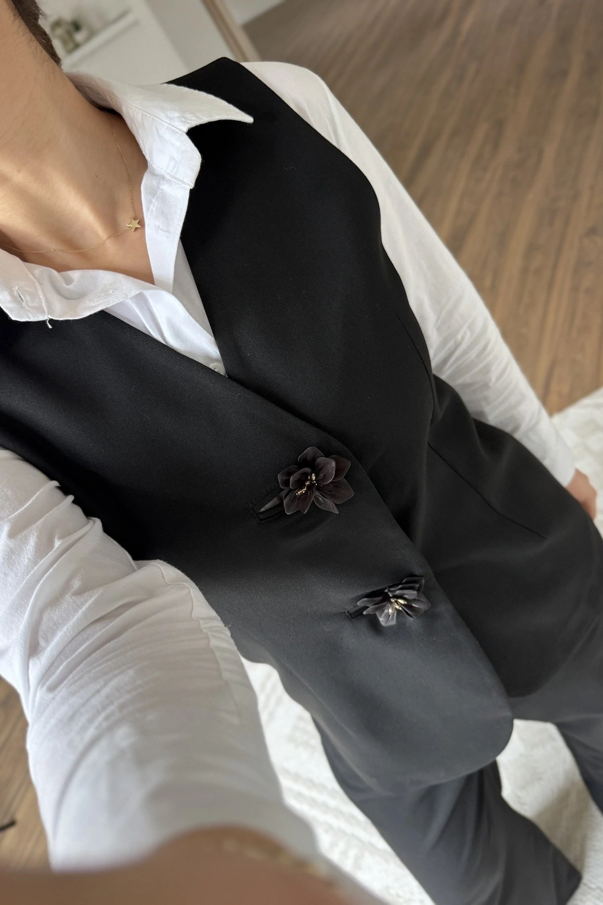 ÇİÇEK AKSESUAR DÜĞME YELEK ÖN PİLİ PANTOLON VİSKON TAKIM – SİYAH