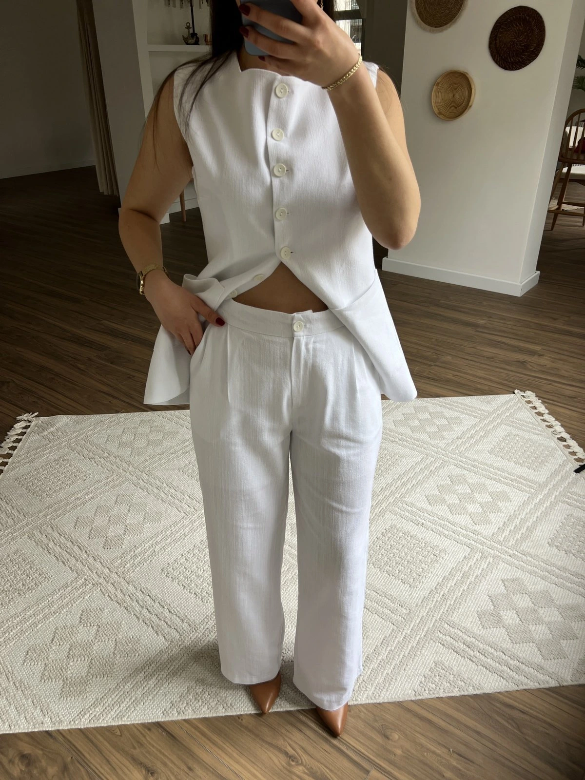 ÇİFT CEPLİ UZUN YELEK ARKA BEL LASTİK PANTOLON PAMUK TAKIM – BEYAZ