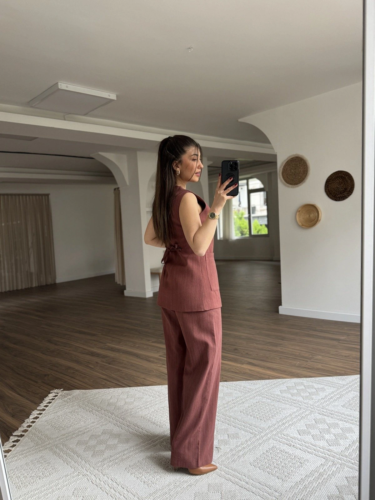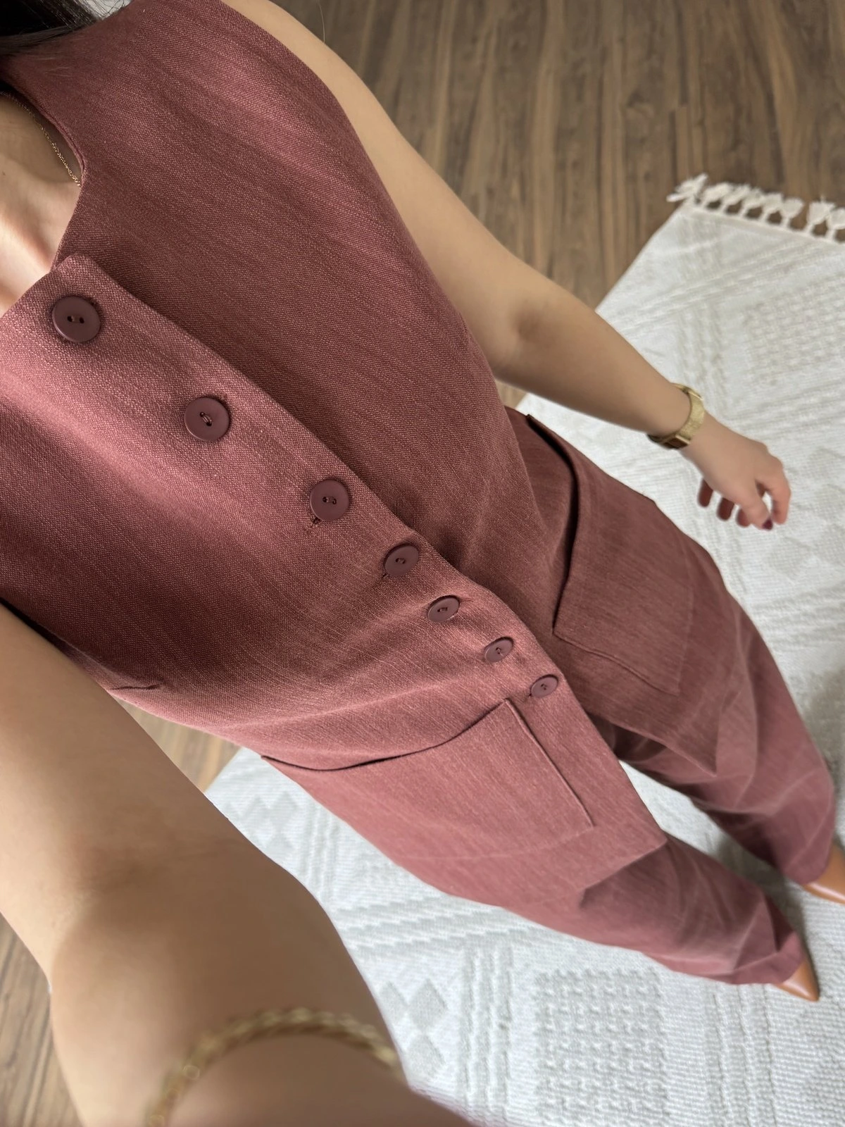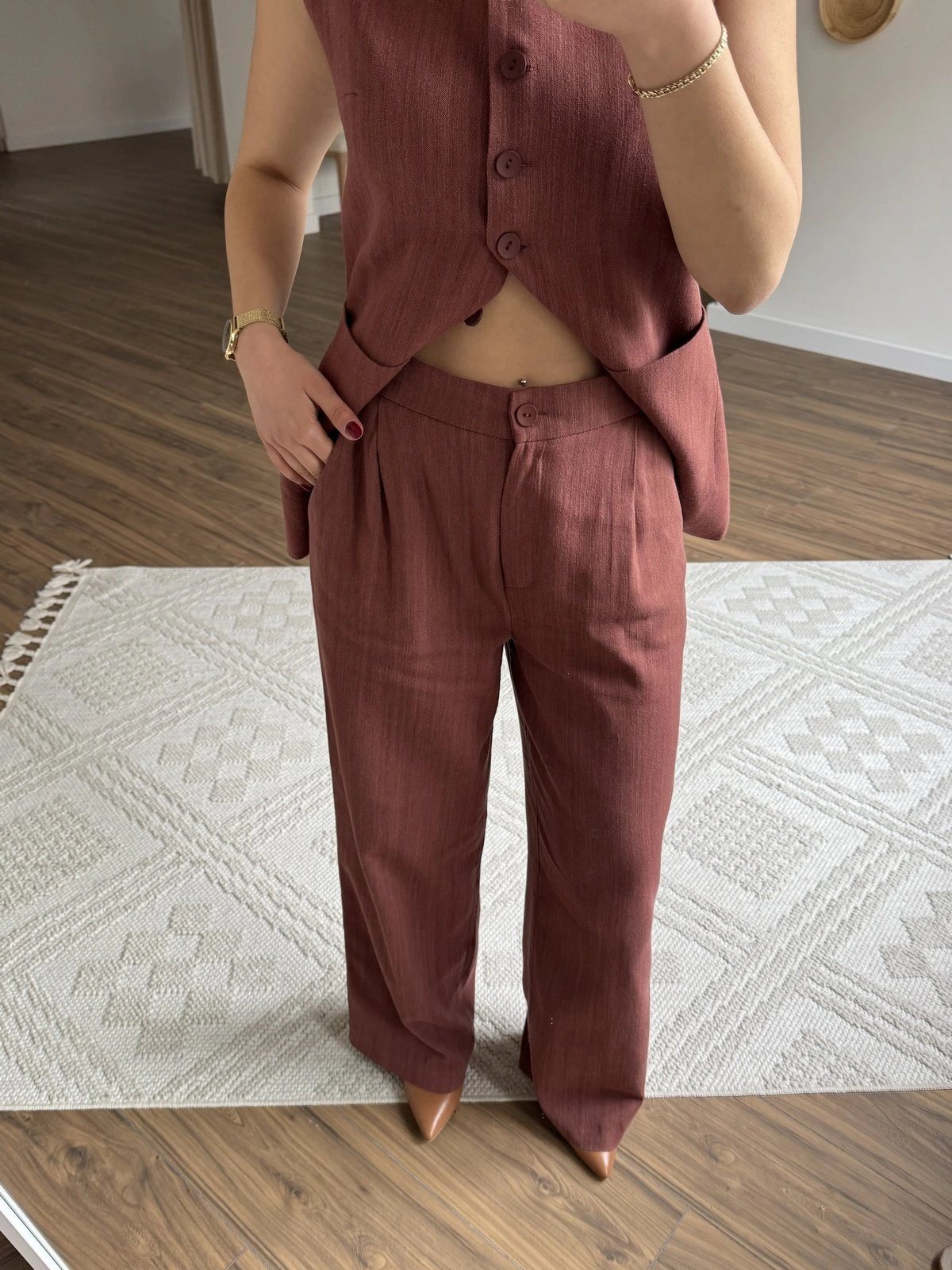 ÇİFT CEPLİ UZUN YELEK ARKA BEL LASTİK PANTOLON PAMUK TAKIM – KİREMİT