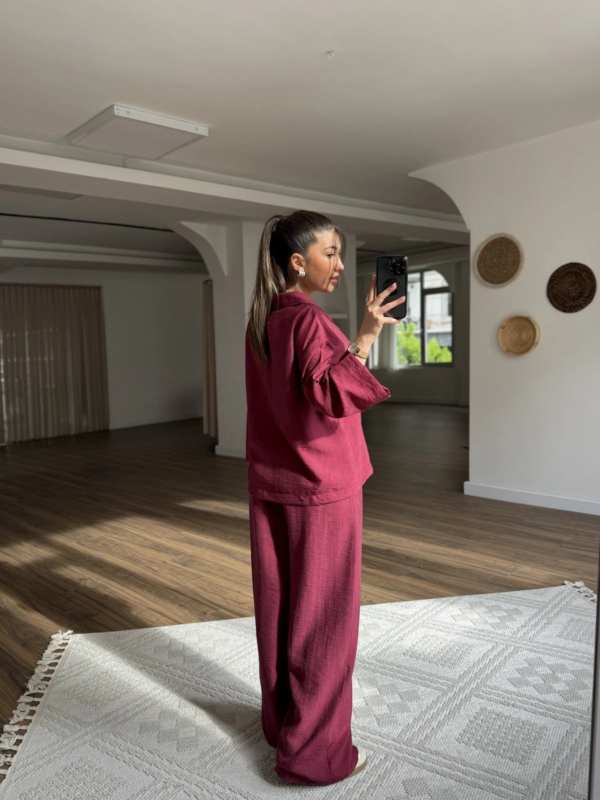 ÇİFT KAPAK CEP GENİŞ KOL VİSKON GÖMLEK PANTOLON TAKIM – BORDO