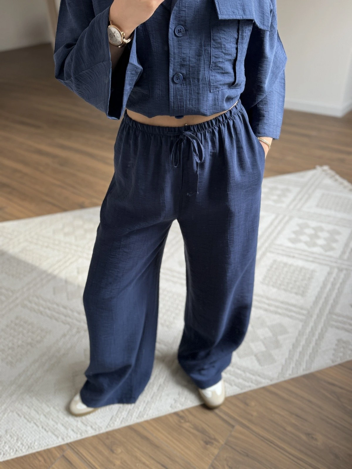 ÇİFT KAPAK CEP GENİŞ KOL VİSKON GÖMLEK PANTOLON TAKIM – LACİVERT