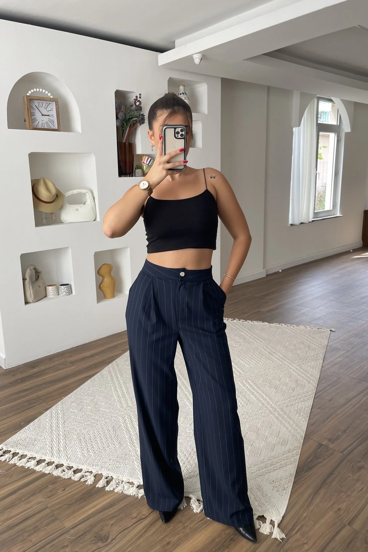 ÇİZGİLİ 4 DÜĞME CEKET PALAZZO PANTOLON VİSKON TAKIM – LACİVERT