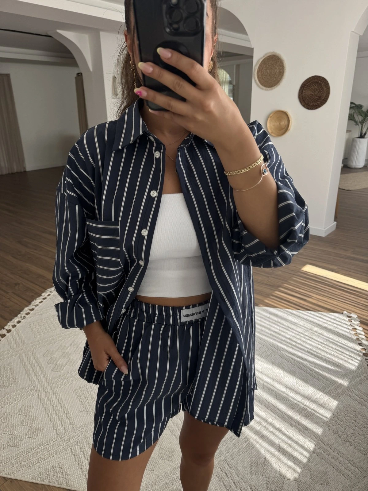 ÇİZGİLİ SALAŞ GÖMLEK ŞORT PAMUK TAKIM – LACİVERT BEYAZ