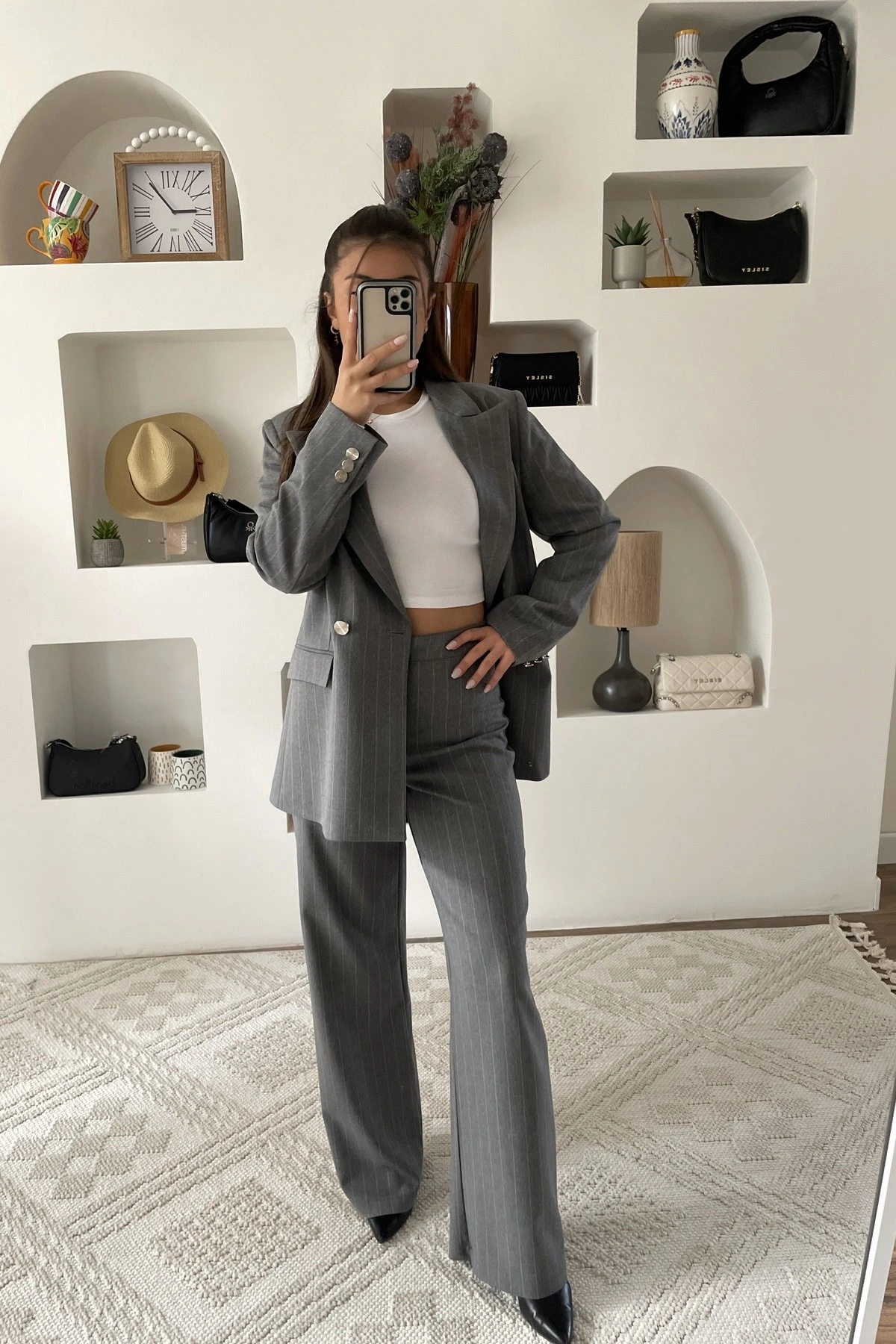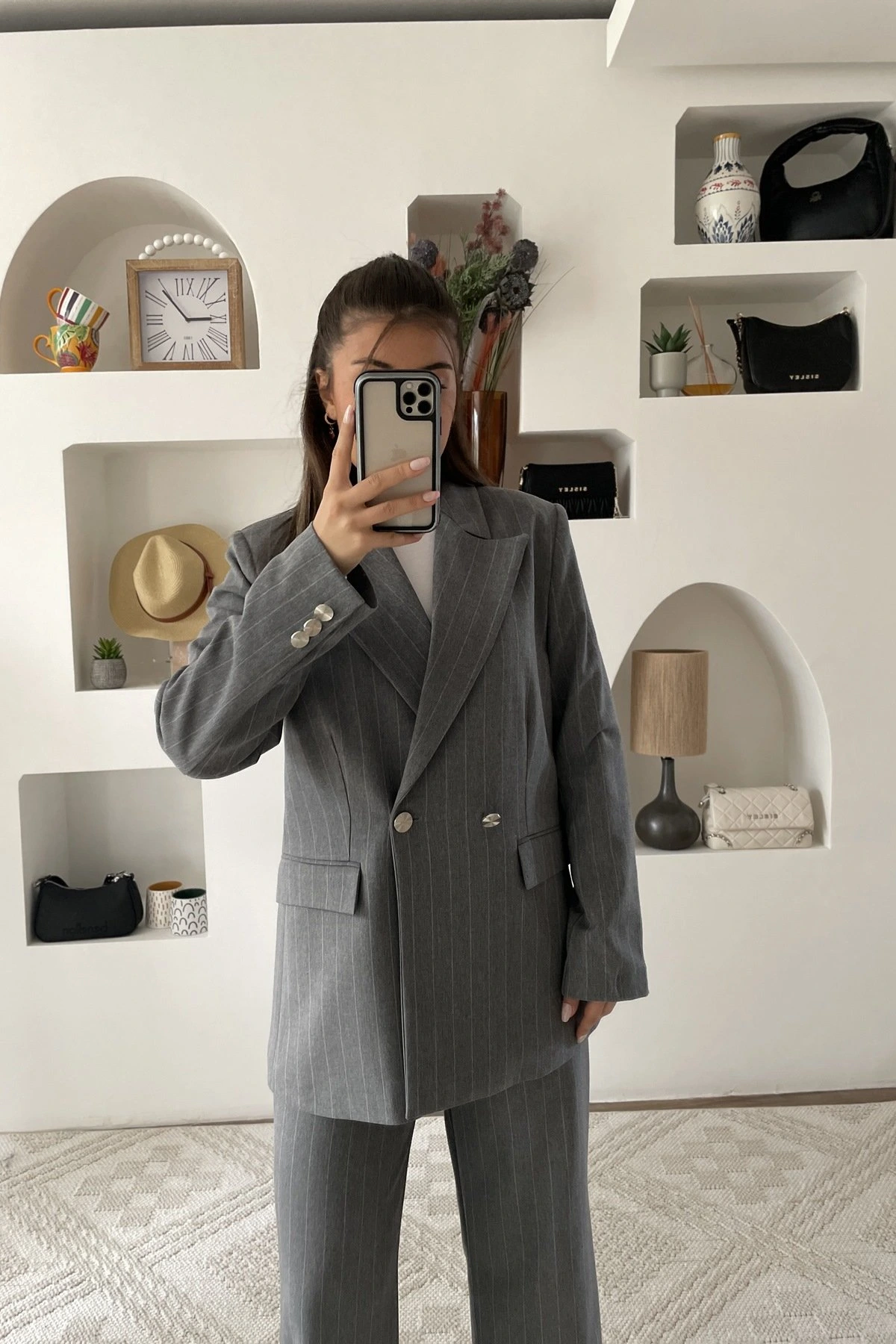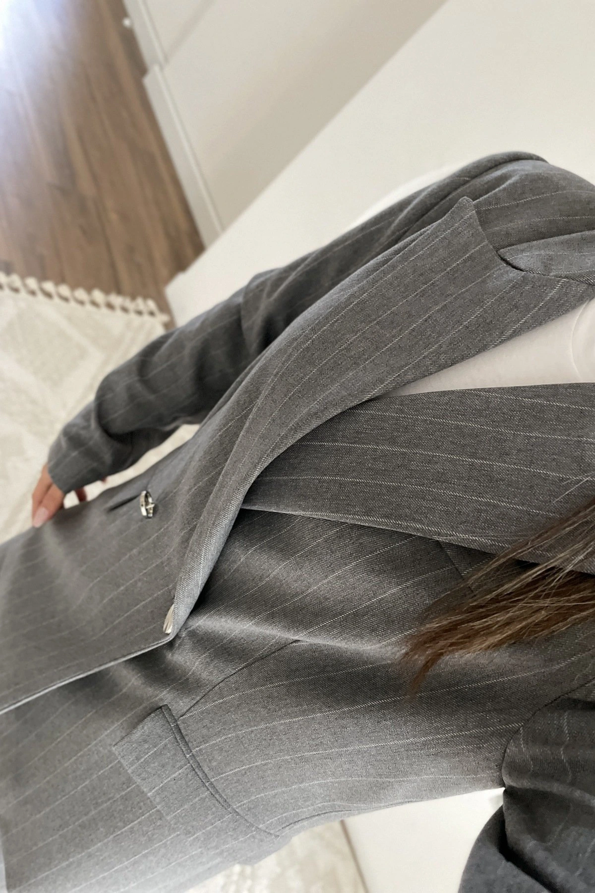 ÇİZGİLİ VİSKON KARIŞIMLI CEKET VE PANTOLON TAKIM – GRİ