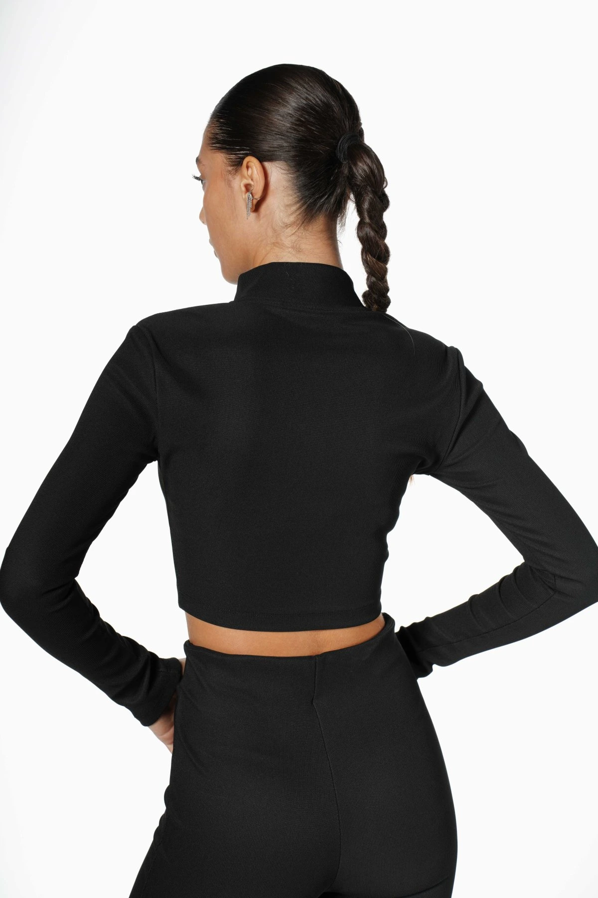 CROP DİK YAKA FERMUARLI LİKRALI TAYT TAKIM – SİYAH
