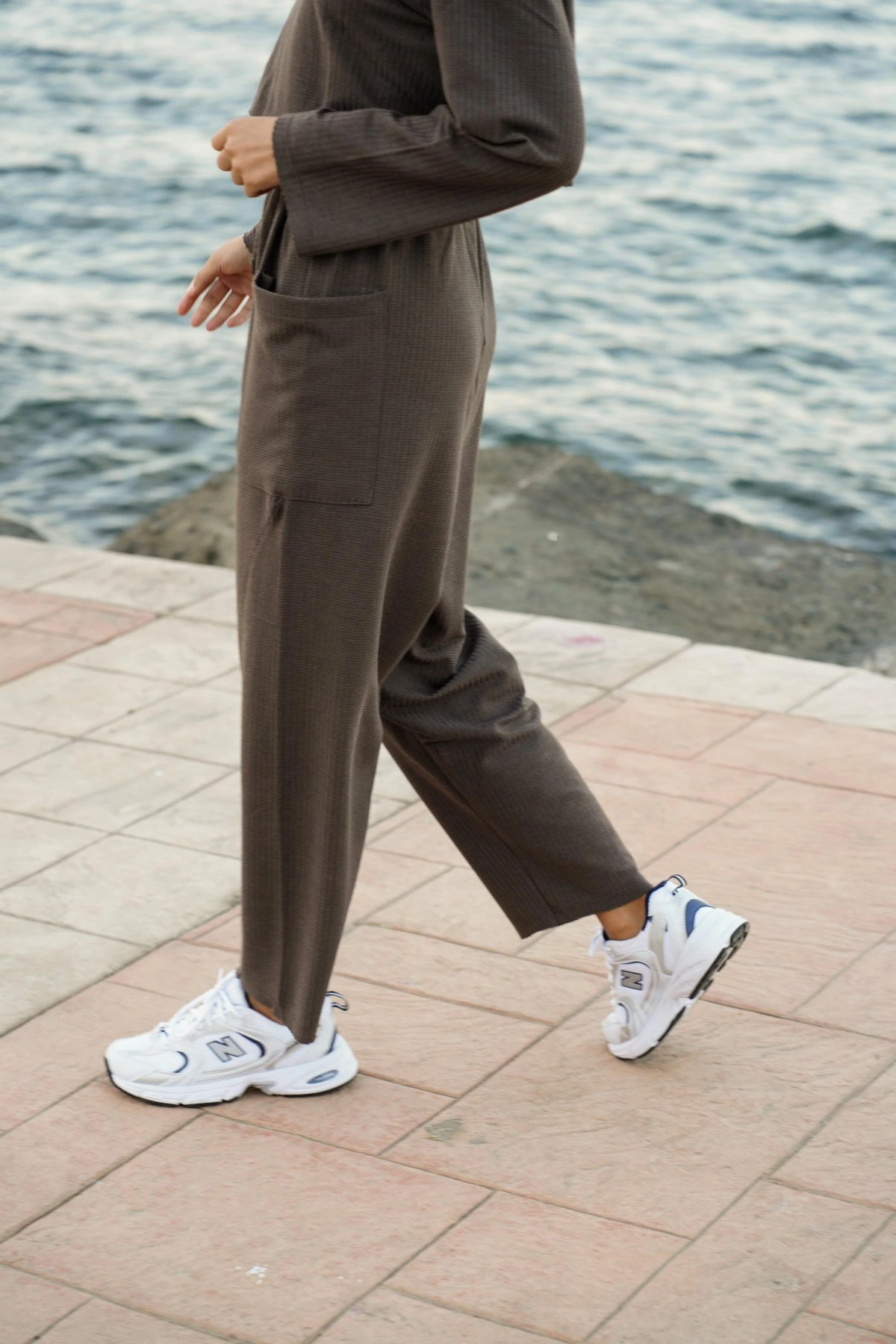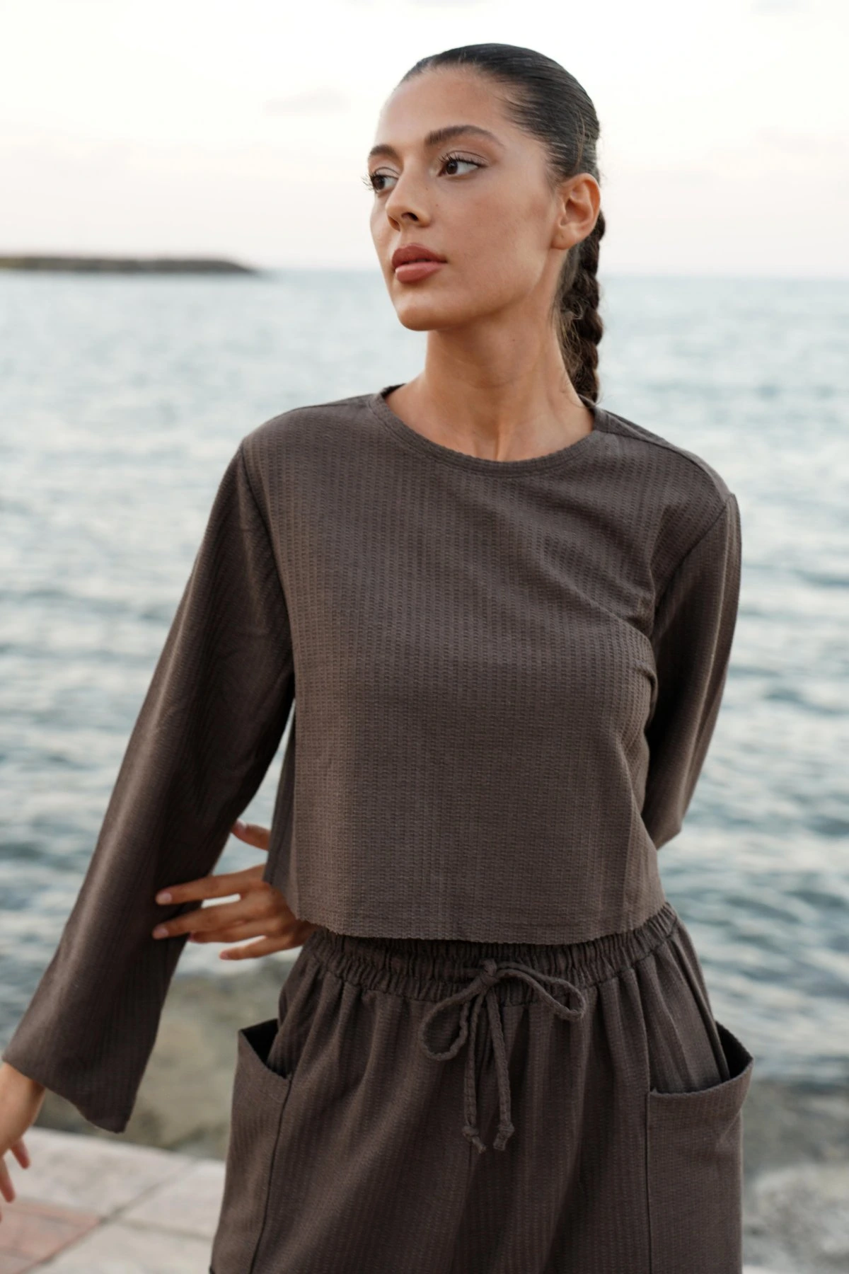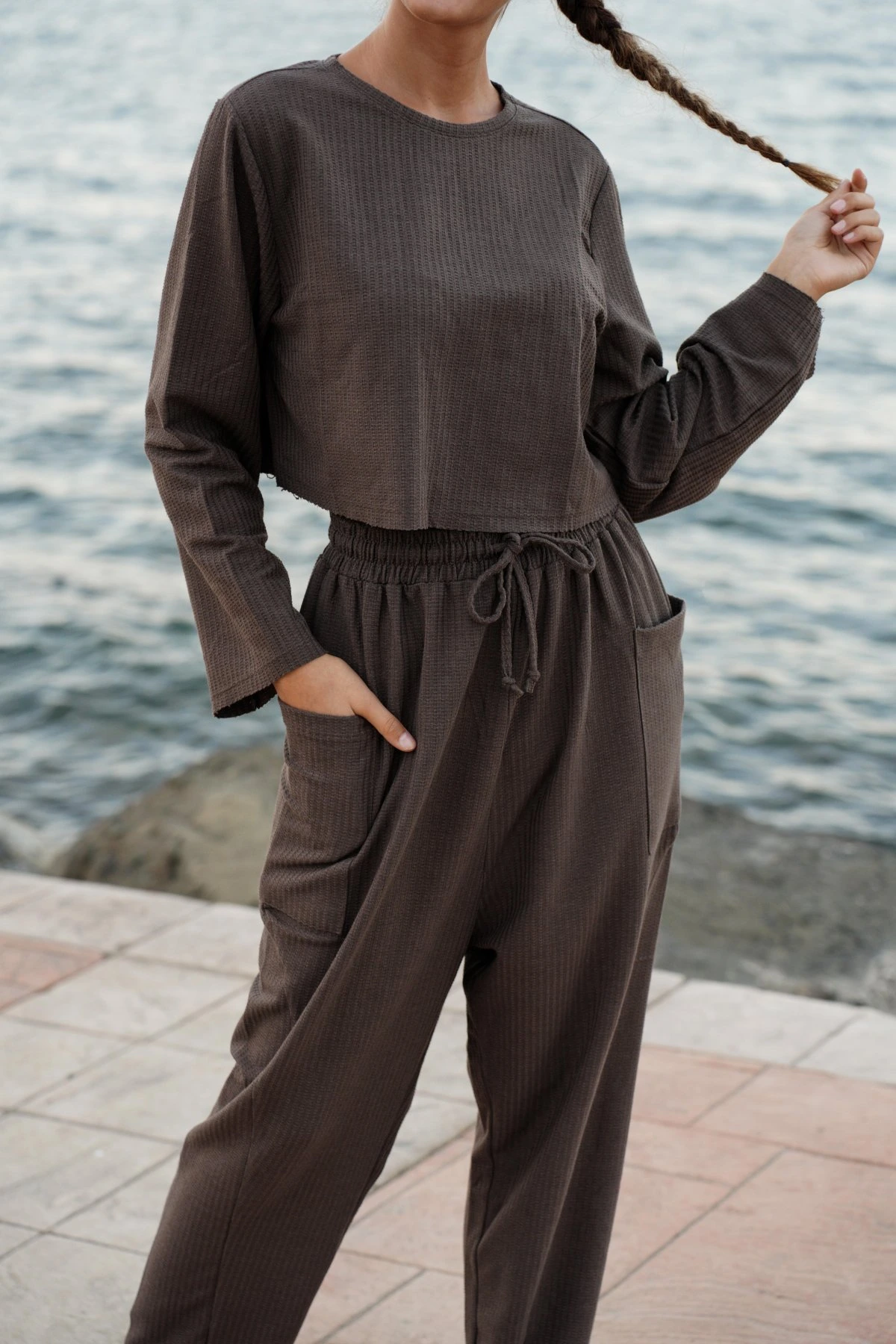 CROP SALAŞ BLUZ YAN CEP RAHAT PANTOLON PAMUK TAKIM – KAHVE