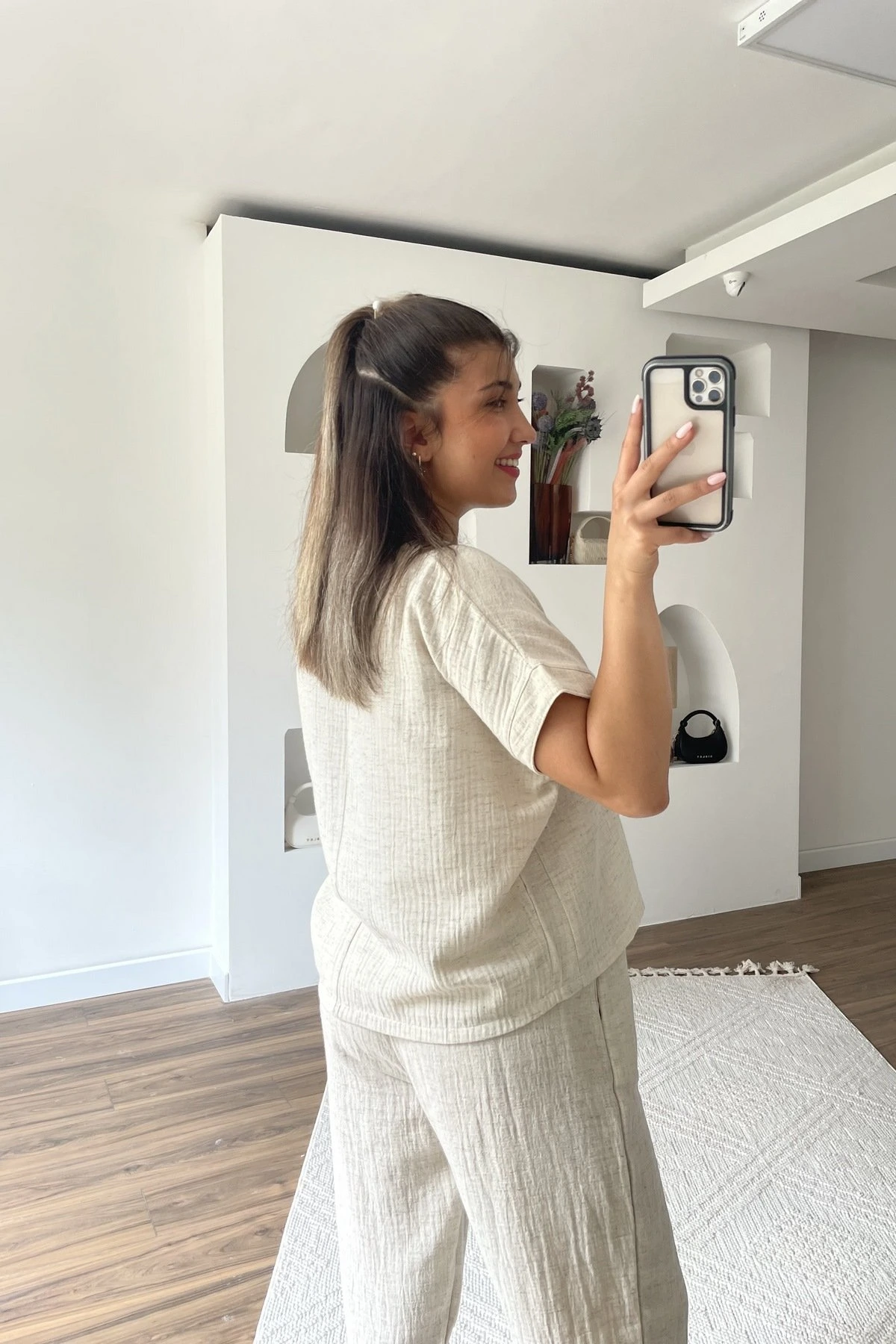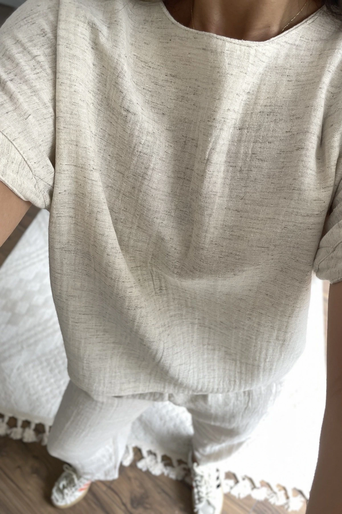 DÜŞÜK OMUZ BLUZ CEPLİ PANTOLON PAMUK KETEN TAKIM – NATUREL