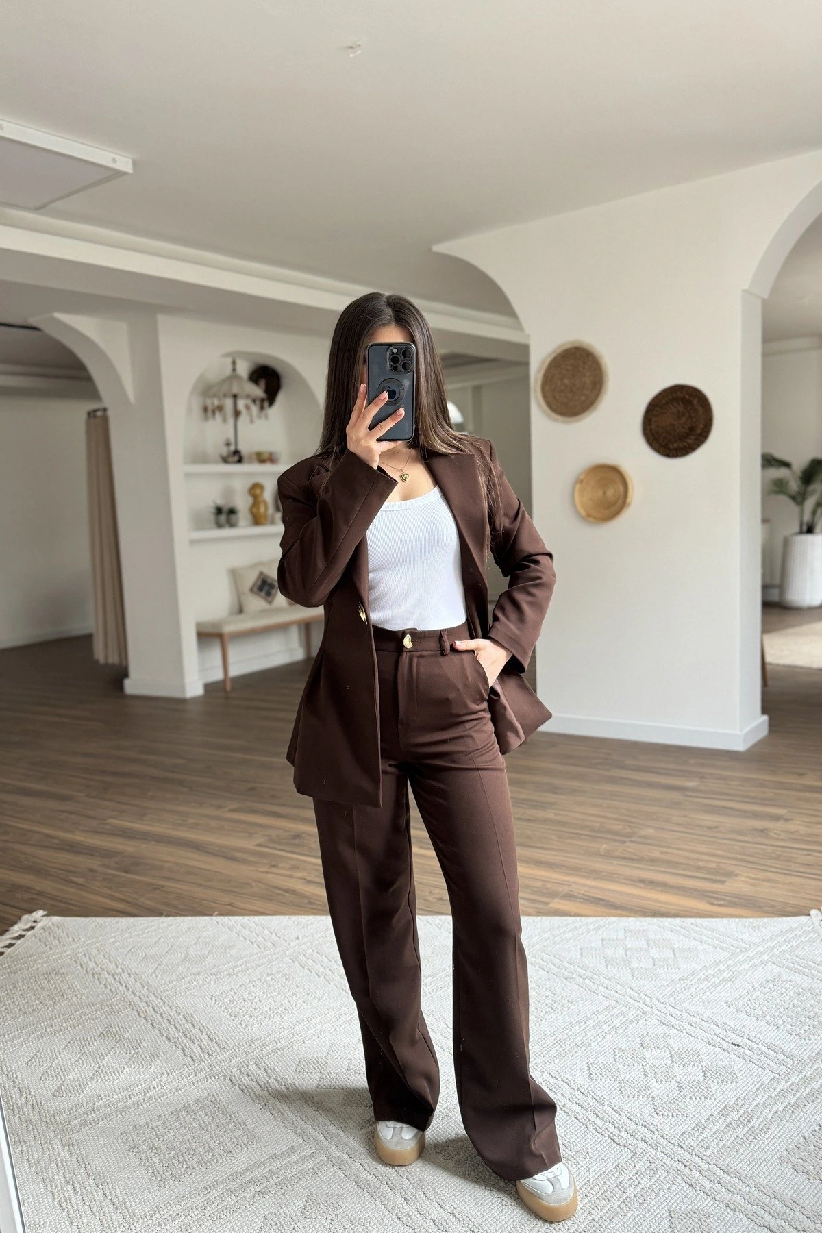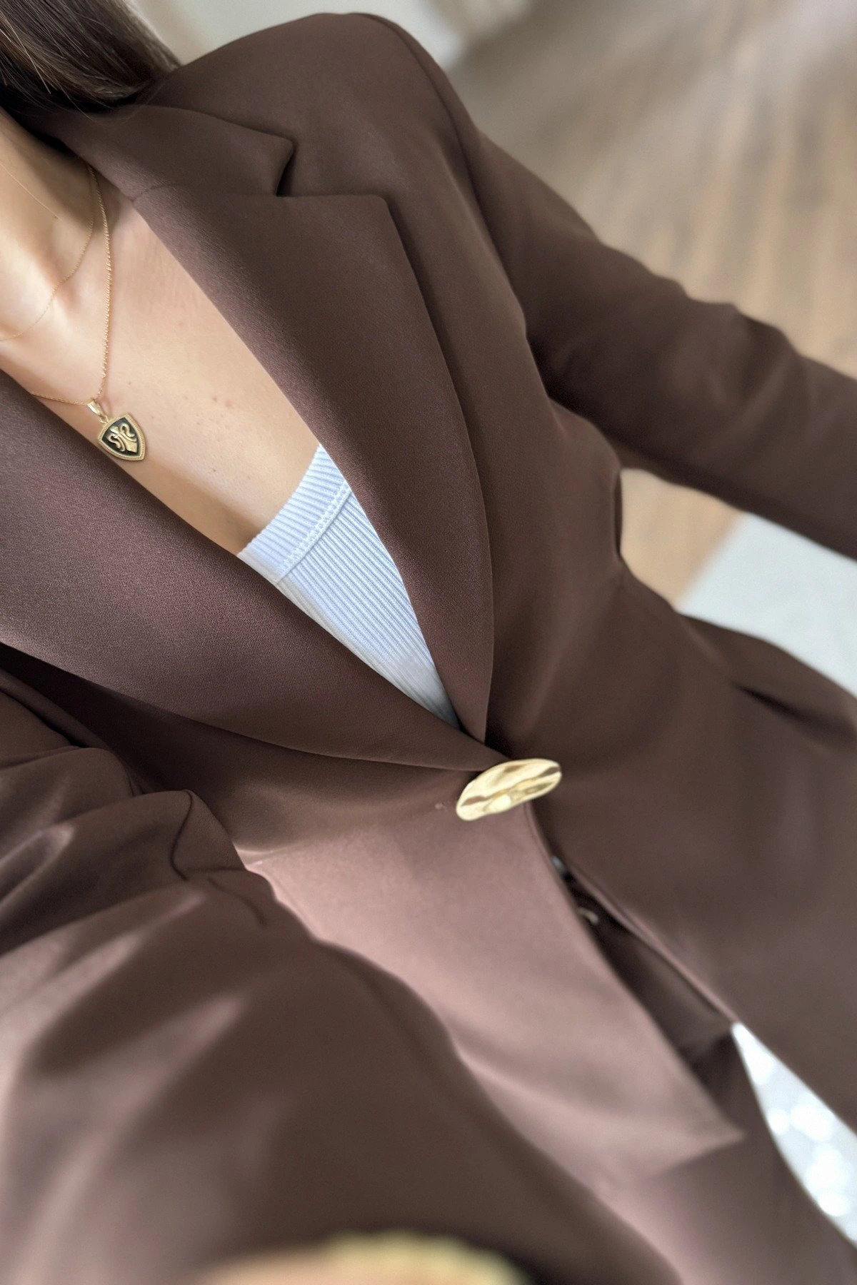 GOLD DÜĞME PİLE DETAY CEKET BOL PAÇA PANTOLON TAKIM – KAHVE