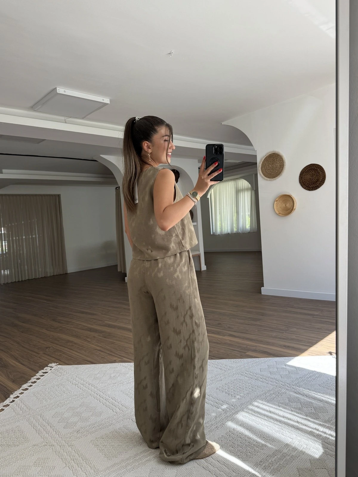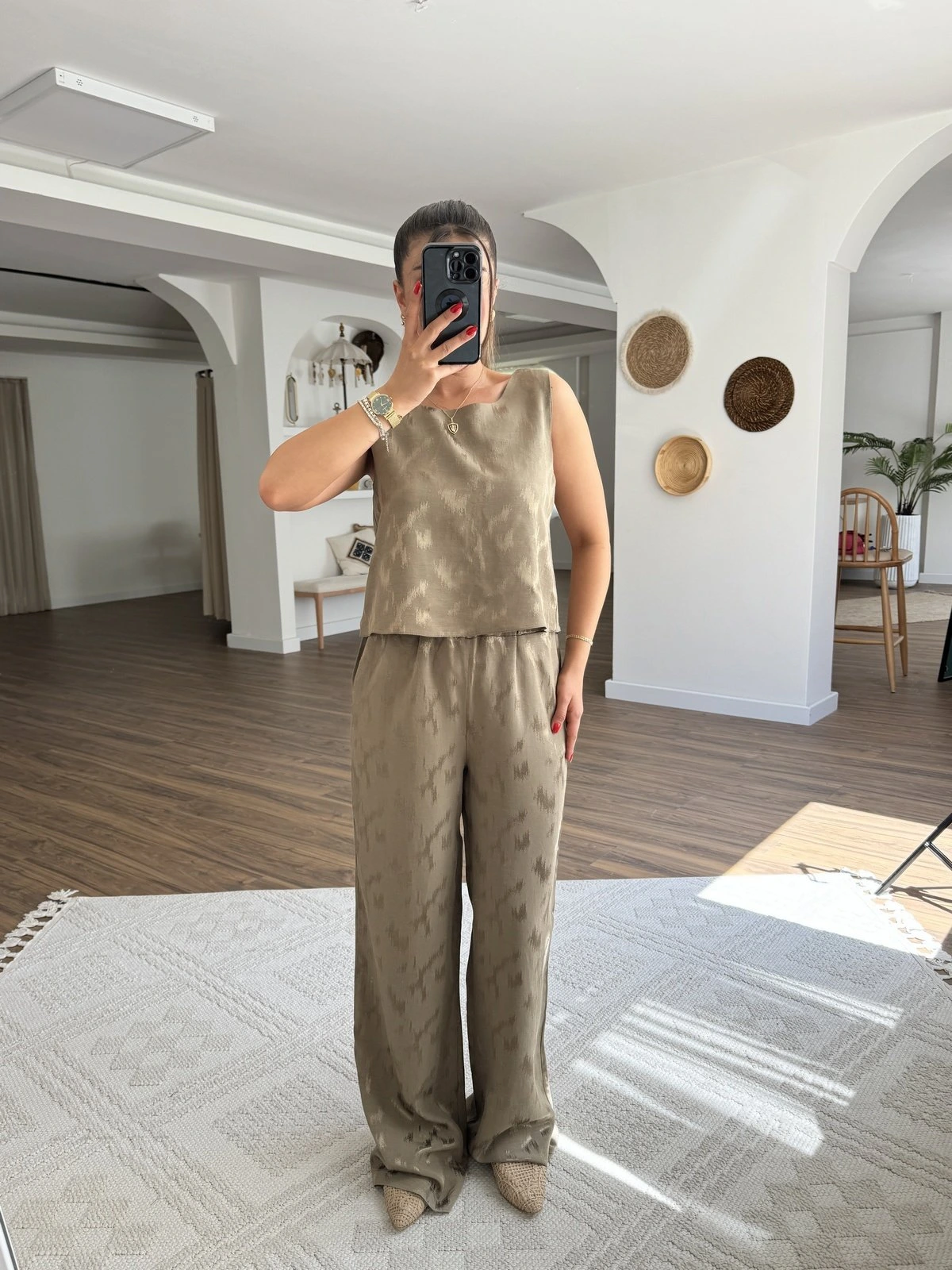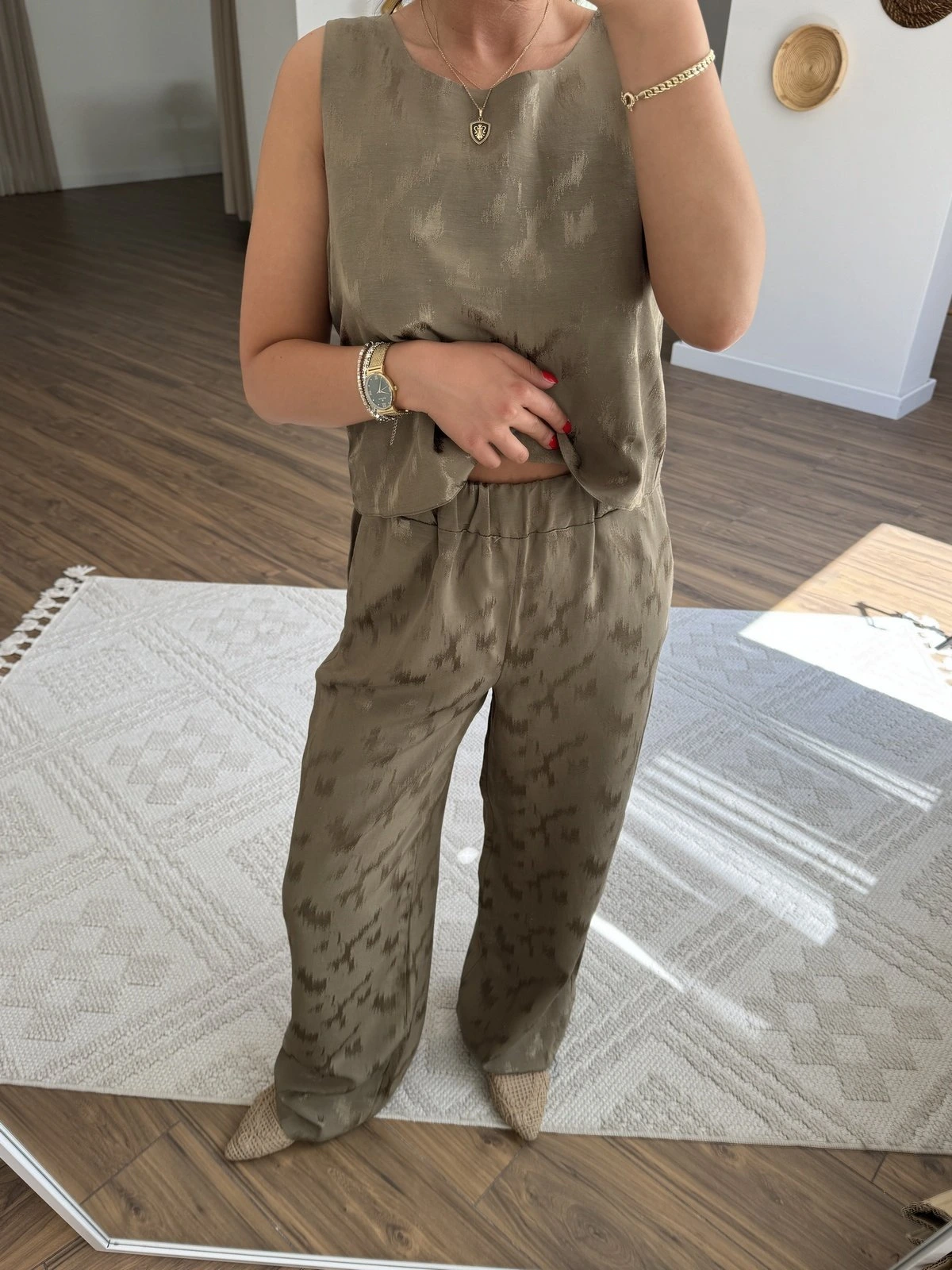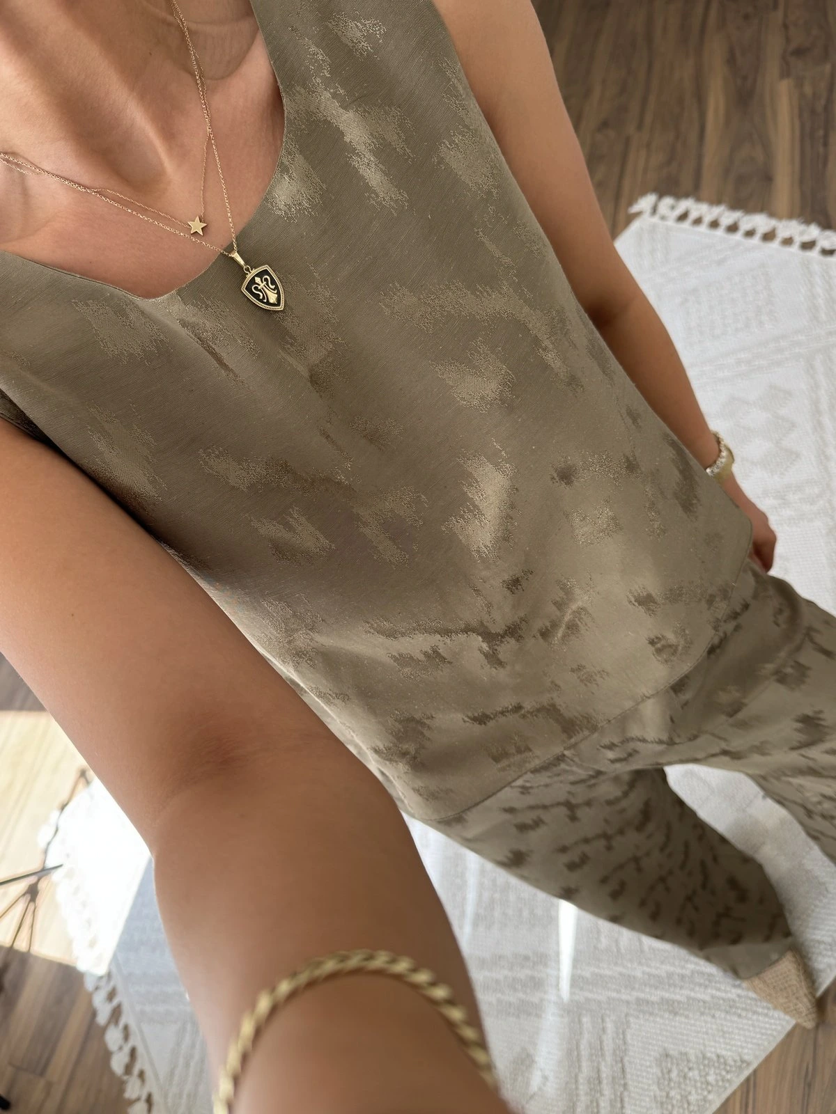 JAKAR DESENLİ SIFIR KOL VİSKON PAMUK BLUZ PANTOLON TAKIM – HAKİ