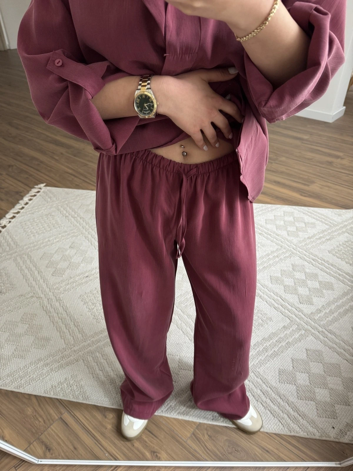 KAPAK DÜĞME V YAKA TENSEL GÖMLEK PANTOLON TAKIM – BORDO