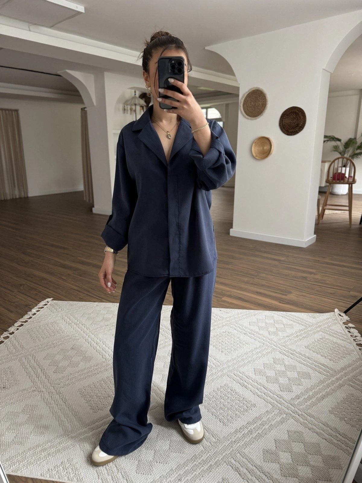 KAPAK DÜĞME V YAKA TENSEL GÖMLEK PANTOLON TAKIM – LACİVERT
