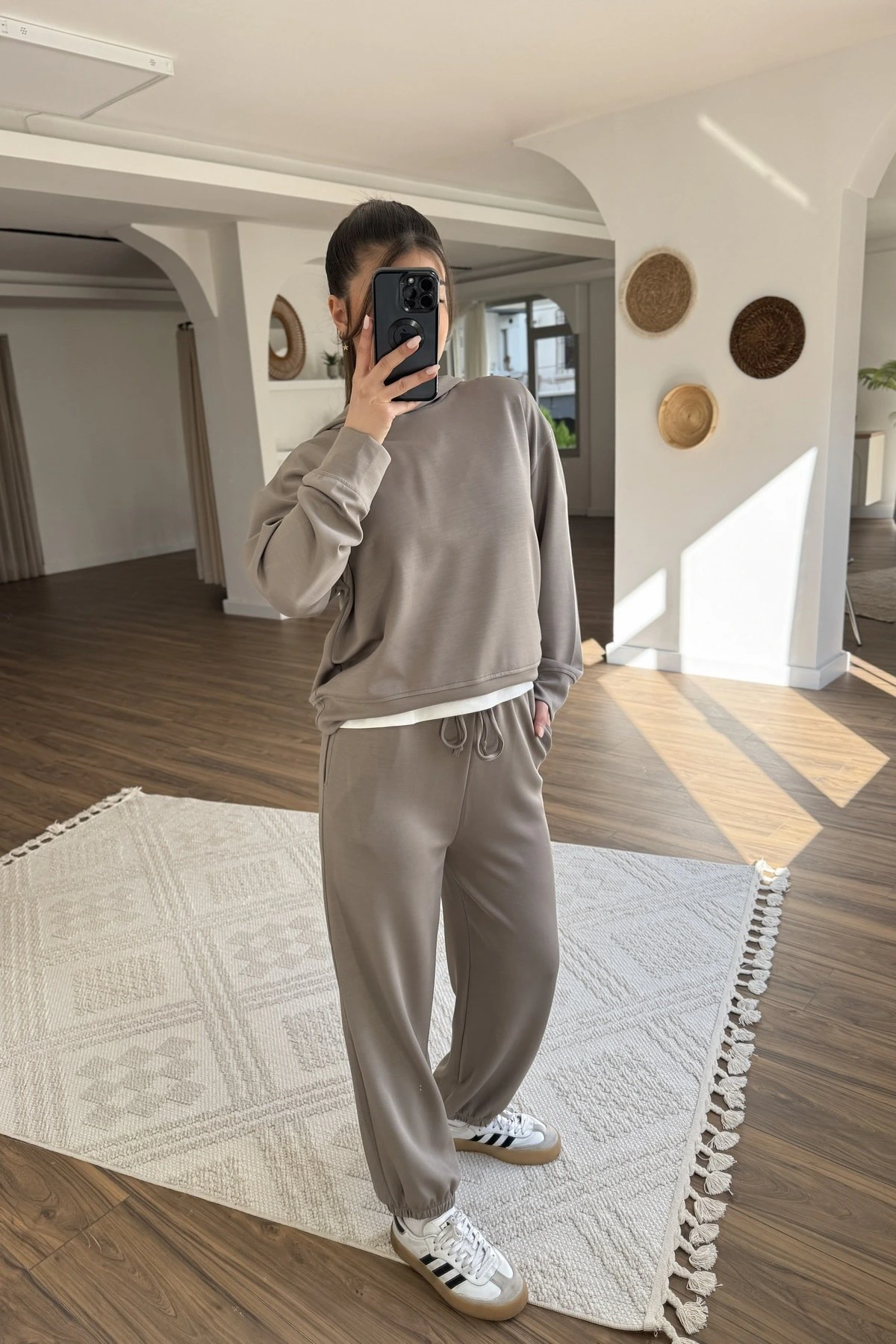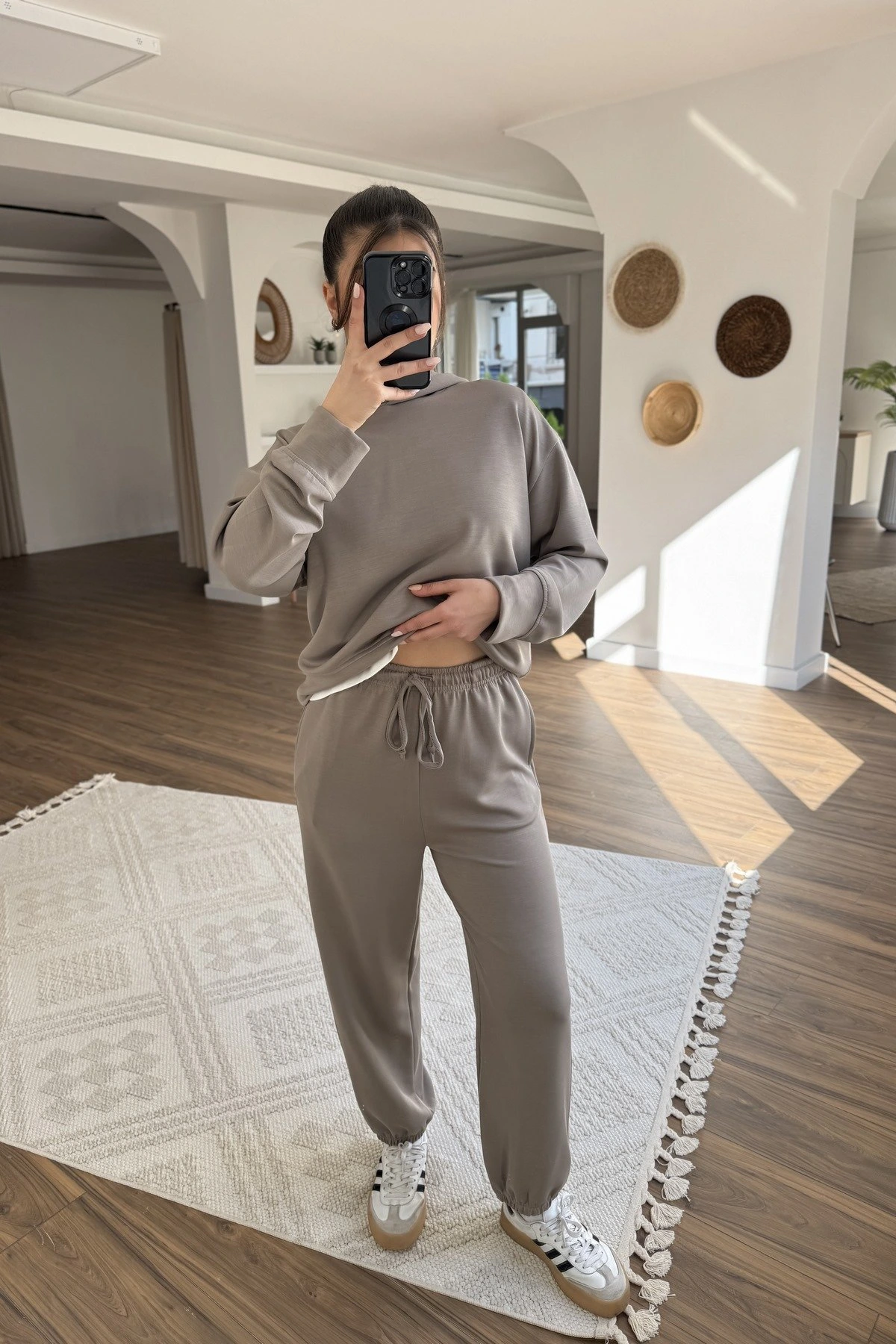 KAPÜŞONLU SWEAT BEL BİLEK LASTİK EŞOFMAN PAMUK TAKIM - FÜME