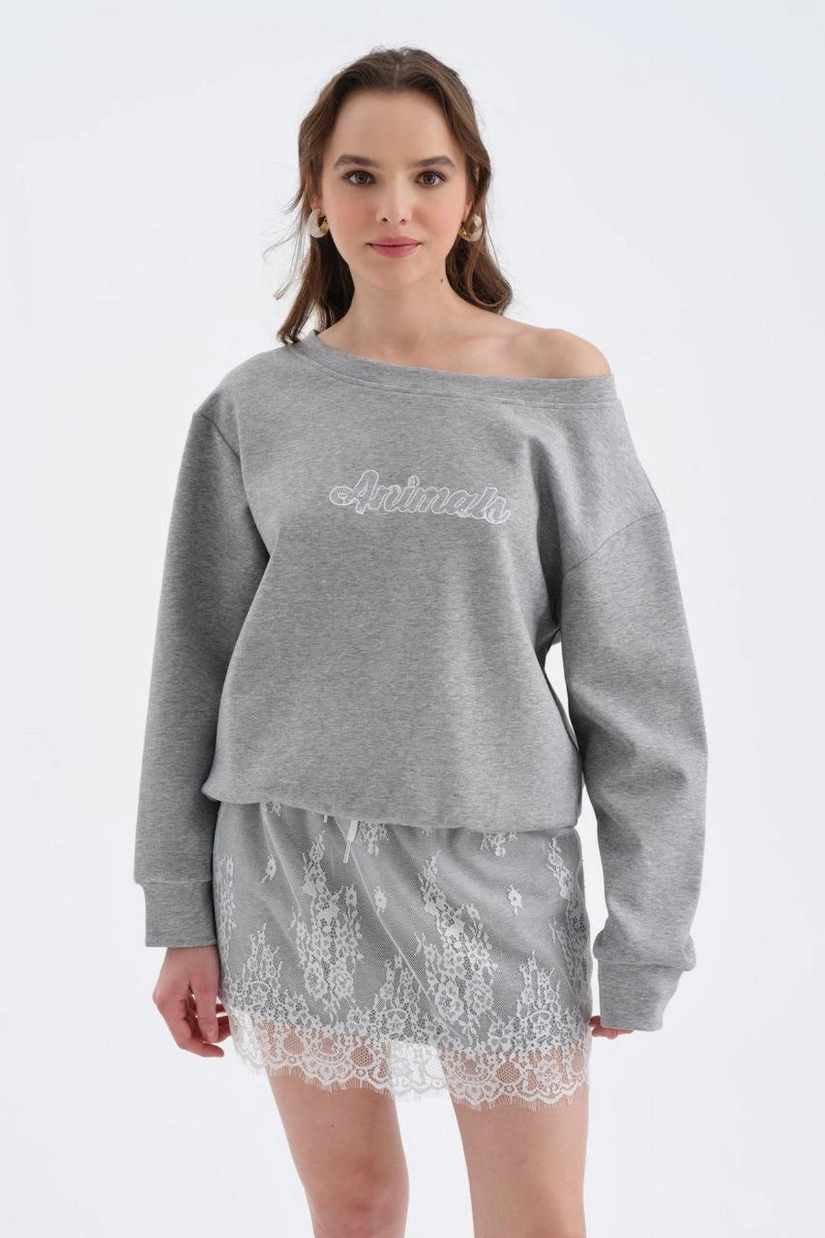 KAYIK YAKA ETEĞİ DANTEL KAT PAMUK SWEAT ETEK TAKIM – GRİ