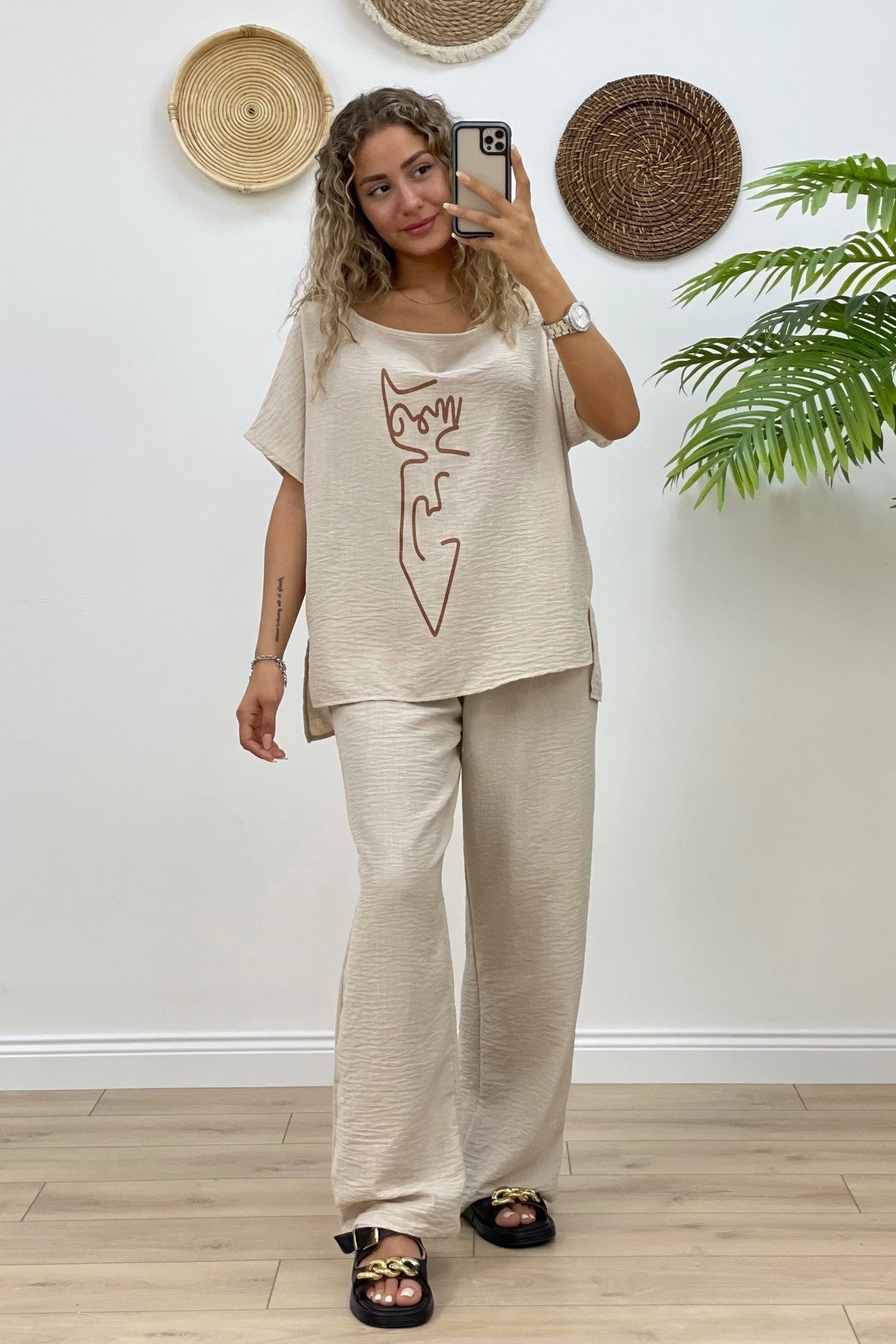 KEDİ BASKI SALAŞ BLUZ PANTOLON PAMUK TAKIM – TAŞ