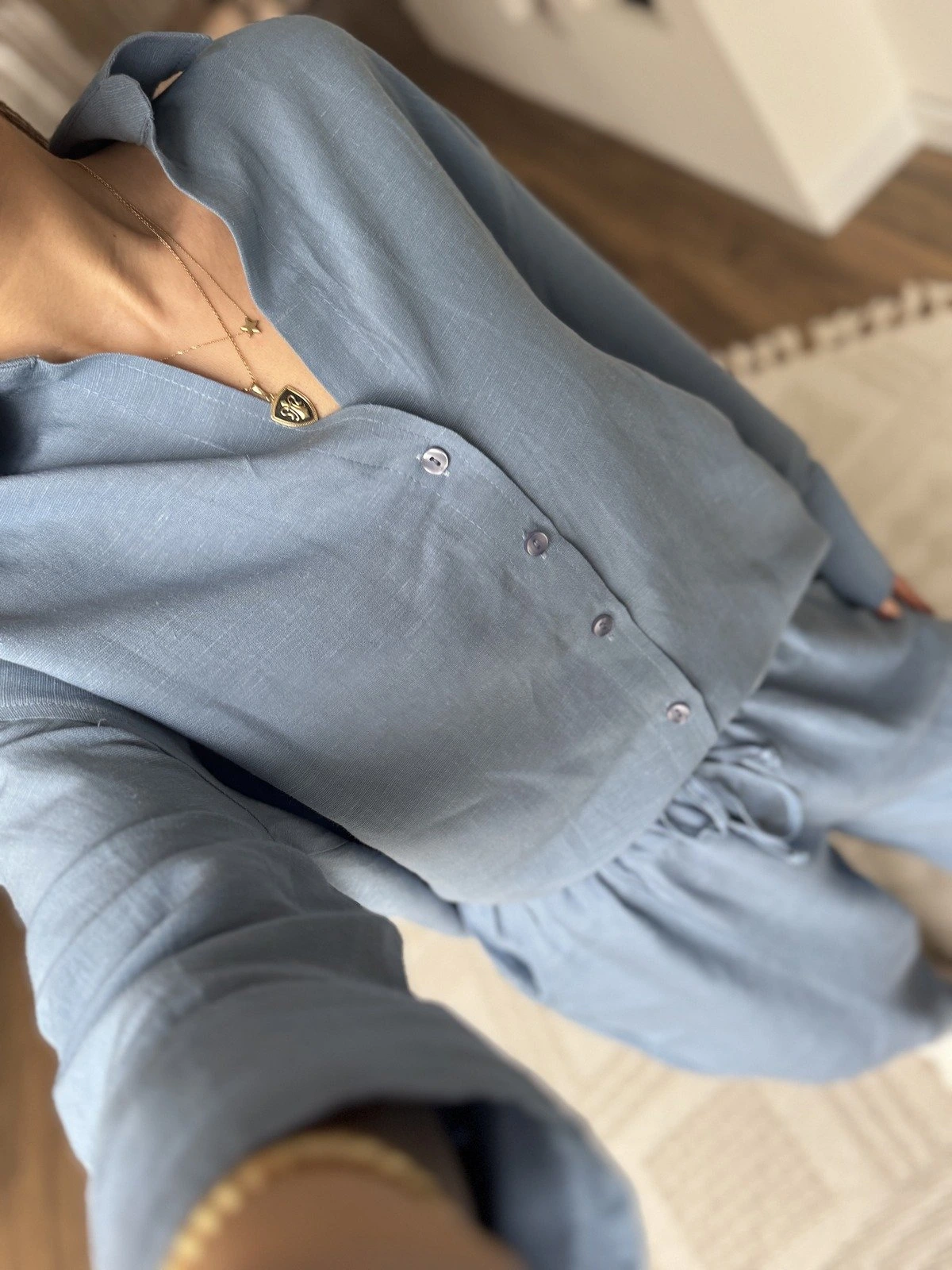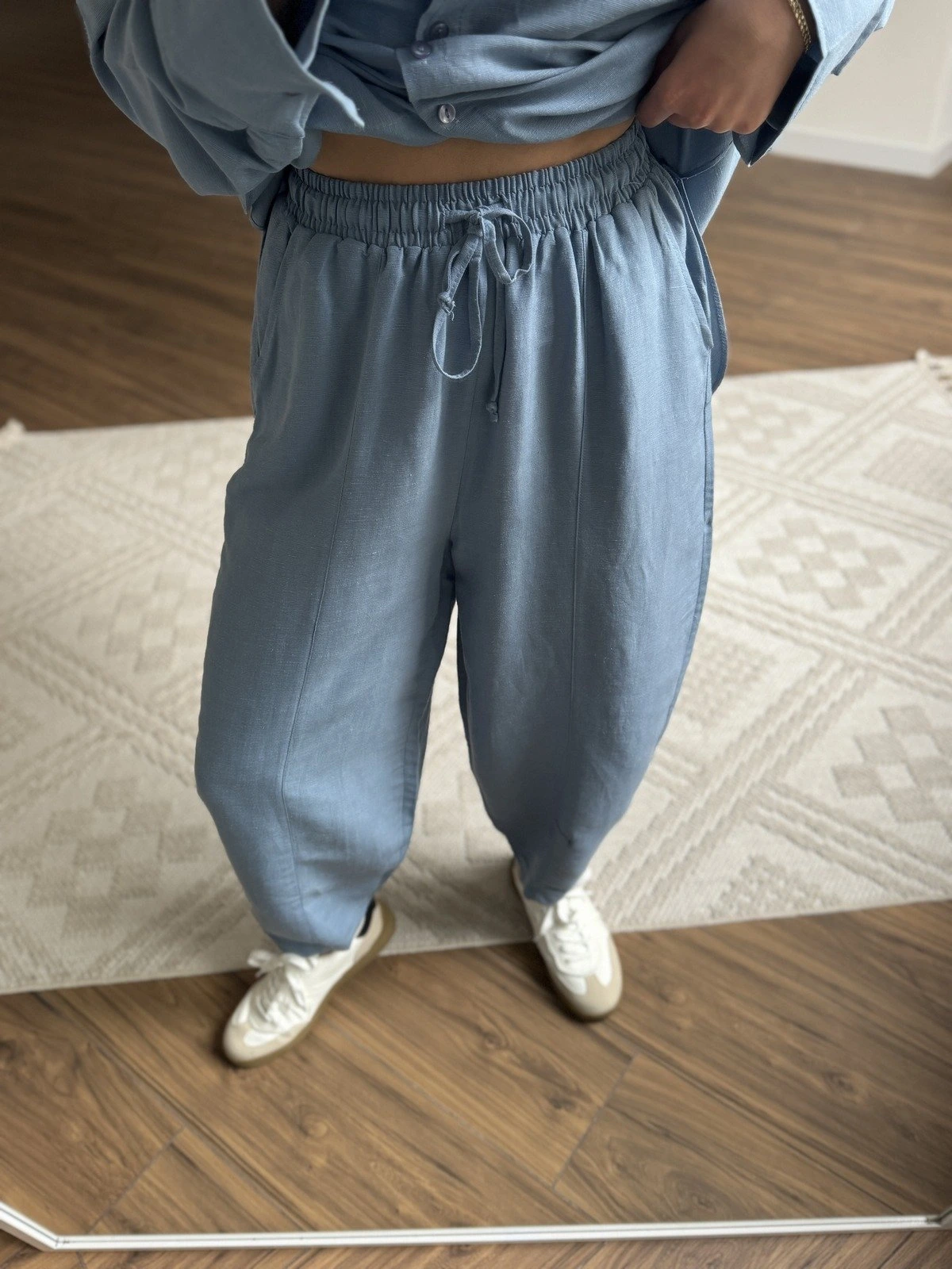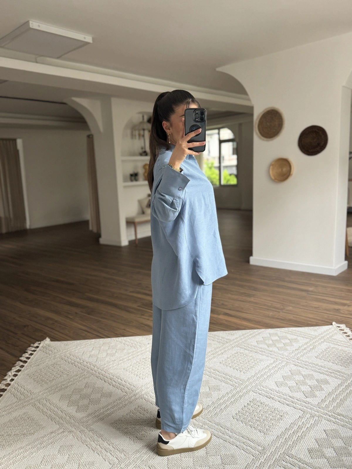 KETEN VİSKON GÖMLEK BALON PANTOLON TAKIM – MAVİ