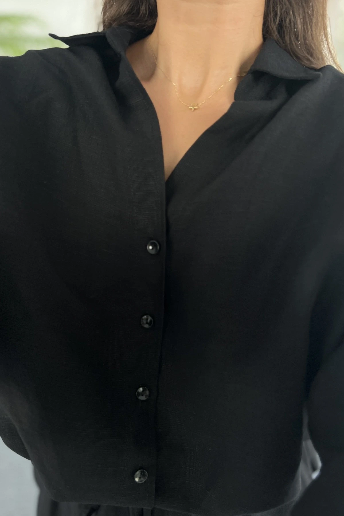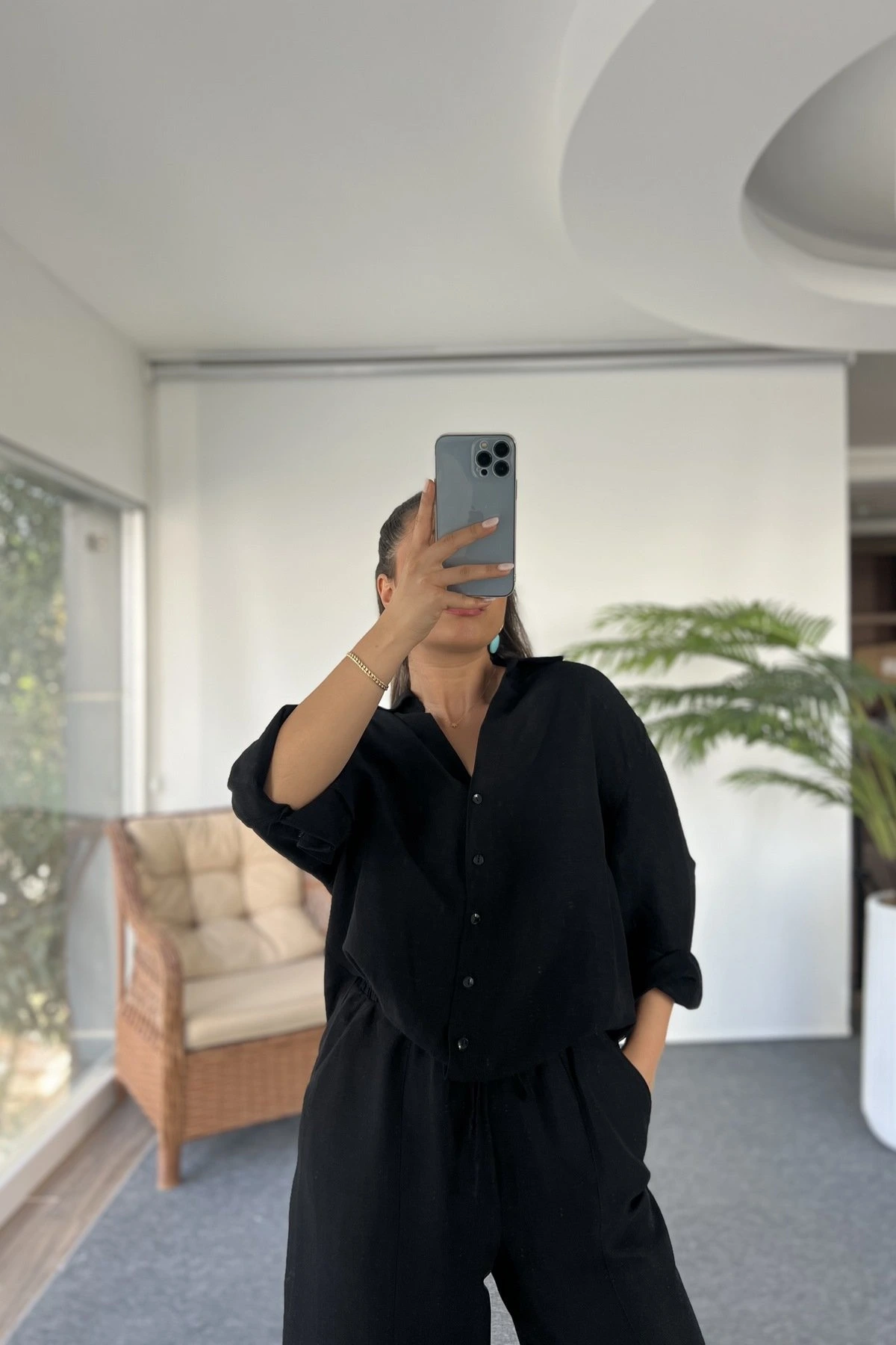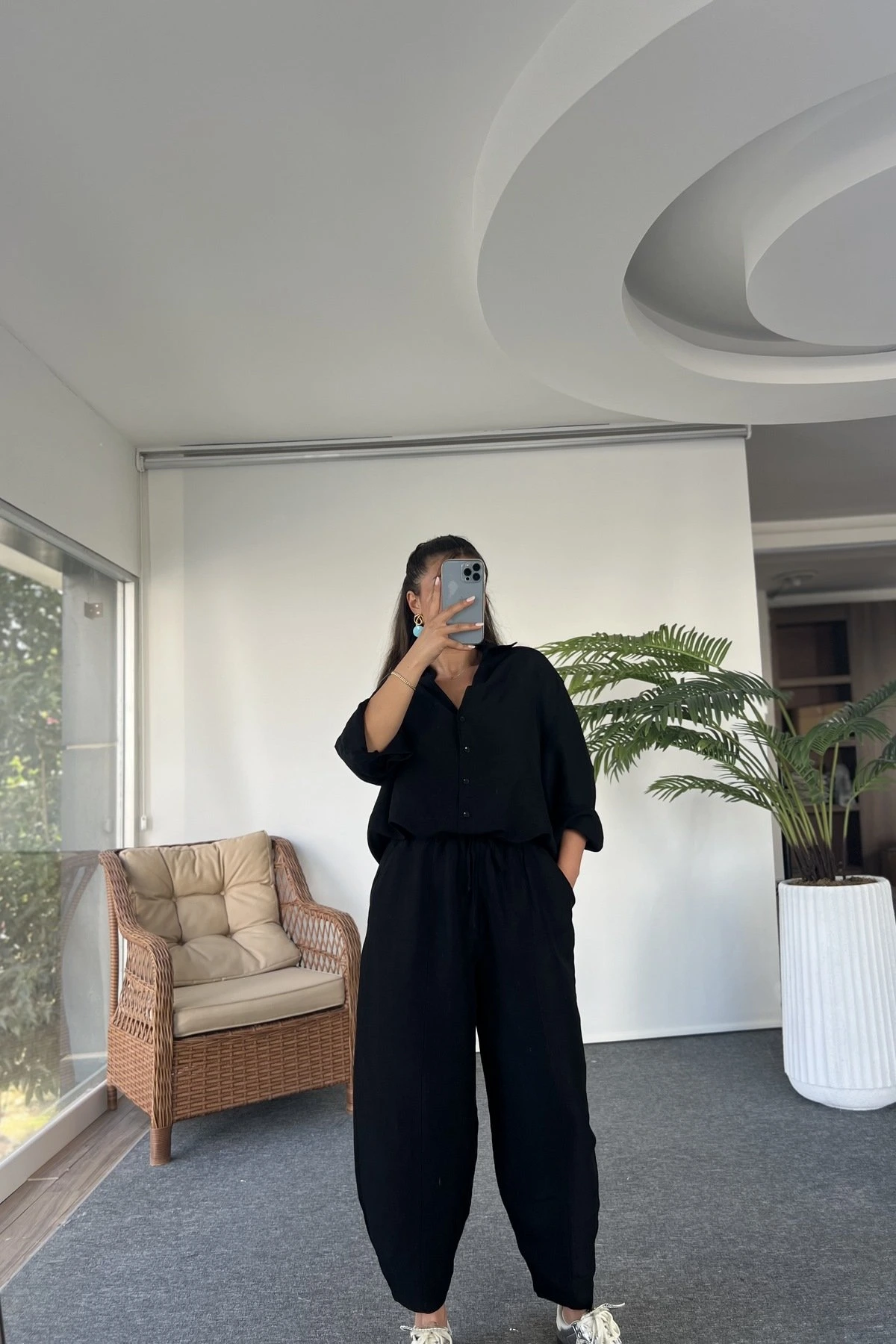 KETEN VİSKON GÖMLEK BALON PANTOLON TAKIM – SİYAH