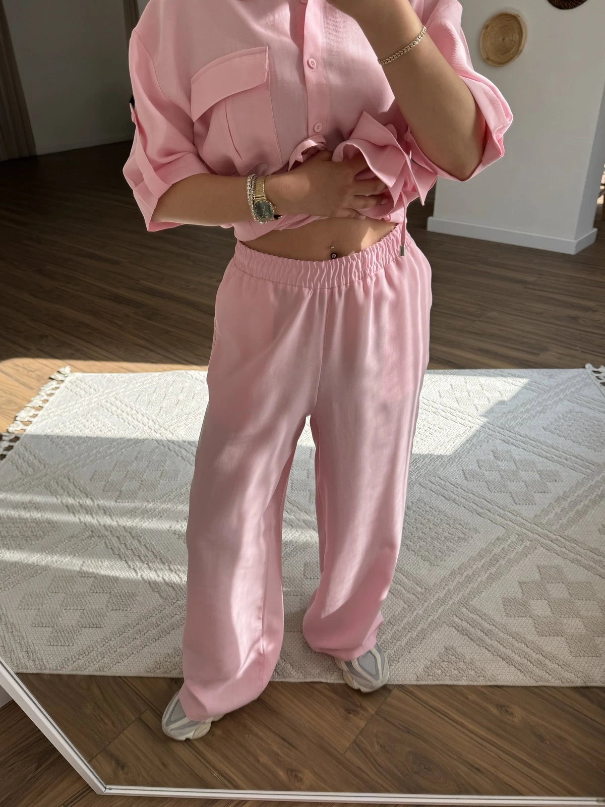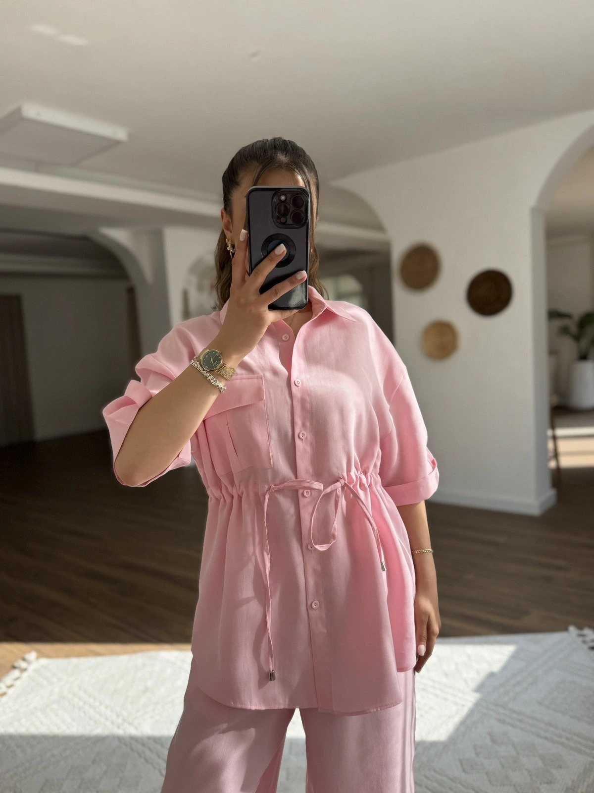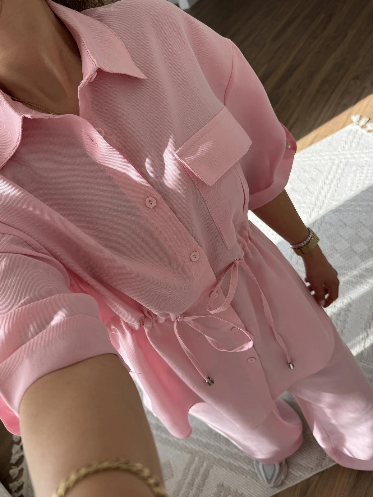 KISA KOL BEL BAĞCIKLI KOL KATLI VİSKON GÖMLEK PANTOLON TAKIM – PEMBE
