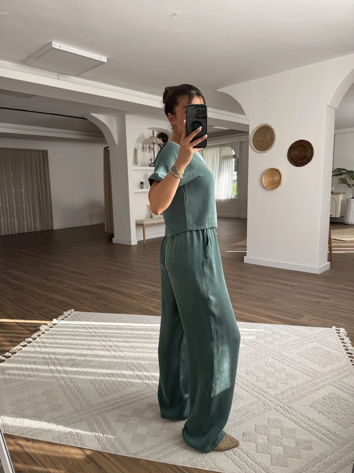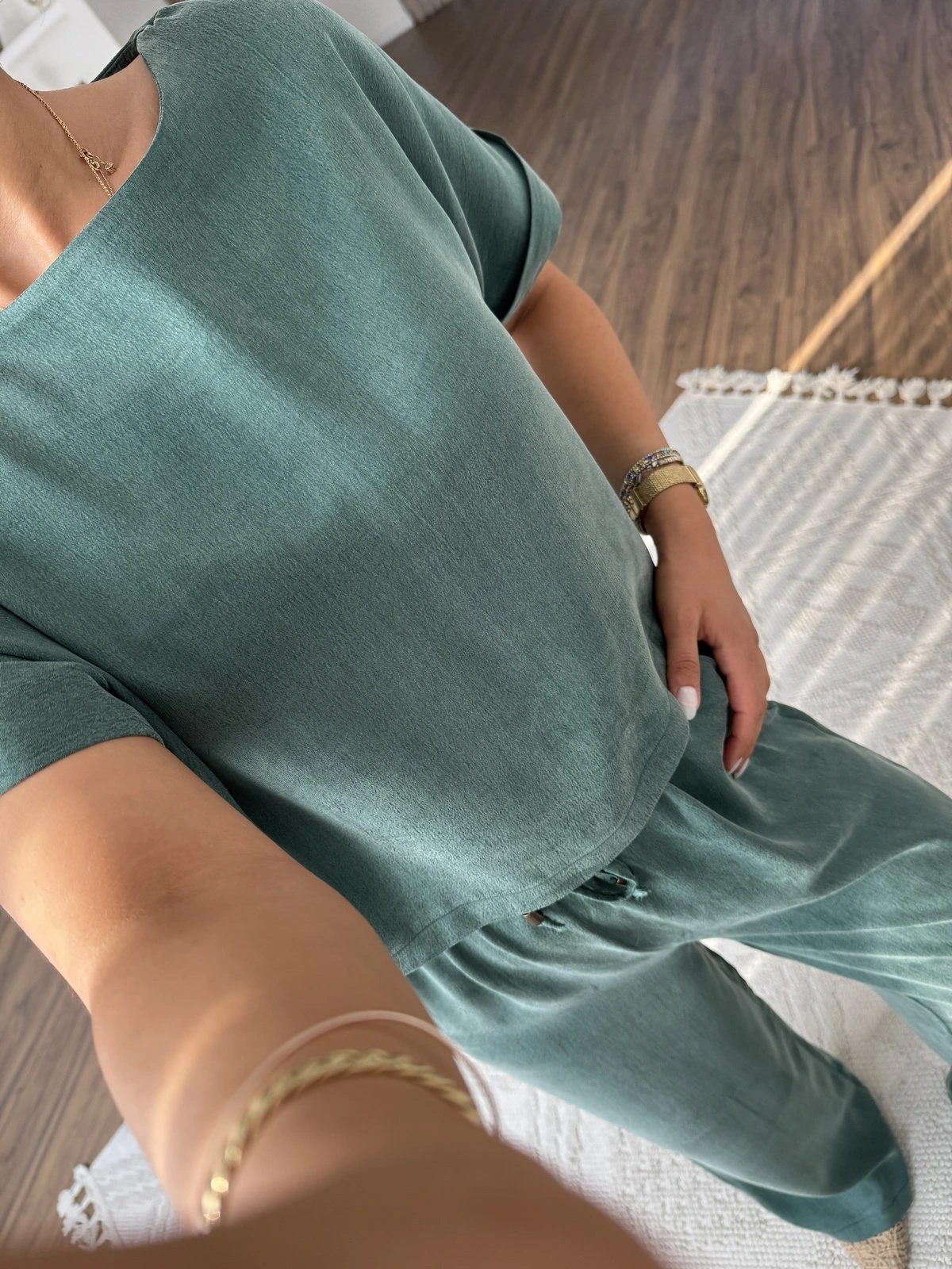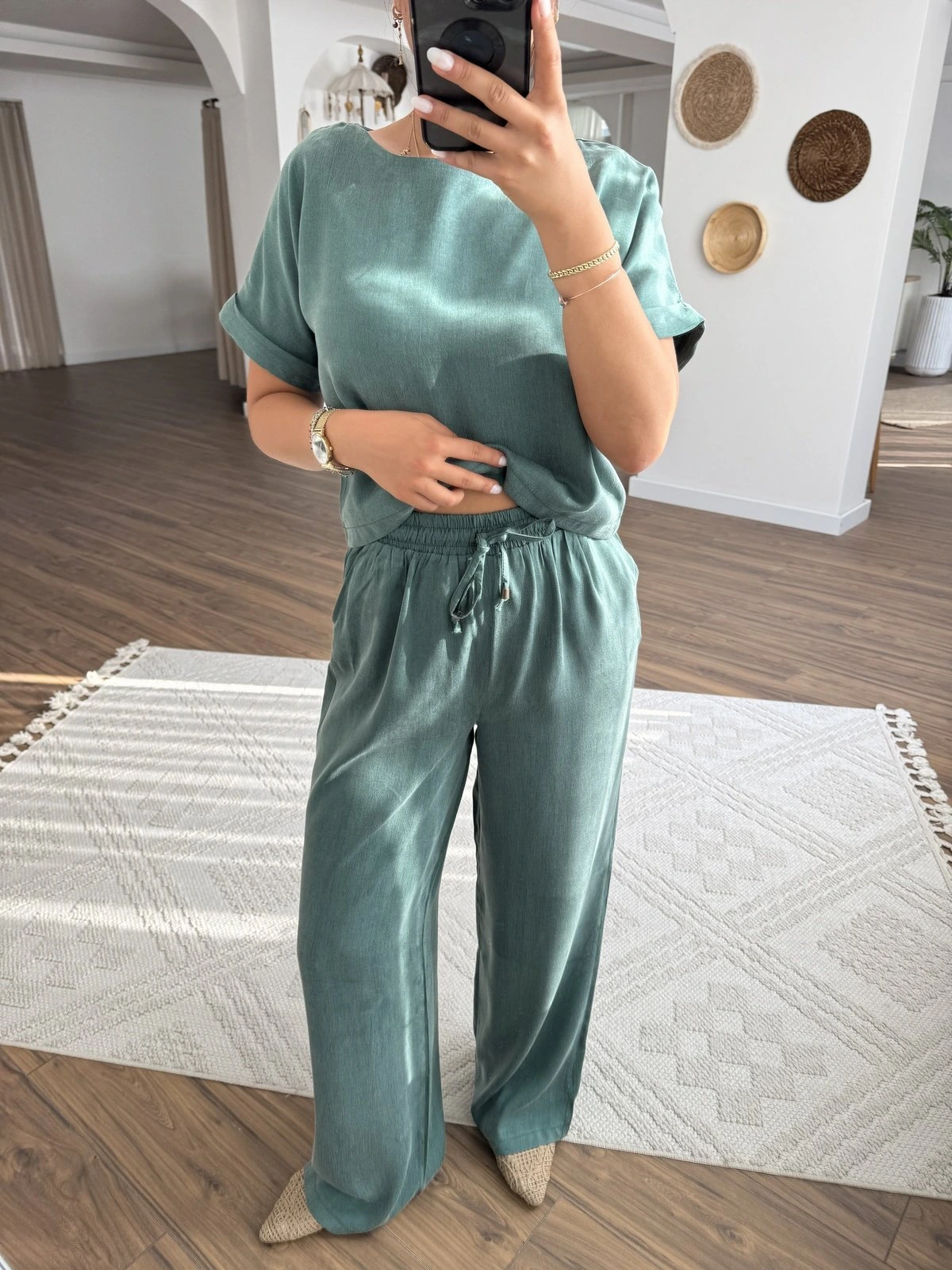 KISA KOL BLUZ BEL LASTİK PANTOLON PARLAK DOKU TAKIM – ZÜMRÜT YEŞİL