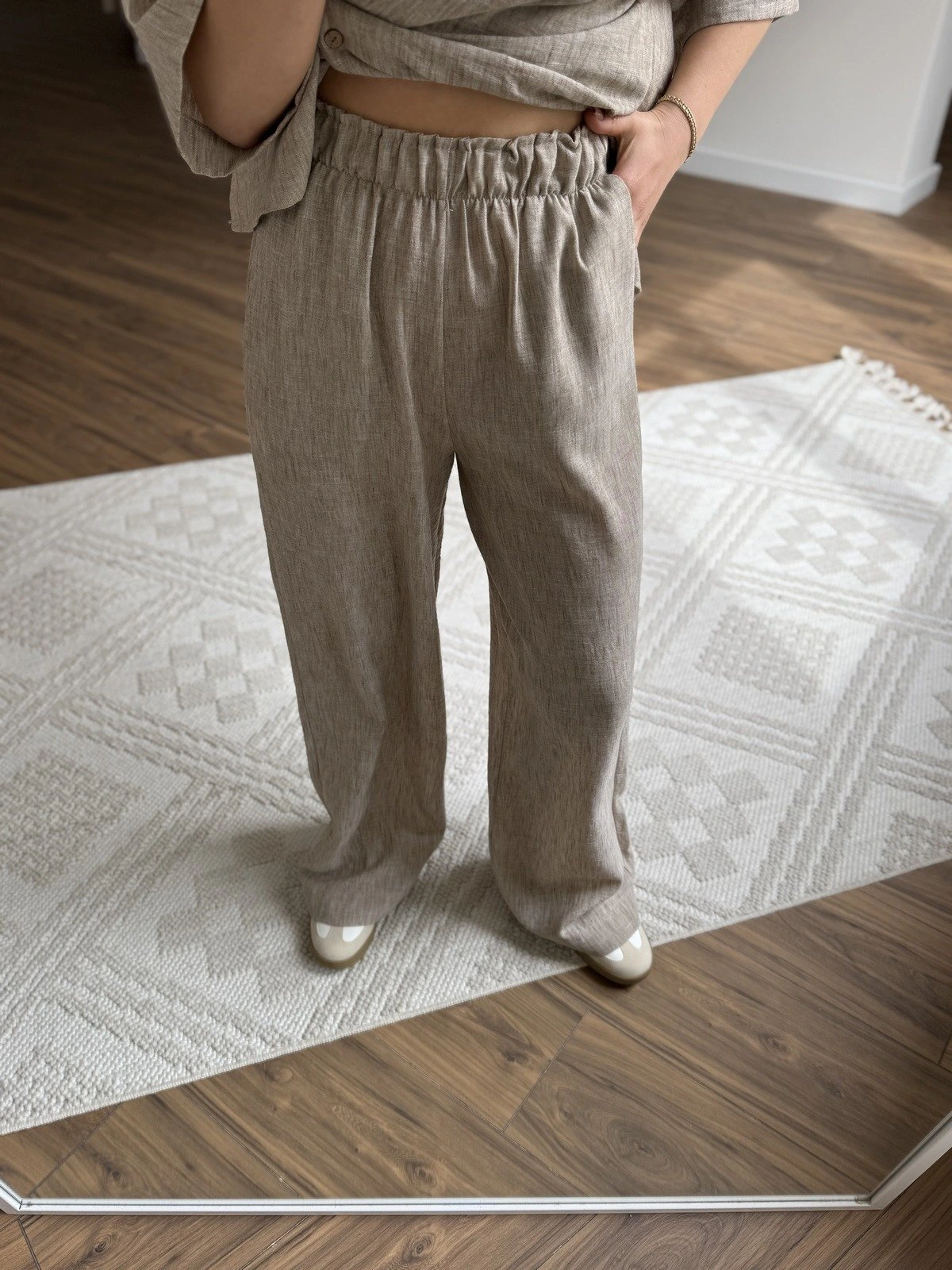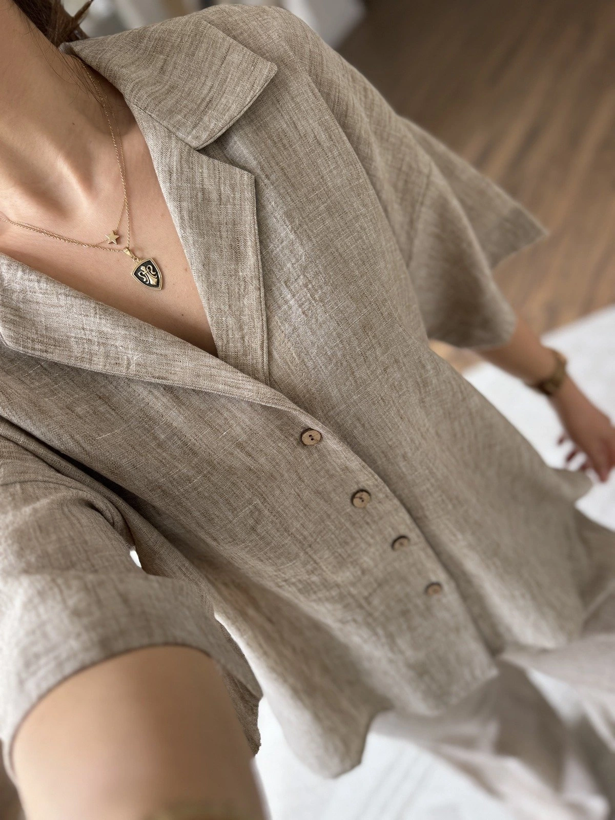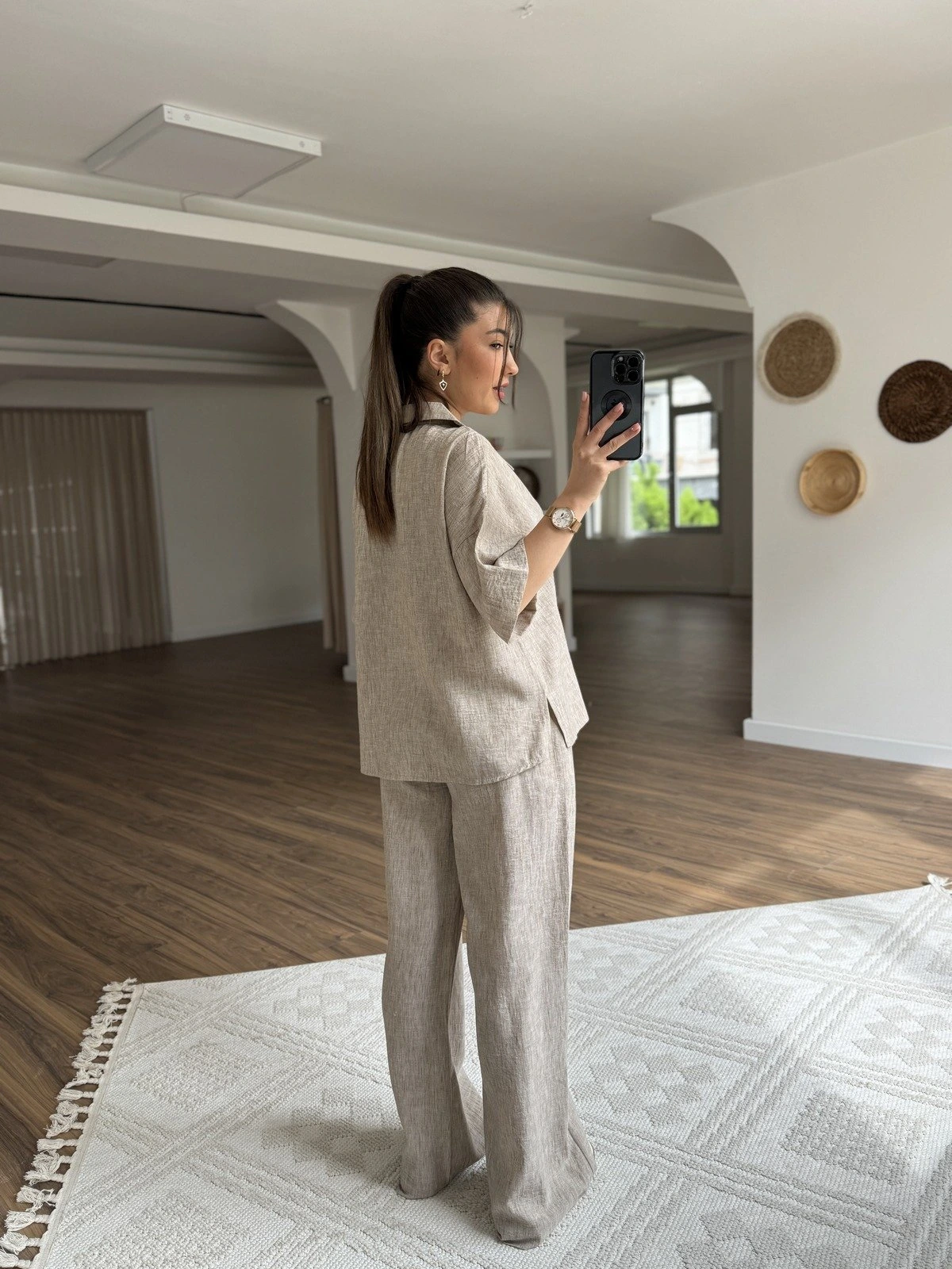 KISA KOL V YAKA SALAŞ GÖMLEK PANTOLON PAMUK KETEN TAKIM – CAMEL