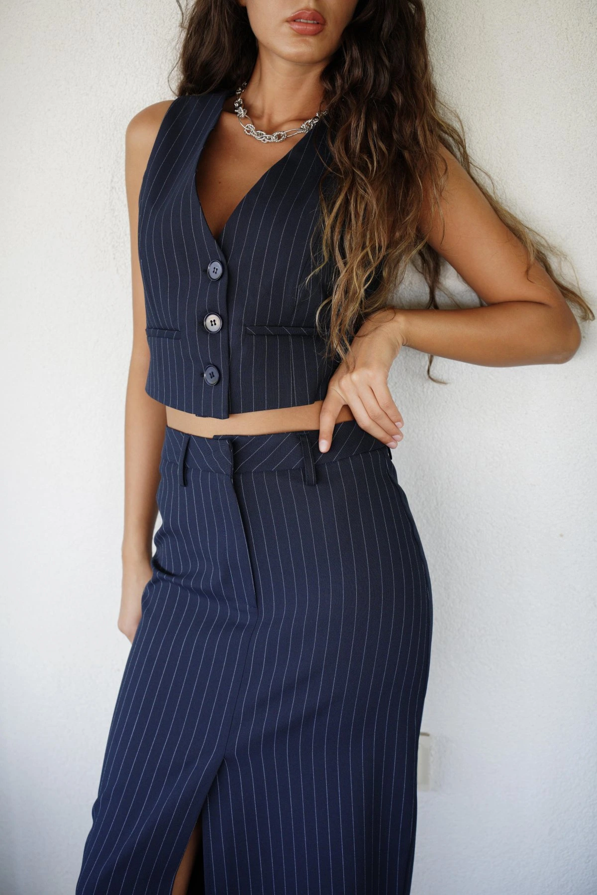 KISA MASKÜLEN YELEK ÖN YIRTMAÇ ÇİZGİLİ MİDİ ETEK TAKIM – LACİVERT