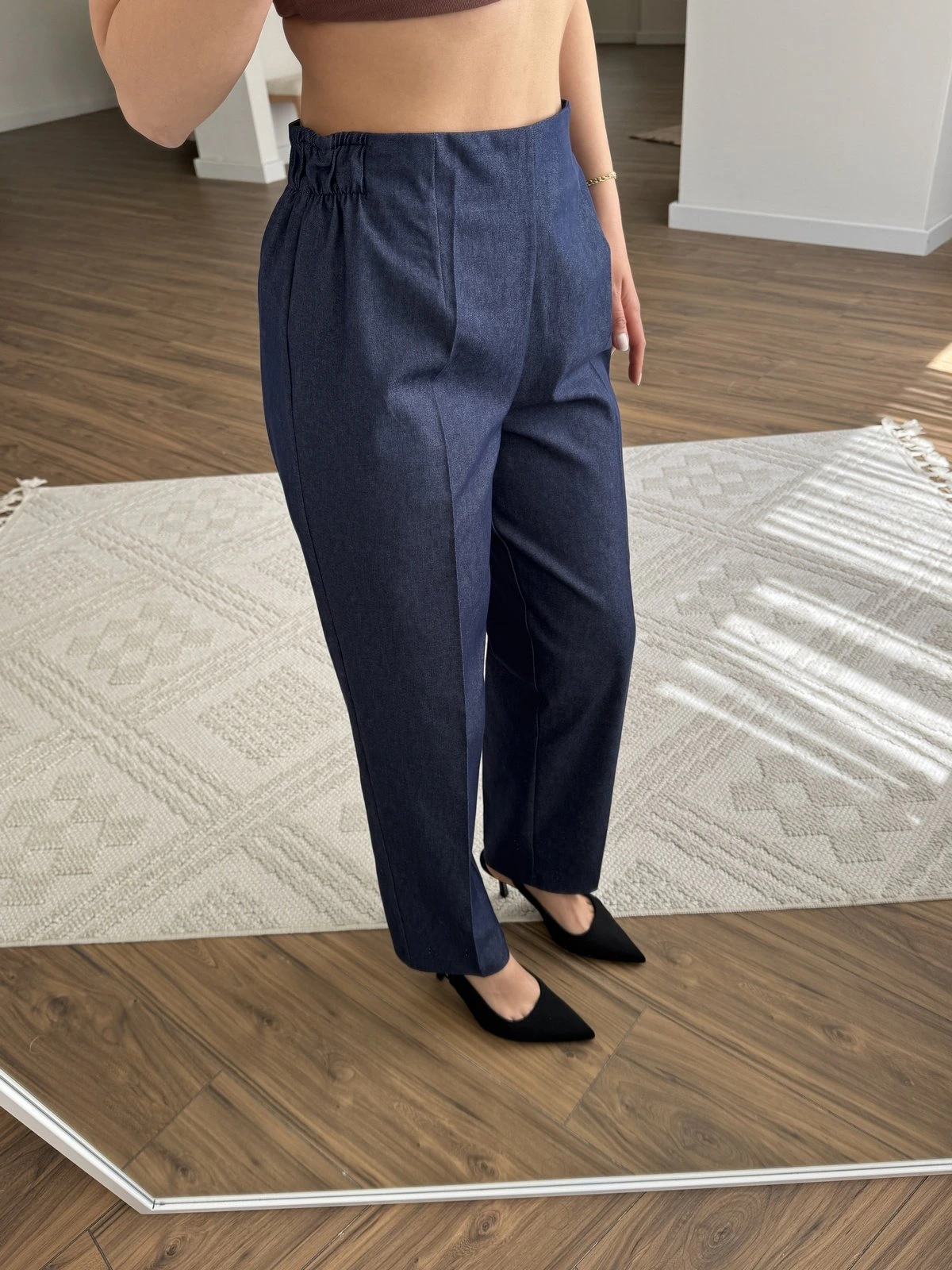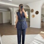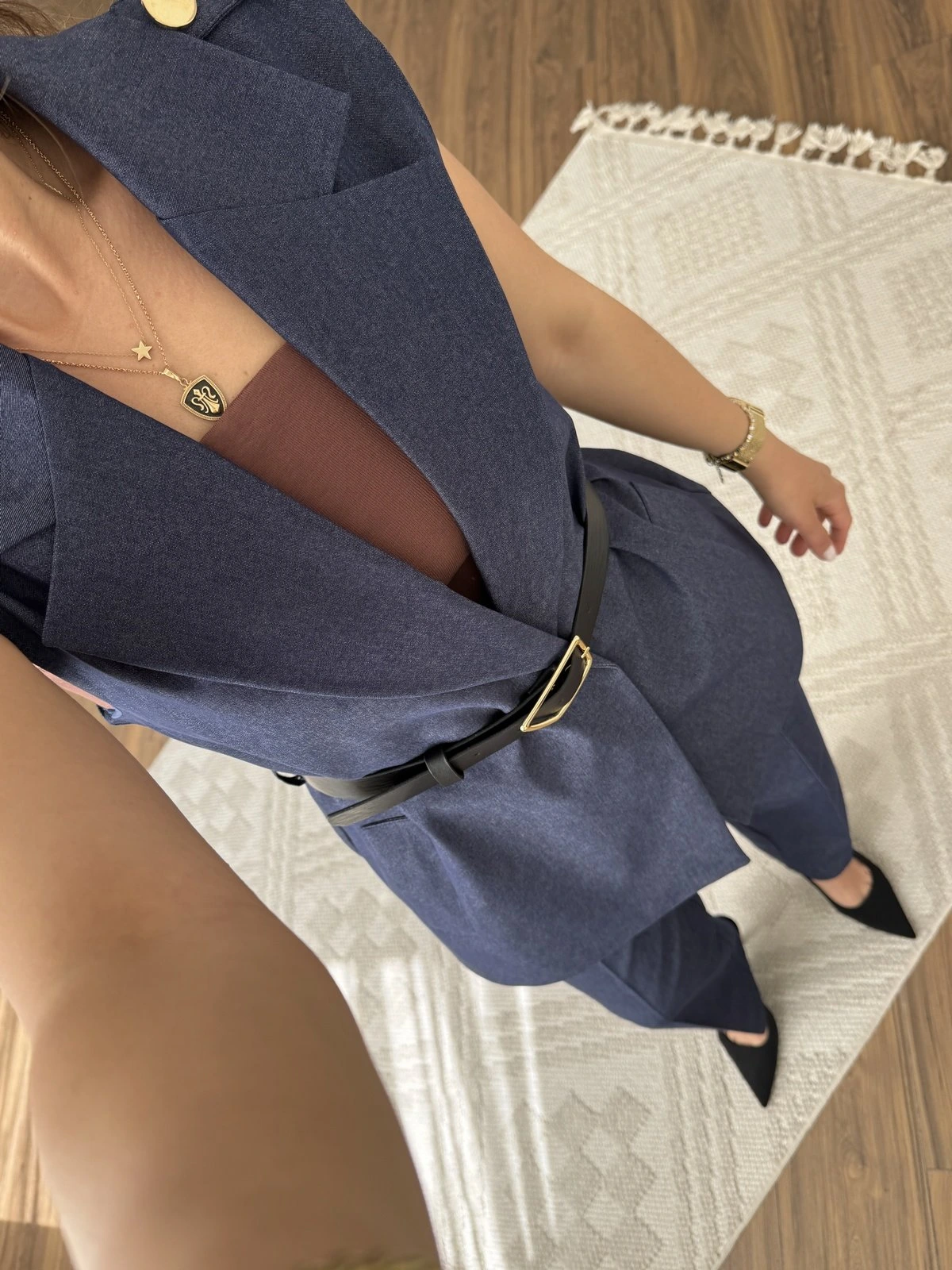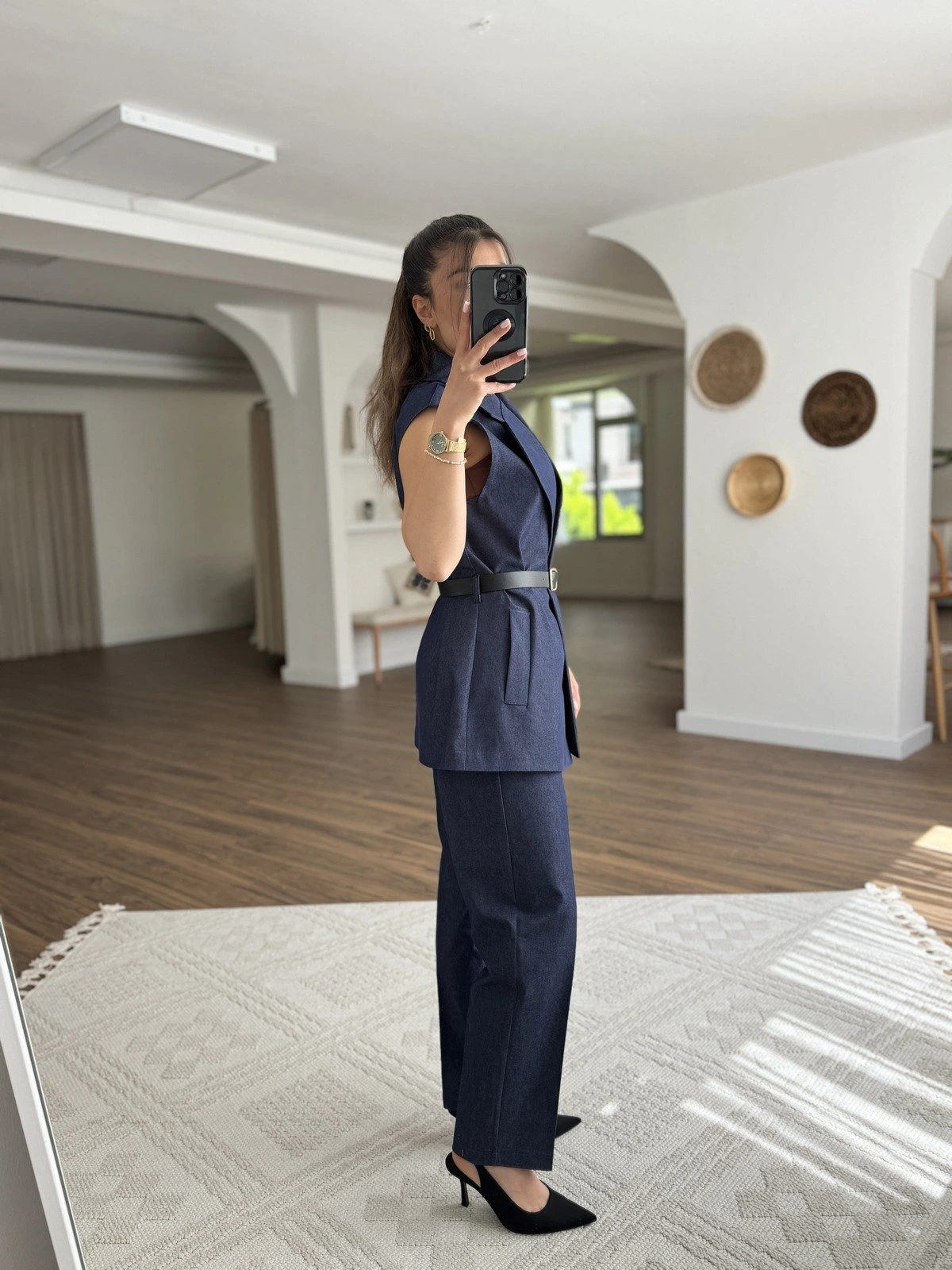 OMUZ APOLET KEMERLİ UZUN YELEK PANTOLON PAMUK TAKIM – İNDİGO