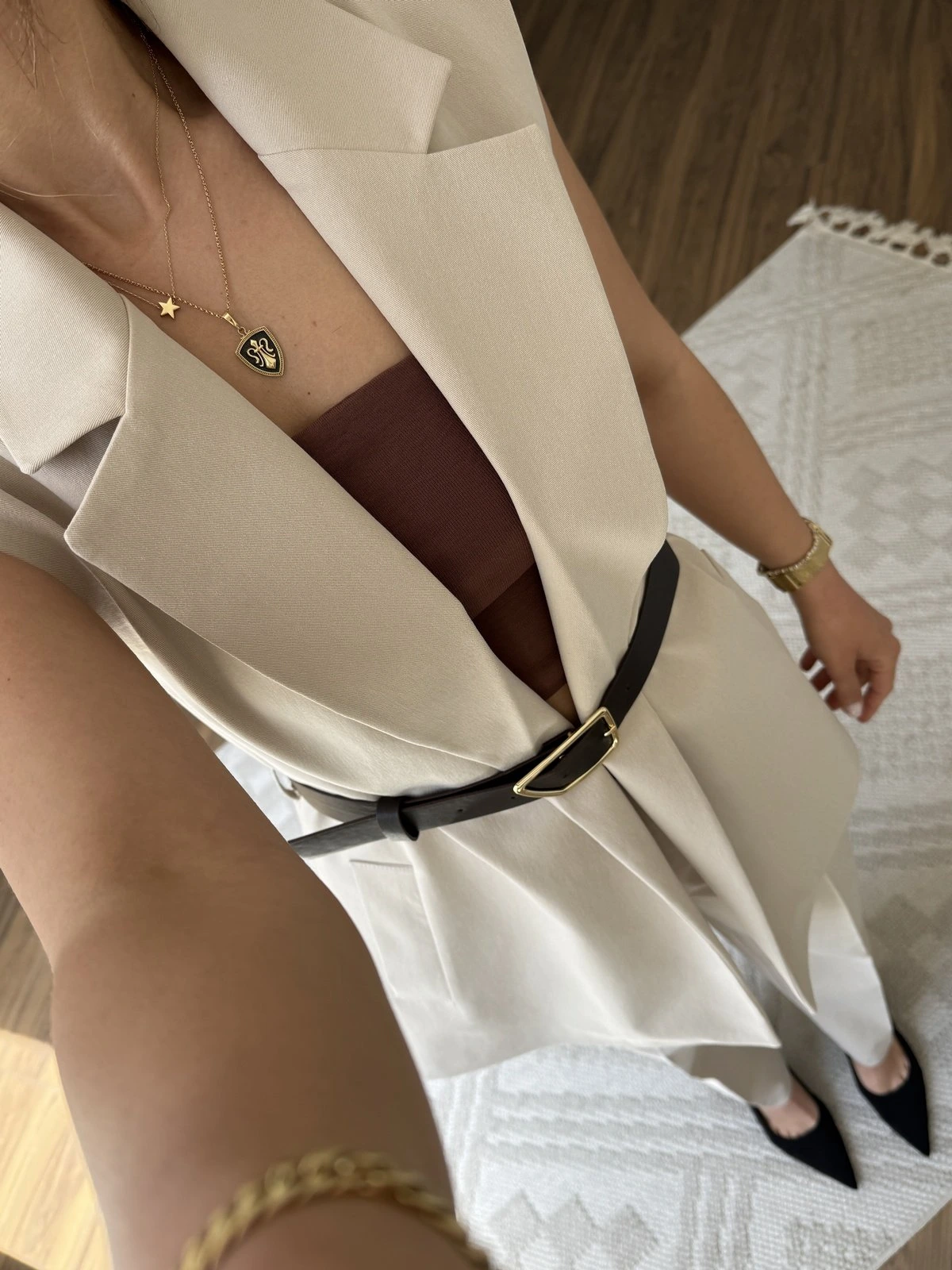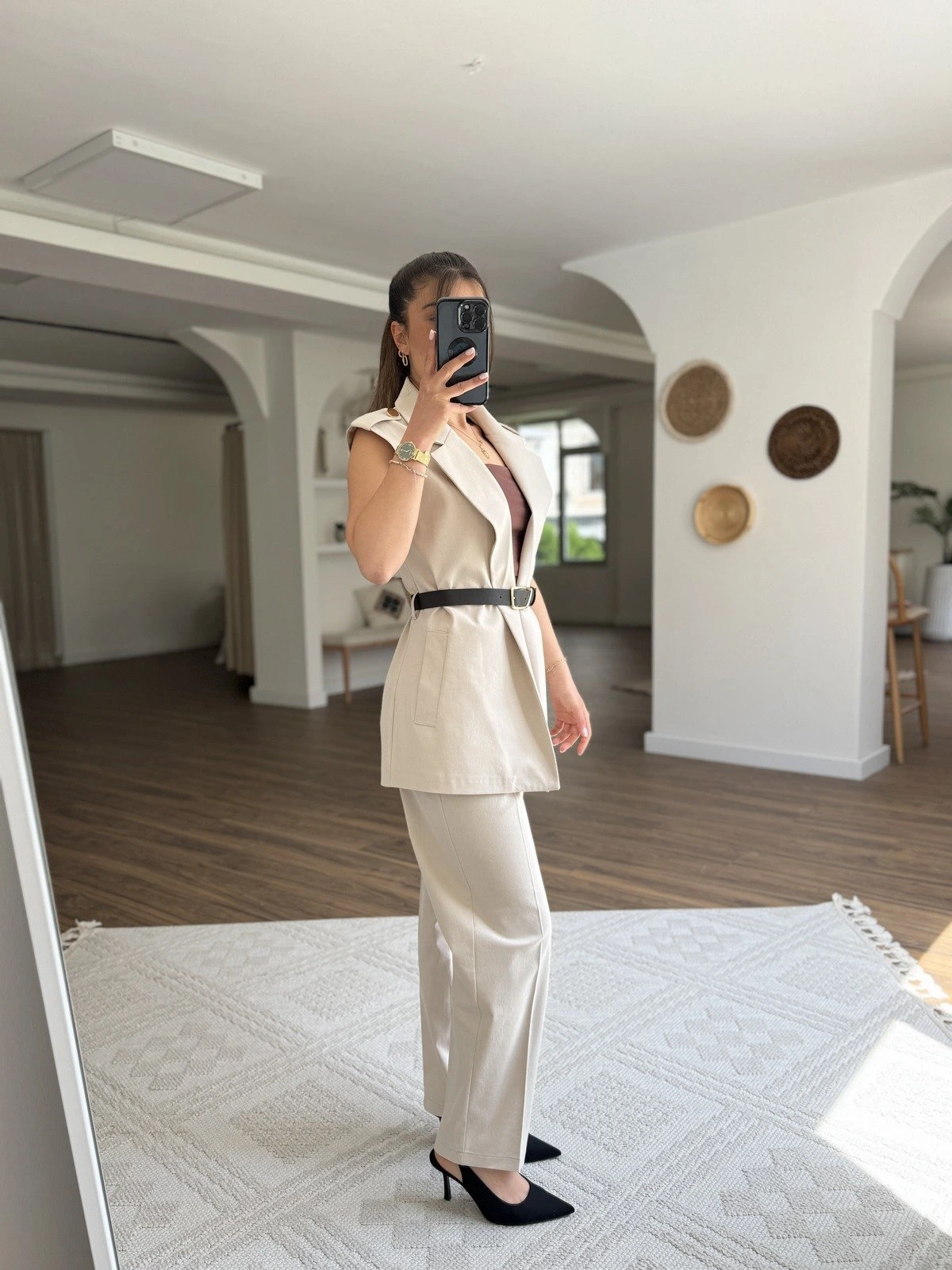 OMUZ APOLET KEMERLİ UZUN YELEK PANTOLON PAMUK TAKIM – TAŞ