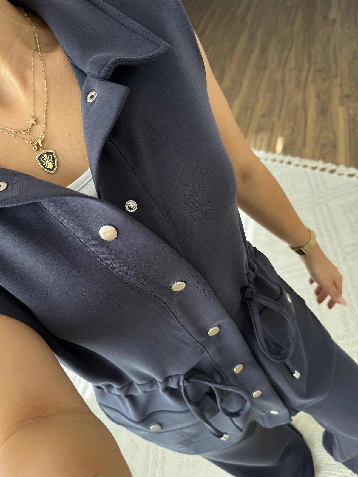 OYSHO KUMAŞ BEL BÜZGÜ CEPLİ ÇITÇITLI YELEK PANTOLON TAKIM – LACİVERT