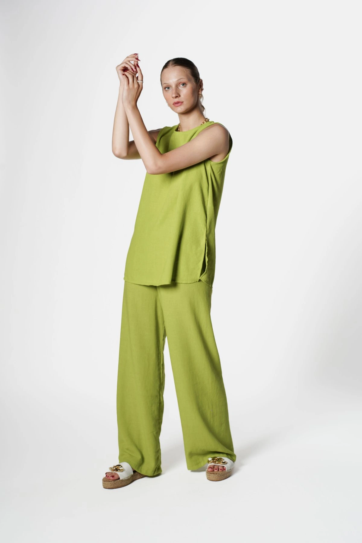 SIFIR KOL ENSE PENCERE BLUZ+ BOL PAÇA PANTOLON TAKIM – OLİVE
